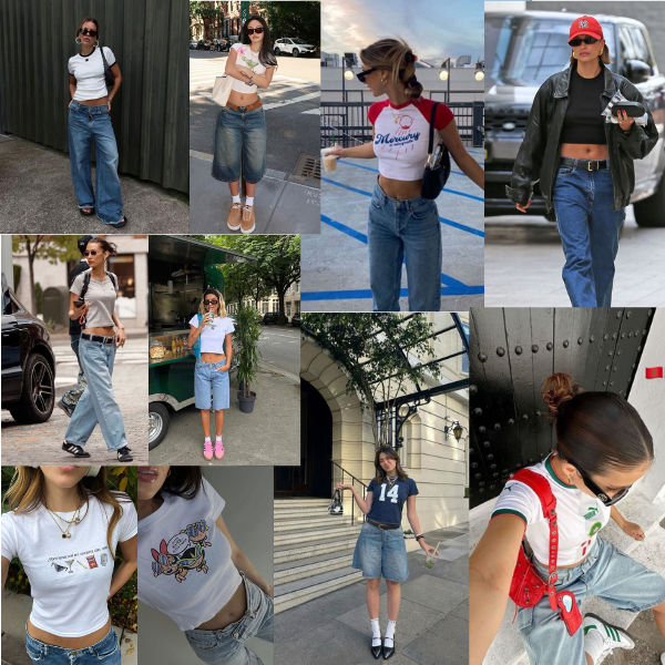 Já as propostas de looks estão vindo na sua maioria com a parte de baixa em cintura média ou baixa. Use com muito jeans, bermudões (jorts) ou calças mais larguinhas.