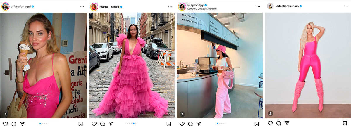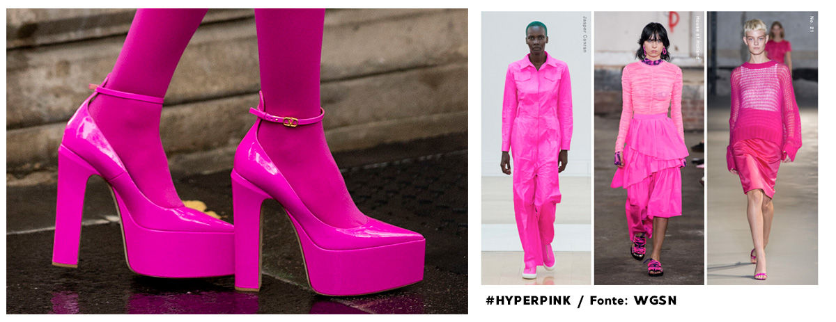 A cor rosa vibrante que é a característica mais forte da Barbie Core, foi nomeada como Hyperpink pelo WGSN e esse tom também apareceu como tendência em grandes marcas como Maison Valentino e Balenciaga.
