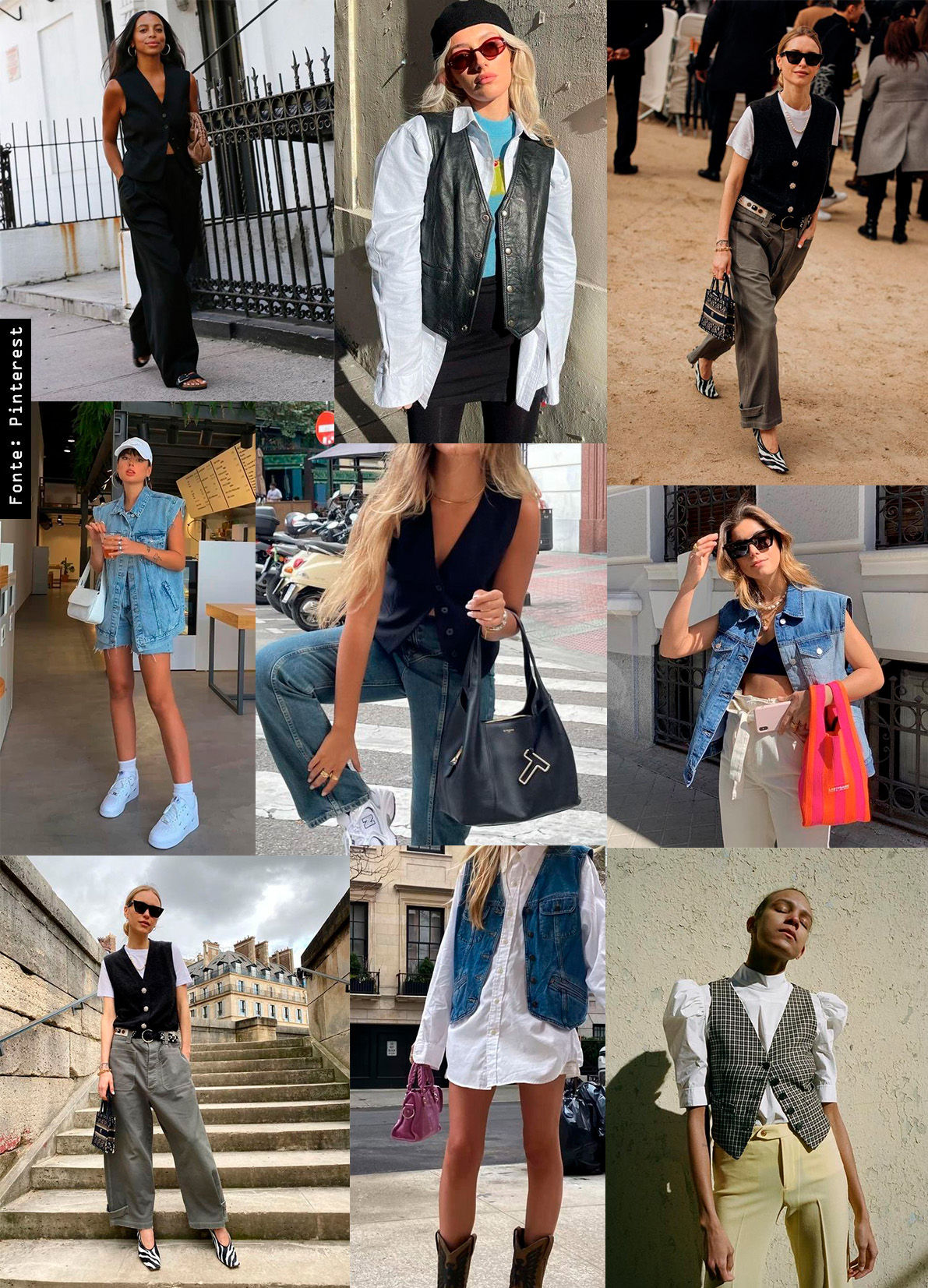 De várias modelagens e tecidos diferentes, os coletes aparecem bem pequenos, oversized, em jeans ou em alfaiataria! Eles podem compor looks mais elegantes ou mais despojados, com uma vibe bem streetwear!