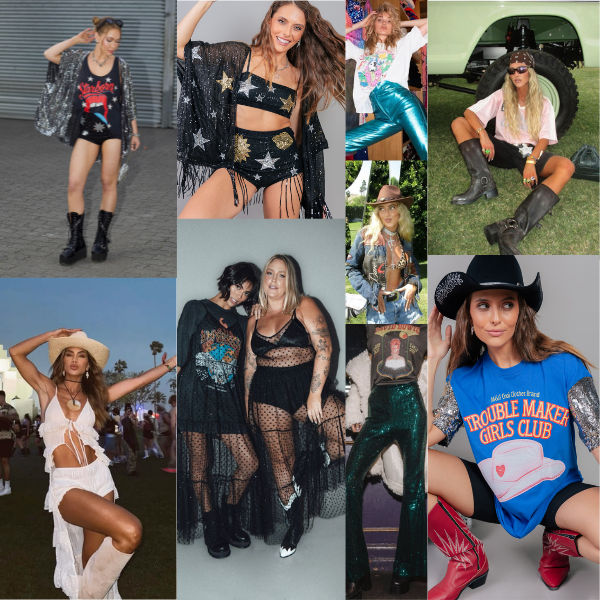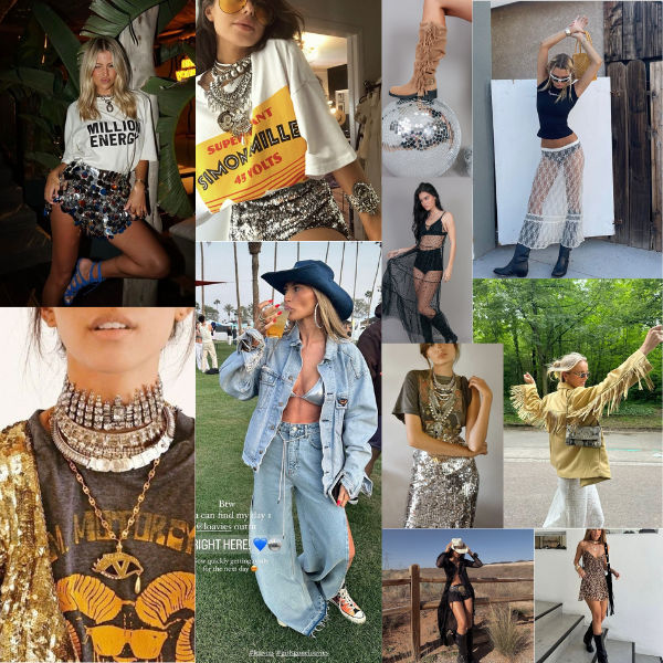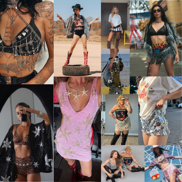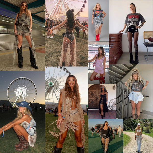 Influências Westerncore (cowboy, franjas, botas e acessórios com corrente) continuam sendo um clássico dos festivais, agora reinterpretadas com um toque contemporâneo. Franjas renovadas e acessórios em couro reforçam um mood boho, perfeito pra eventos ao ar livre com clima descontraído.