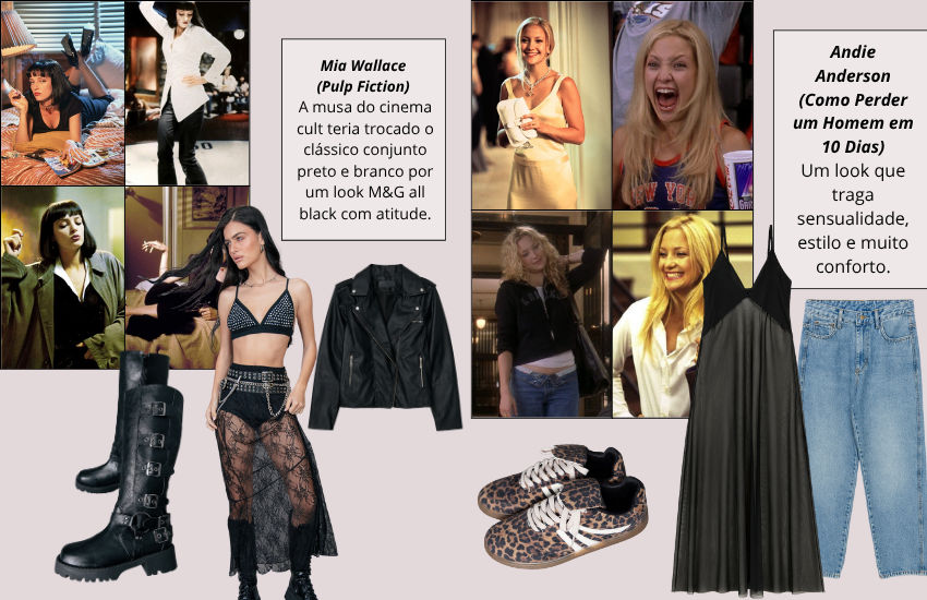Imagina a Mia com saia de renda midi, top de tachas, jaqueta de couro e uma bota biker? Pra finalizar, um mix de cintos statement! Um look que grita poder, sem esforço. O tipo de visual que fala mais alto que qualquer diálogo de Tarantino rsrs