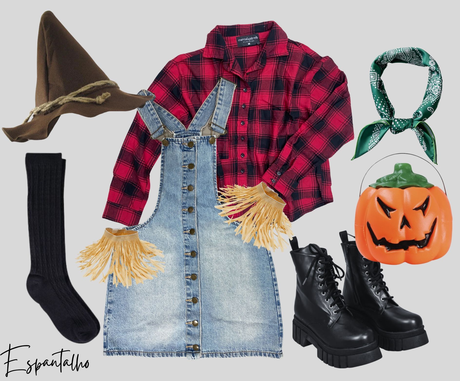 Quem quer algo mais assustador, pode apostar em uma fantasia de espantalho! Uma jardineira jeans ou salopete com uma camisa xadrez fica perfeito! Inista em acessórios como palha, chapéu e a clássica abóbora para os doces!
