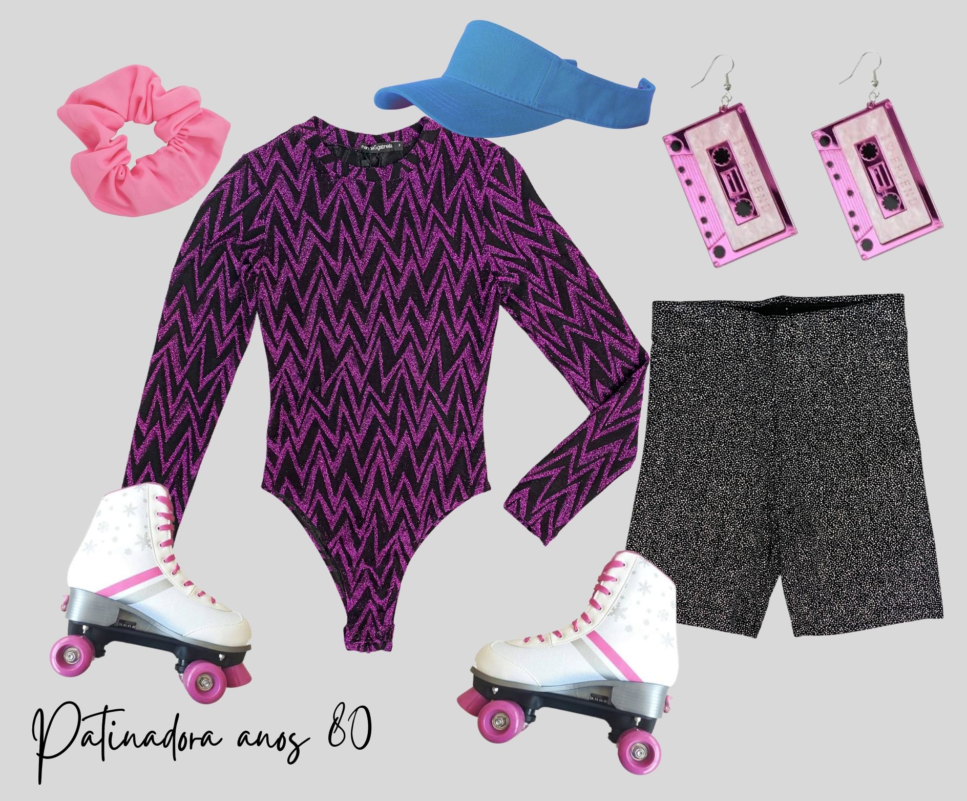 Fantasia Patinadora anos 80! Se joga em um body por cima de uma bermuda, de preferência com muito brilho! Acessórios bem POP e um patins!!