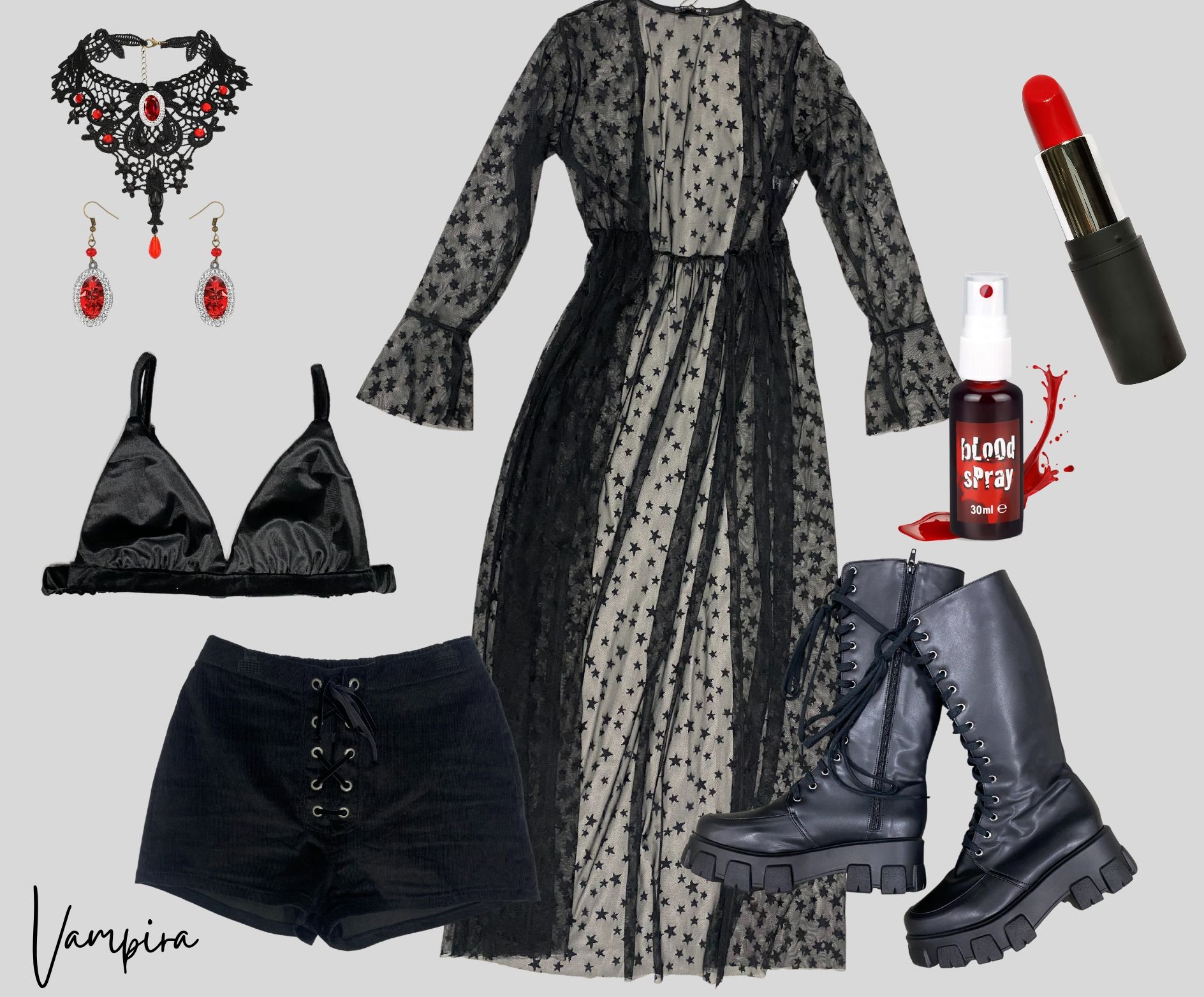 Uma fantasia clássica que sempre faz sucesso é a de Vampira! Look todo preto com uma capa ou kimono de transparência, bota e aquele sangue aritifical no cantinho da boca!