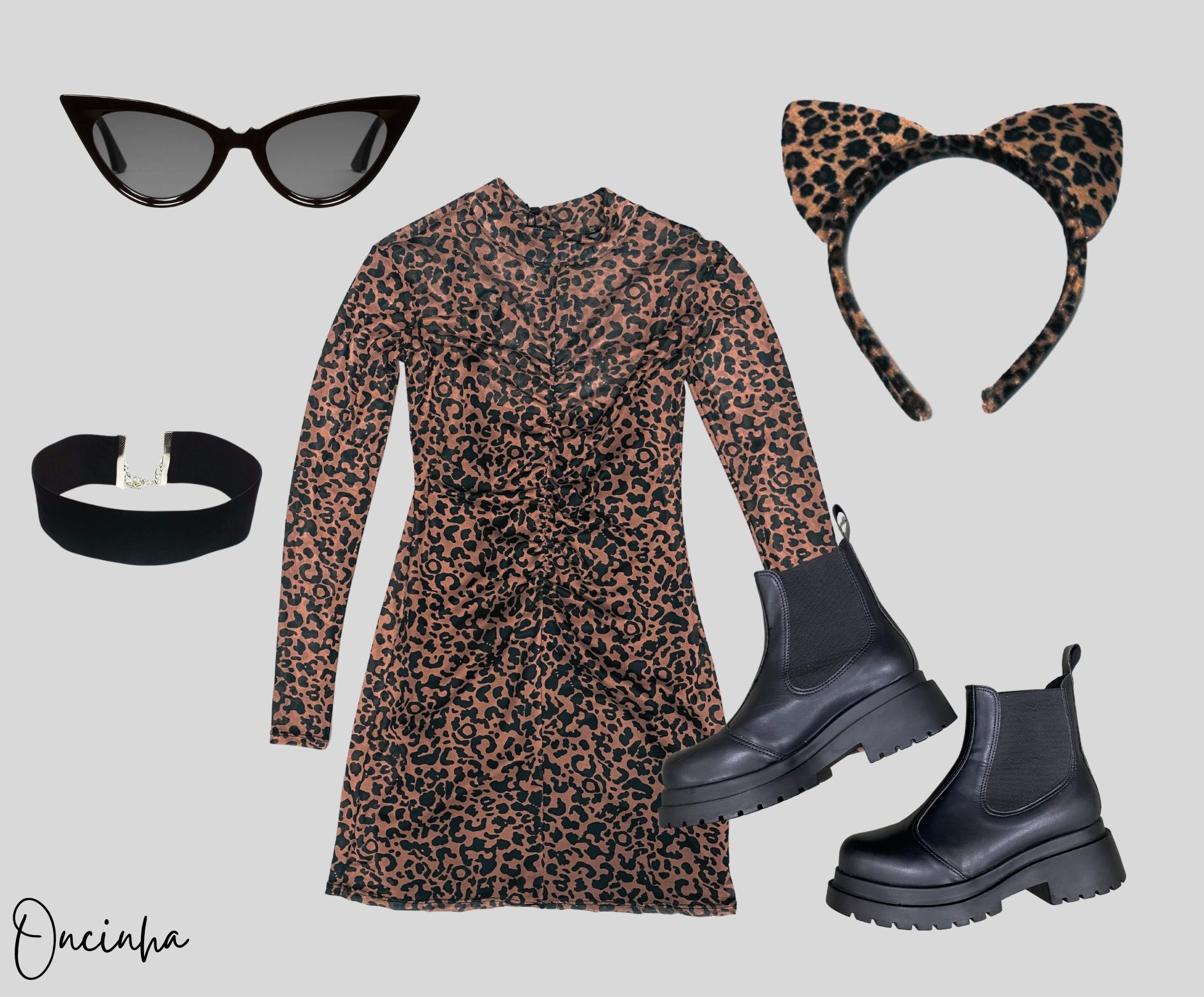 Uma fantasia bem improvisada e ainda fashion é de oncinha! Um vestido todo de animal print, orelhinhas e botinha deixam o look perfeito! Capriche na maquiagem!