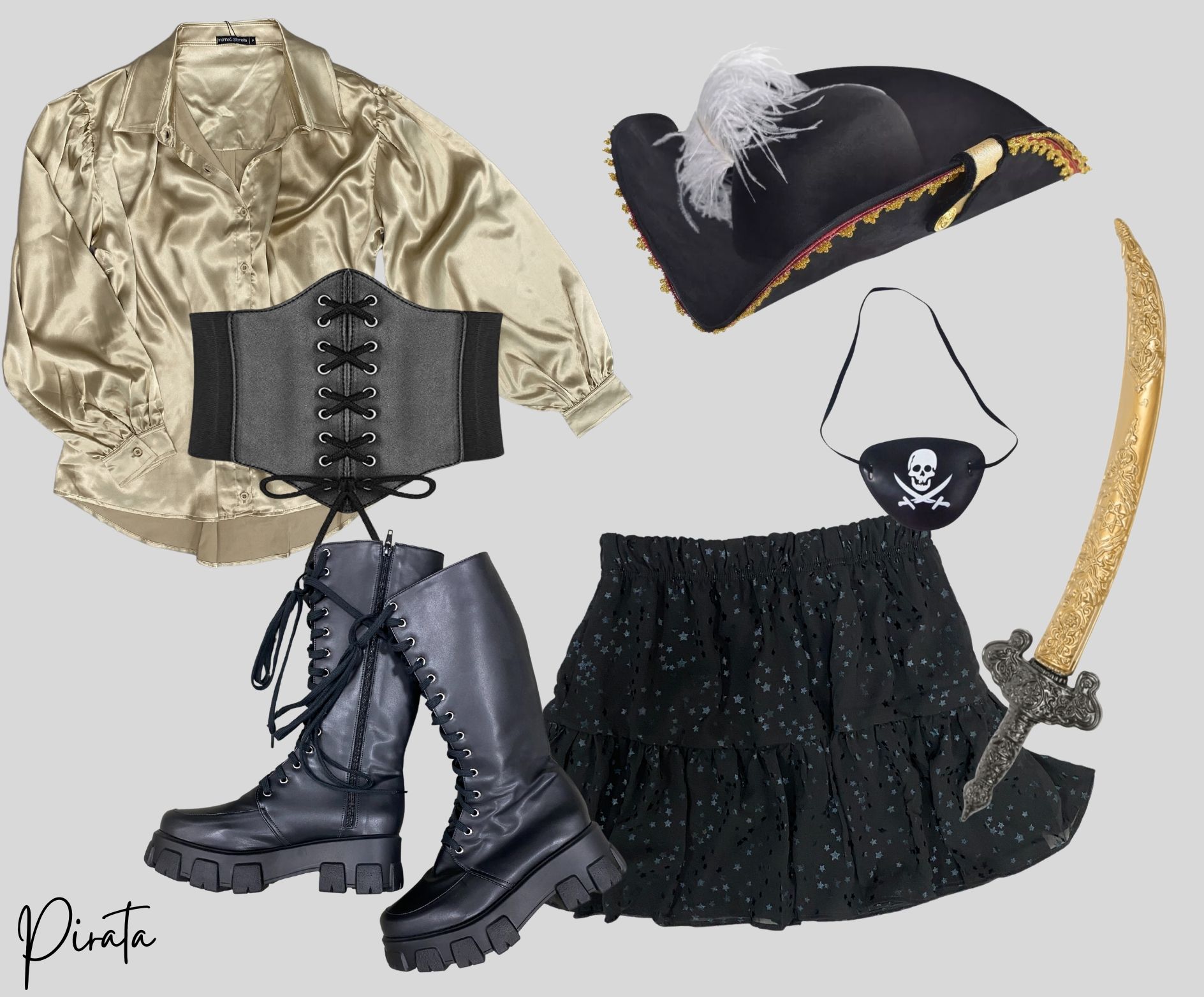 Se você tem um espartilho, essa fantasia de Pirata pode ser fácil e rápida de montar! Uma saia e uma camisa clara ou branca mesmo, acessórios como espada, tapa olho e chapéu, um cabelo e uma make bem legais também completam o look!