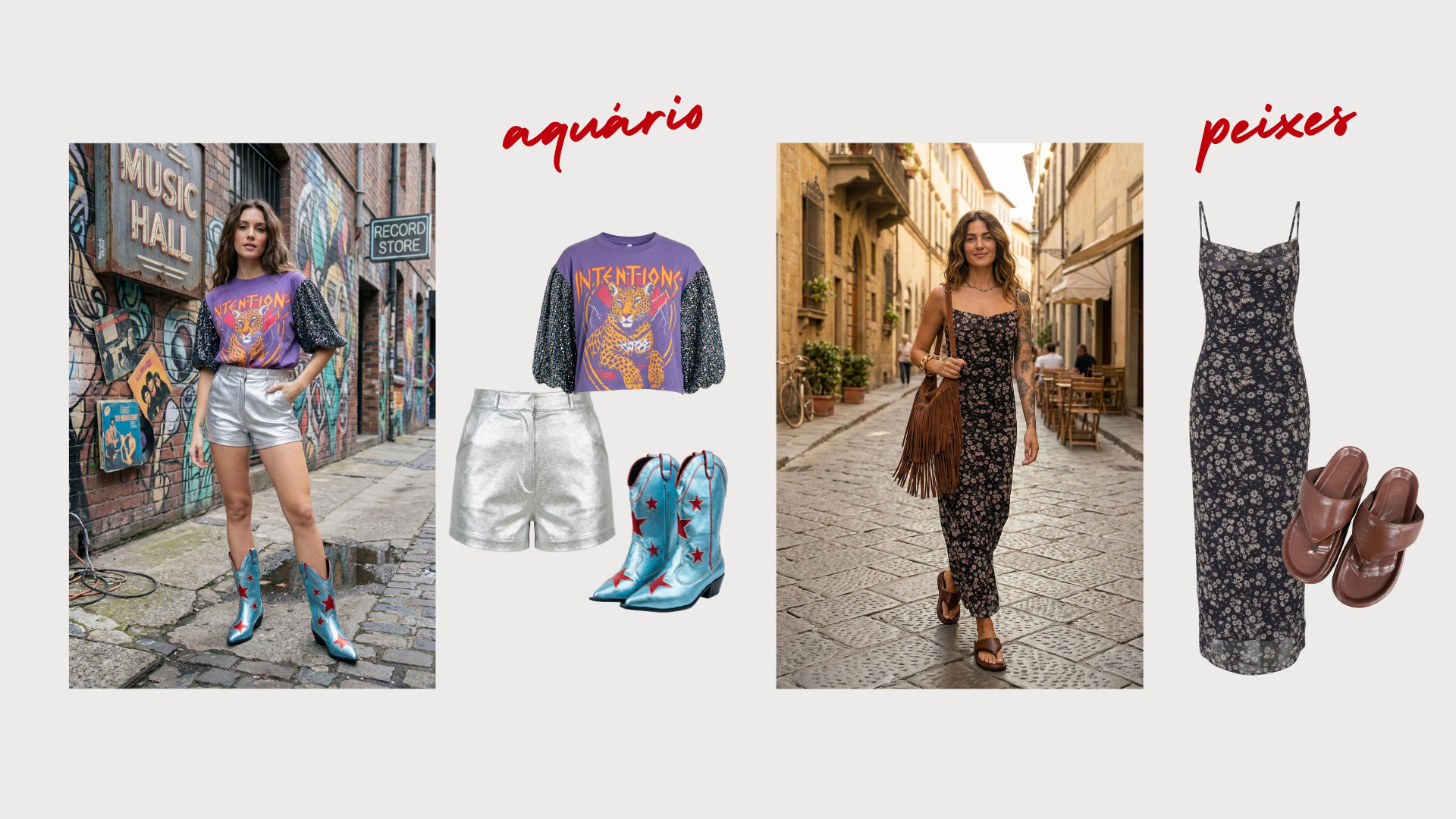 Peixes vive na estética. Texturas leves, tecidos fluidos e brilho delicado criam o visual perfeito para quem transforma sensibilidade em força.