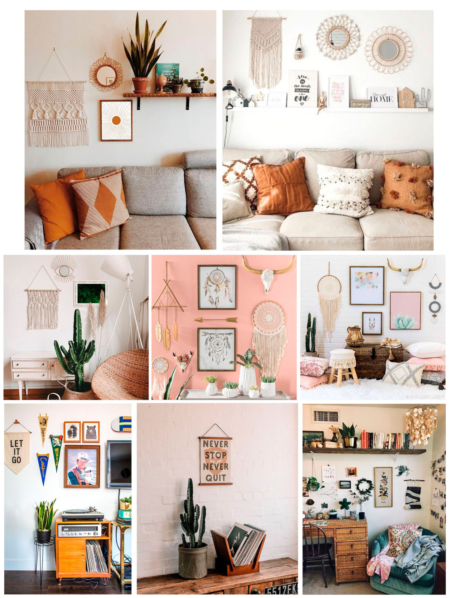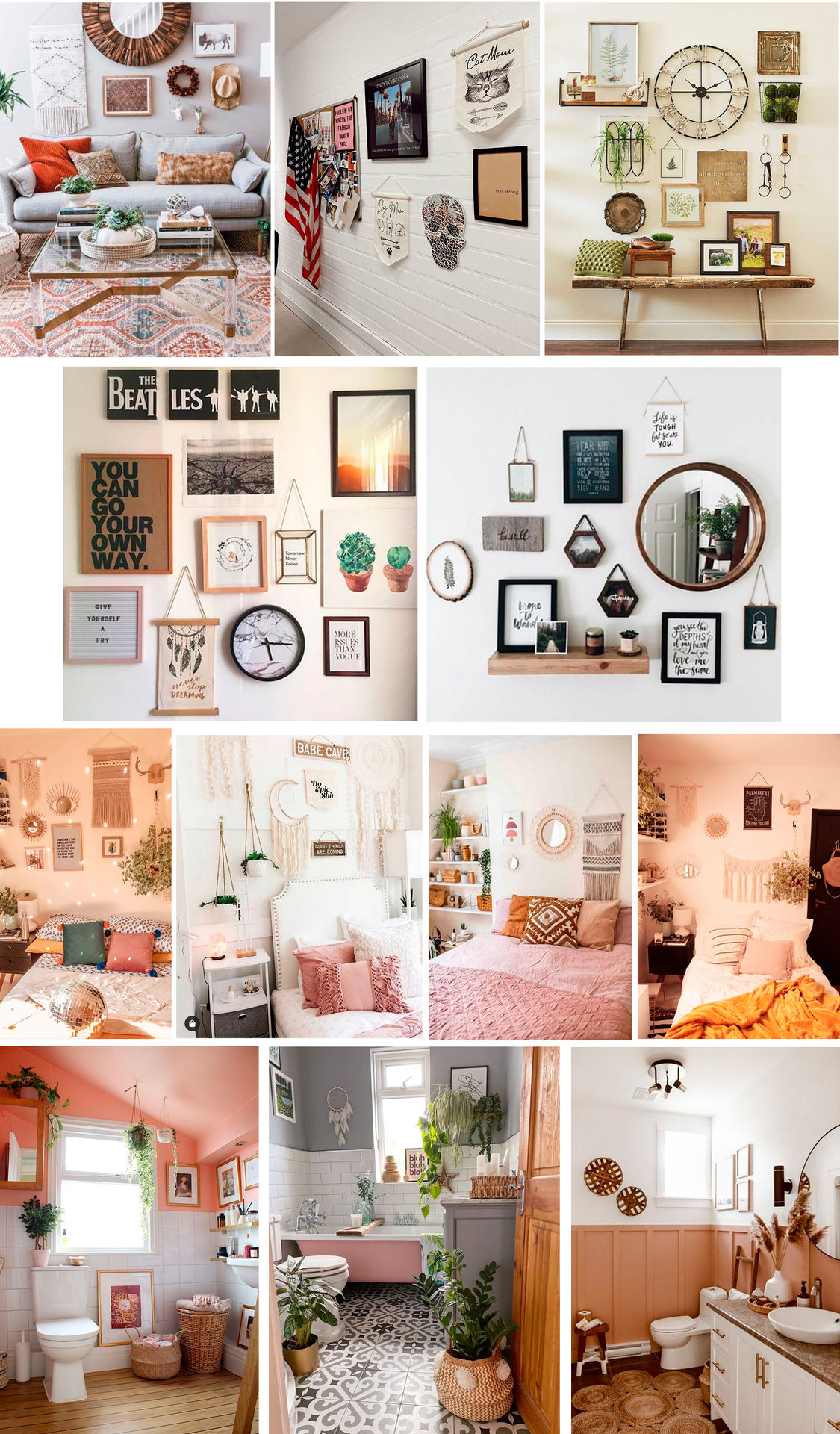 Separamos algumas inspirações do pinterest com composições de flâmulas, quadrinhos, espelhos, plantas e outros ítens de decoração.