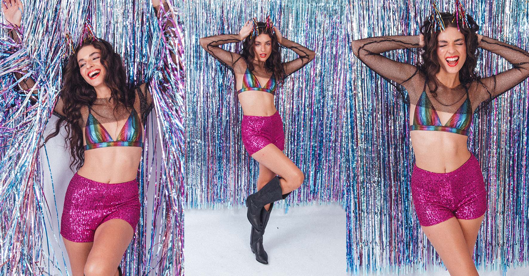 Quem não quer ir caracterizada com uma fantasia em específico, da pra montar uma proposta juntando cores, texturas e dar um ar bem divertido ao look como a proposta acima. Onde usamos shortinho de paetê rosa, top com estampa em foil arco-íris, sobrepondo com uma blusa de tela e finalizando com arquinho colorido.