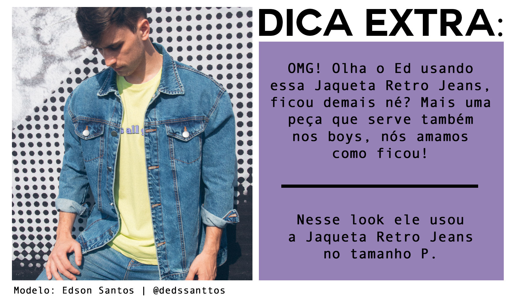 Além disso também damos uma dica extra: a nosa Jaqueta Retro Jeans também serve em boys! O Ed usou uma tamanho P, que acabou ficando mais justinha, mas nós amamos o resultado!!!