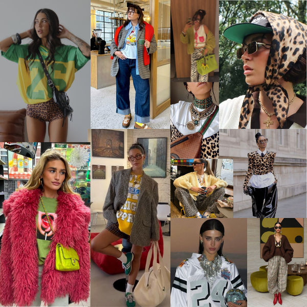 Se o look já é carregado, os acessórios acompanham. Maxi brincos, colares em camadas, cintos statement, lenços, bonés e bolsas marcantes finalizam a produção com ainda mais personalidade. No maximalismo, o detalhe nunca é detalhe, é destaque.