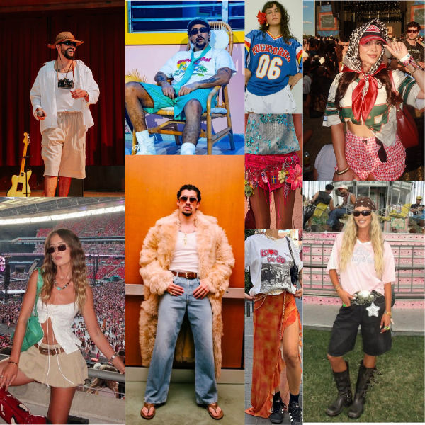 Bad Bunny transformou o estilo masculino pop em território livre. Alfaiataria colorida, óculos statement, shapes amplos, texturas, brilho e combinações inesperadas fazem parte da assinatura visual dele.