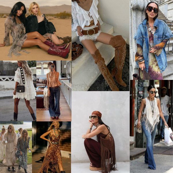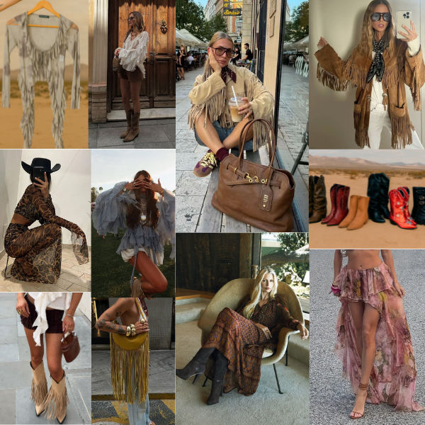Esqueça o visual hippie de sempre: agora o Boho se mistura com referências western, detalhes artesanais e um toque de glamour contemporâneo. Franjas, babados, peças em camurça fake, botas imponentes e acessórios marcantes dão vida a produções modernas e nada óbvias.