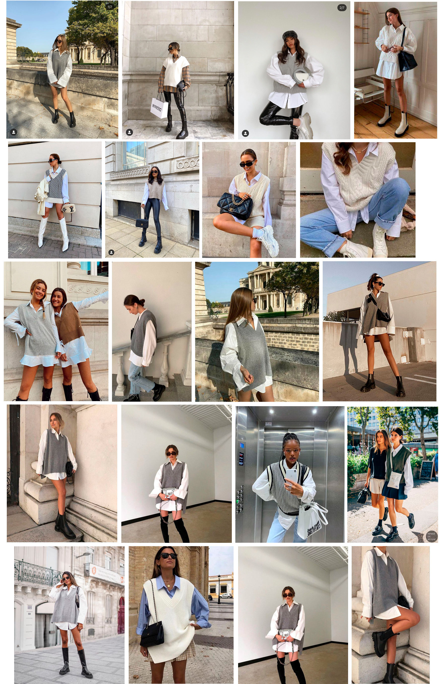 A maioria das inspirações vem com a clássica composição de camisa social branca por baixo, ela pode ser mais certinha, ou bem ampla, podendo ser usada até como vestido e finalizando com o maxi colete por cima. Os acessórios terminam de dar o charme, escolha cortunos de cano médio ou longo, oxfords, ou ainda tênis chunky. Arasse também na escolha da bolsa, do óculos de sol para looks diurnos e capriche nas semi-jóias.