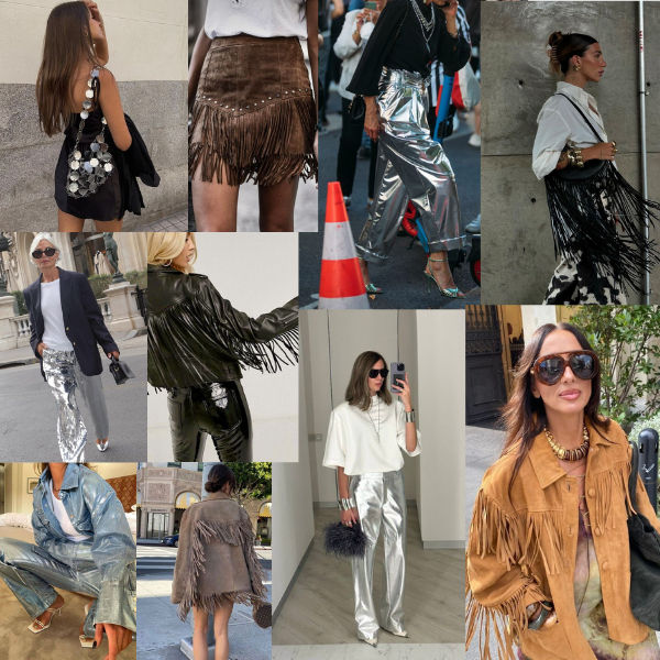 Maxi Franjas e Texturas Marcantes As franjas seguem em alta, evoluindo do estilo boho para uma estética mais sofisticada. Elas aparecem em casacos, saias e até em acessórios, criando movimento e leveza nos looks.