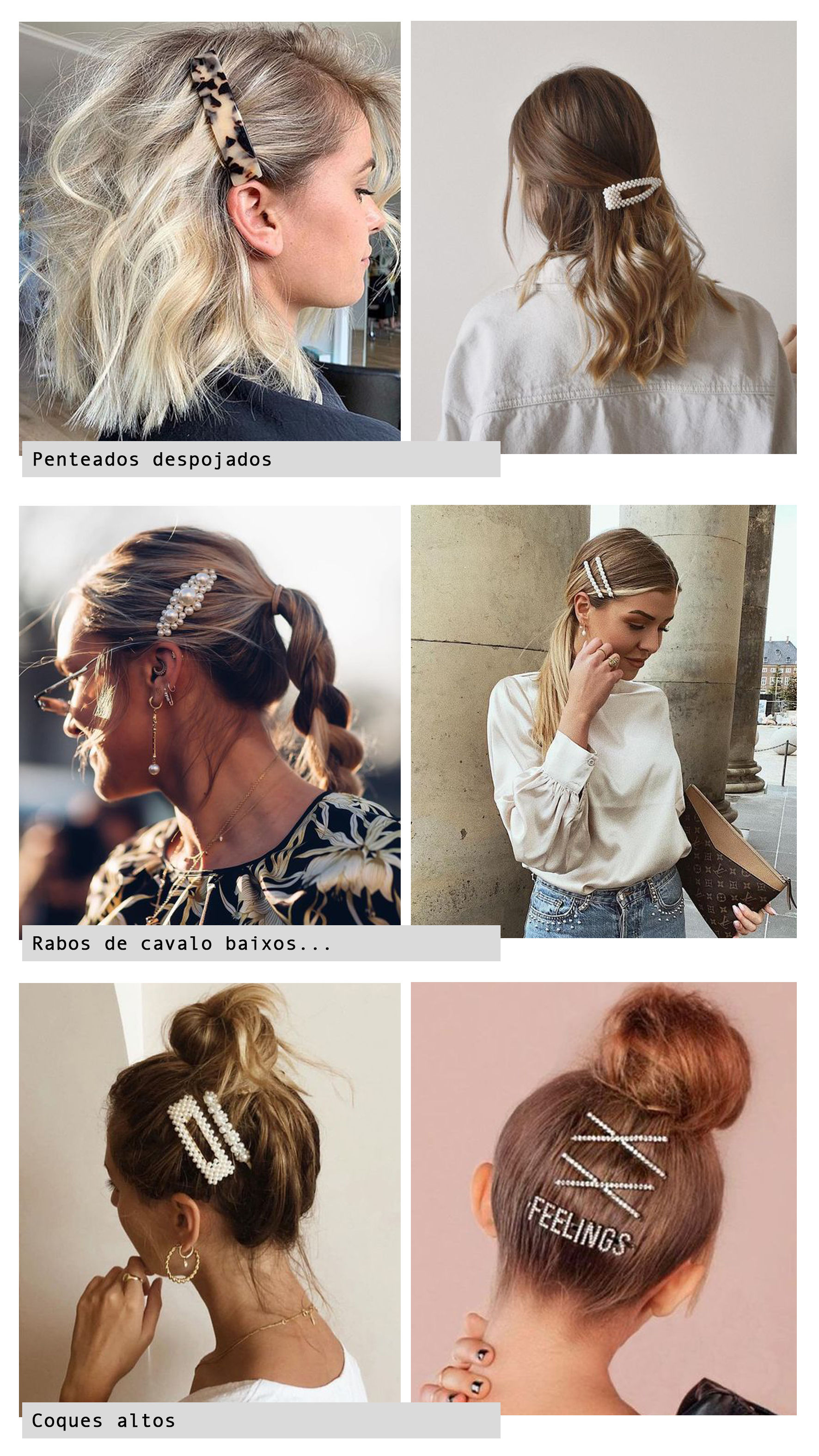 Hoje em dia os hair clips, mais conhecidos como presilhas, grampos, tic-tacs... são nossos queridinhos para agregar valor aos looks. Eles aparacem de diversas maneiras, sendo estampados com animal print, com pérolas, strass, e até mesmo com escritas, confere abaixo com a gente alguns modelinhos: