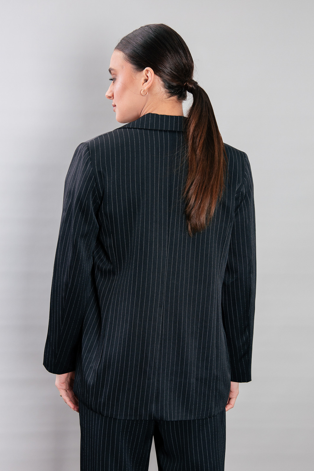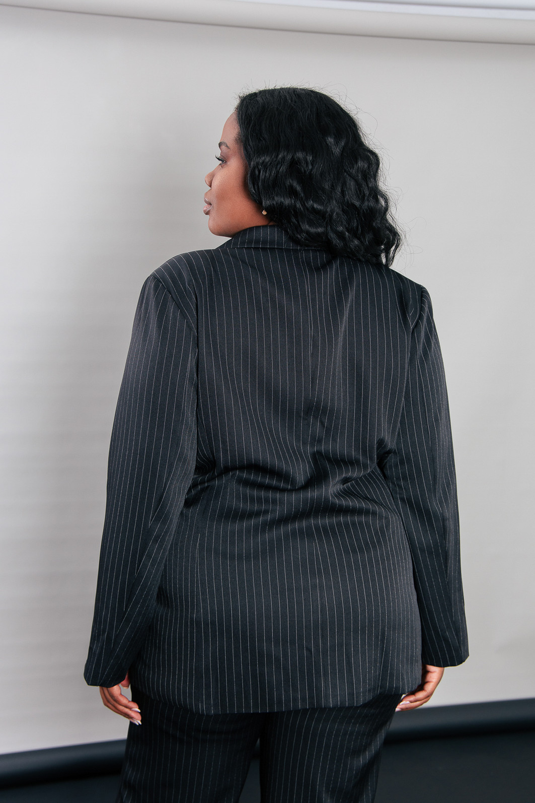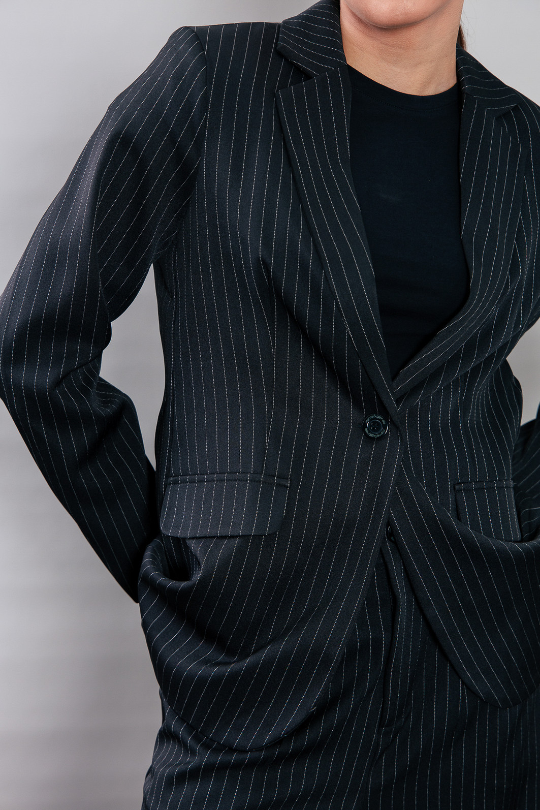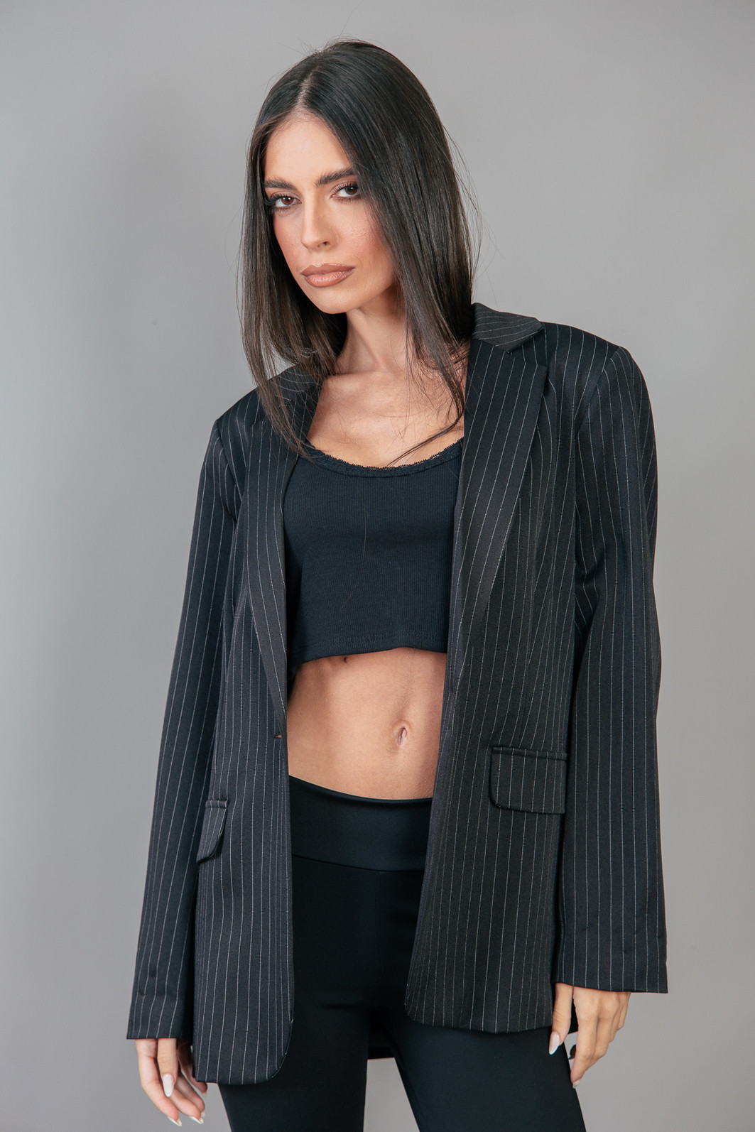 P E R F E I T O! Blazer impecável, em tecido leve e fresco, ou seja você vai poder usar em várias estações. Modelagem bem certinha no corpo, em tecido plano preto com risca de giz cinza. Possui forro. Possui ombreira de espessura fina. Bolsos falsos. Com um botão para usar fechado também.