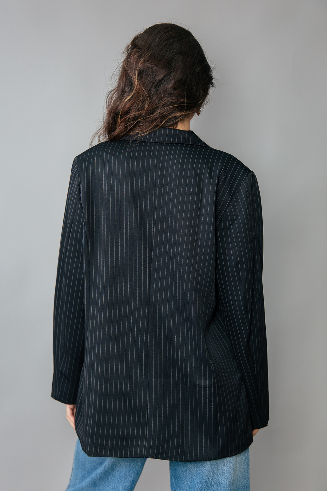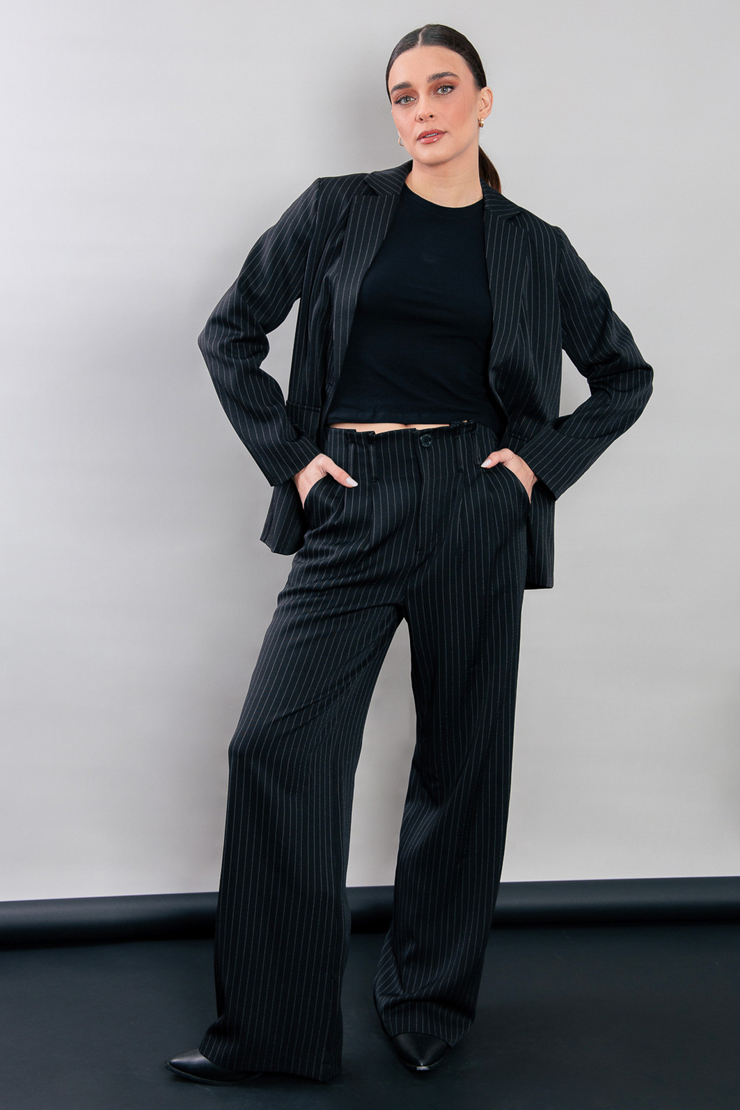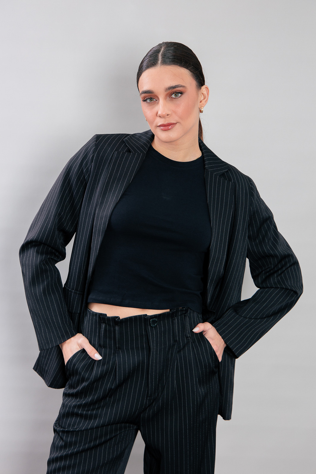 P E R F E I T O! Blazer impecável, em tecido leve e fresco, ou seja você vai poder usar em várias estações. Modelagem bem certinha no corpo, em tecido plano preto com risca de giz cinza. Possui forro. Possui ombreira de espessura fina. Bolsos falsos. Com um botão para usar fechado também.