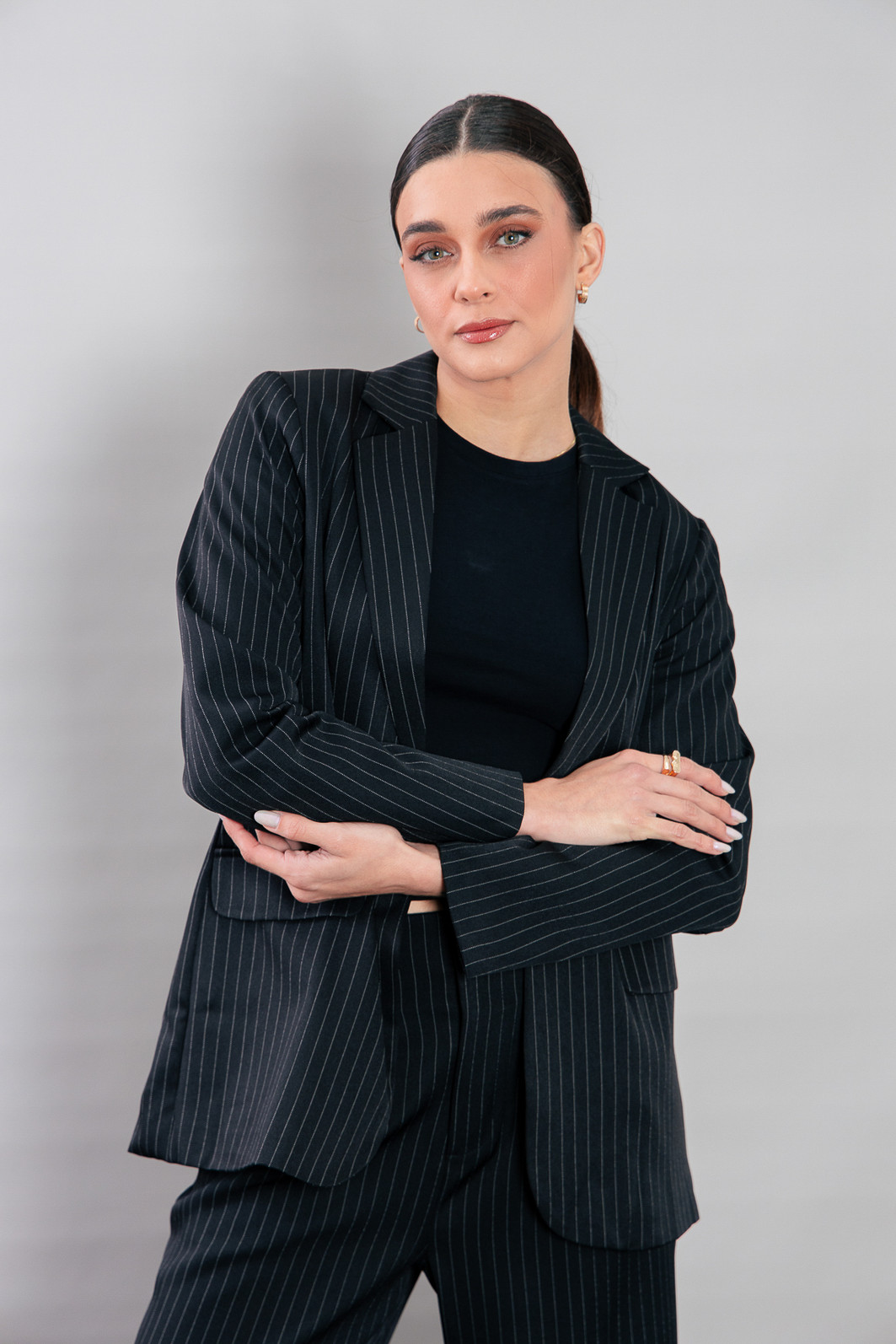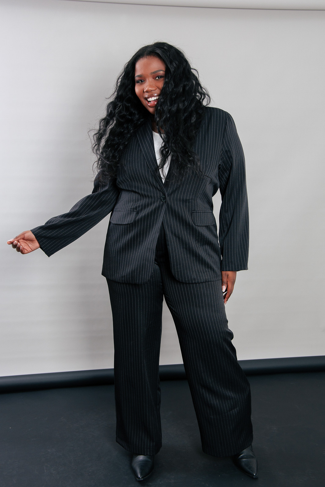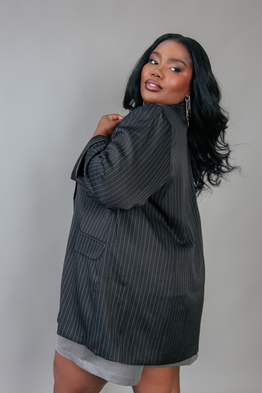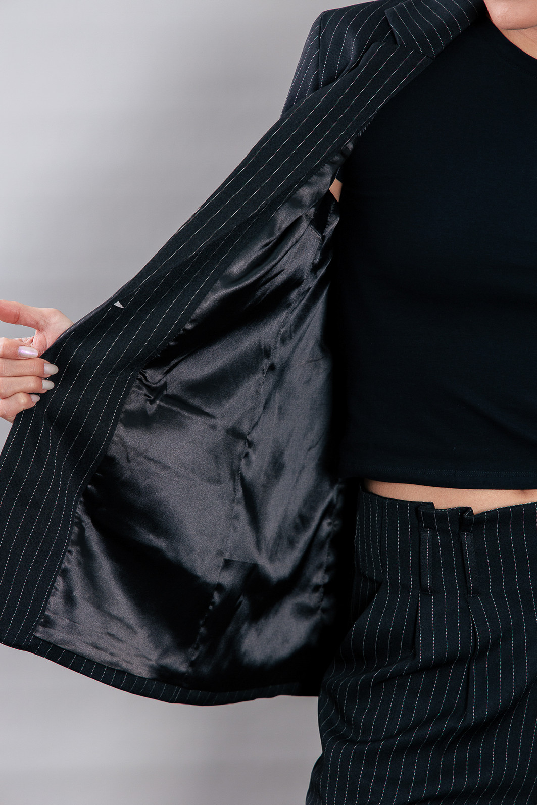 P E R F E I T O! Blazer impecável, em tecido leve e fresco, ou seja você vai poder usar em várias estações. Modelagem bem certinha no corpo, em tecido plano preto com risca de giz cinza. Possui forro. Possui ombreira de espessura fina. Bolsos falsos. Com um botão para usar fechado também.