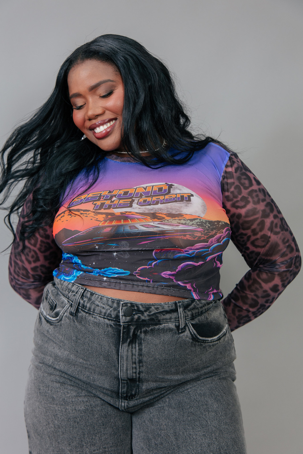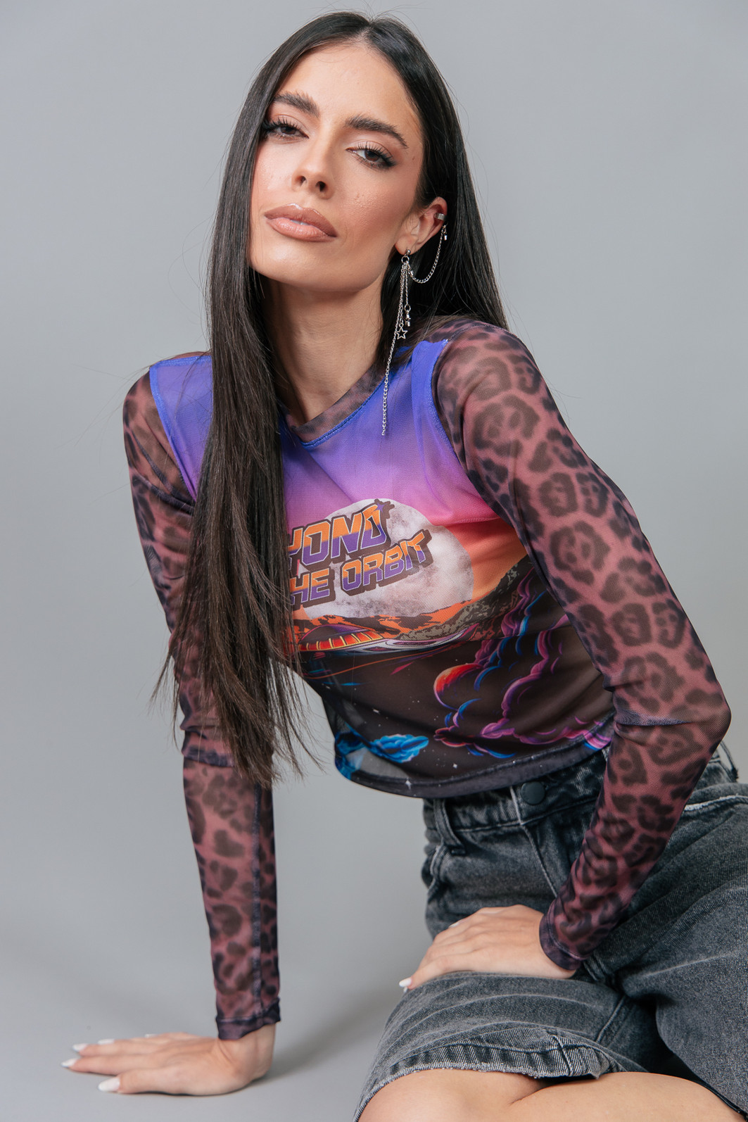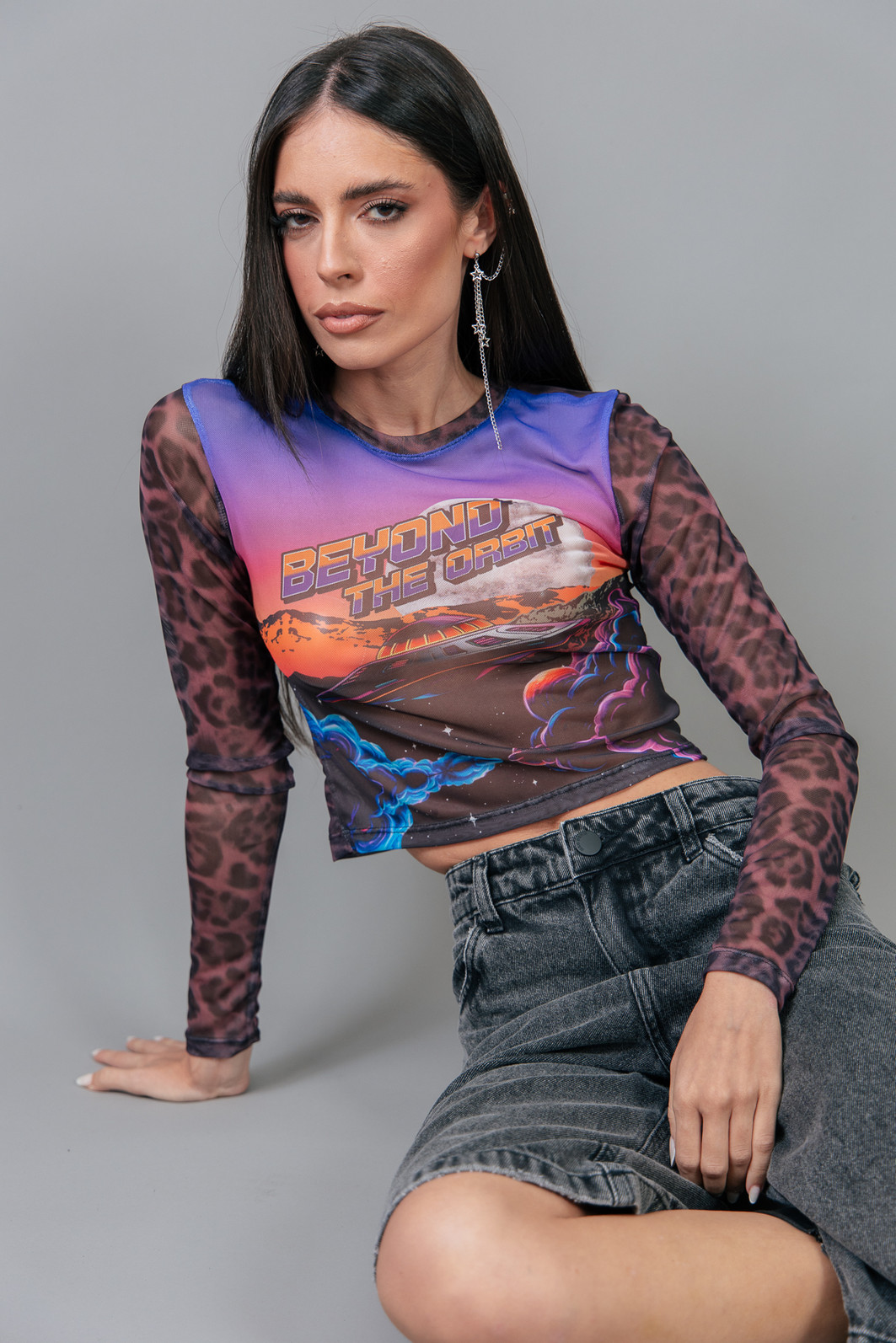 Blusa com modelagem mais justinha toda em tule sublimado com estampa exclusiva. Tecido bem leve e macio com elastano.