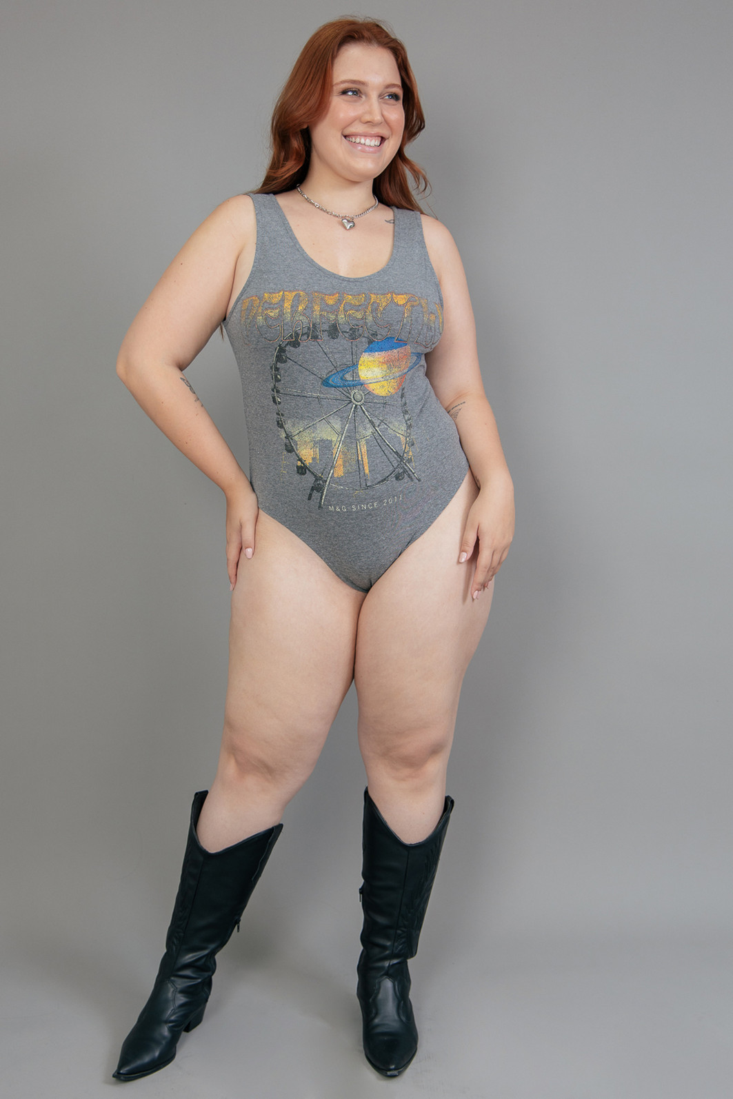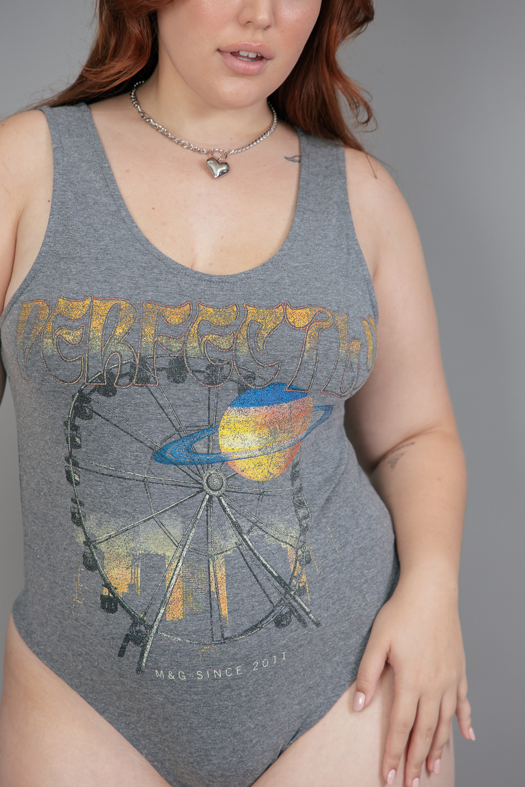 Body com carinha de t-shirt! Em cotton cor mescla bem confortável pois possui elastano na composição. Fecho estilo tip top. Estampa localizada frente.