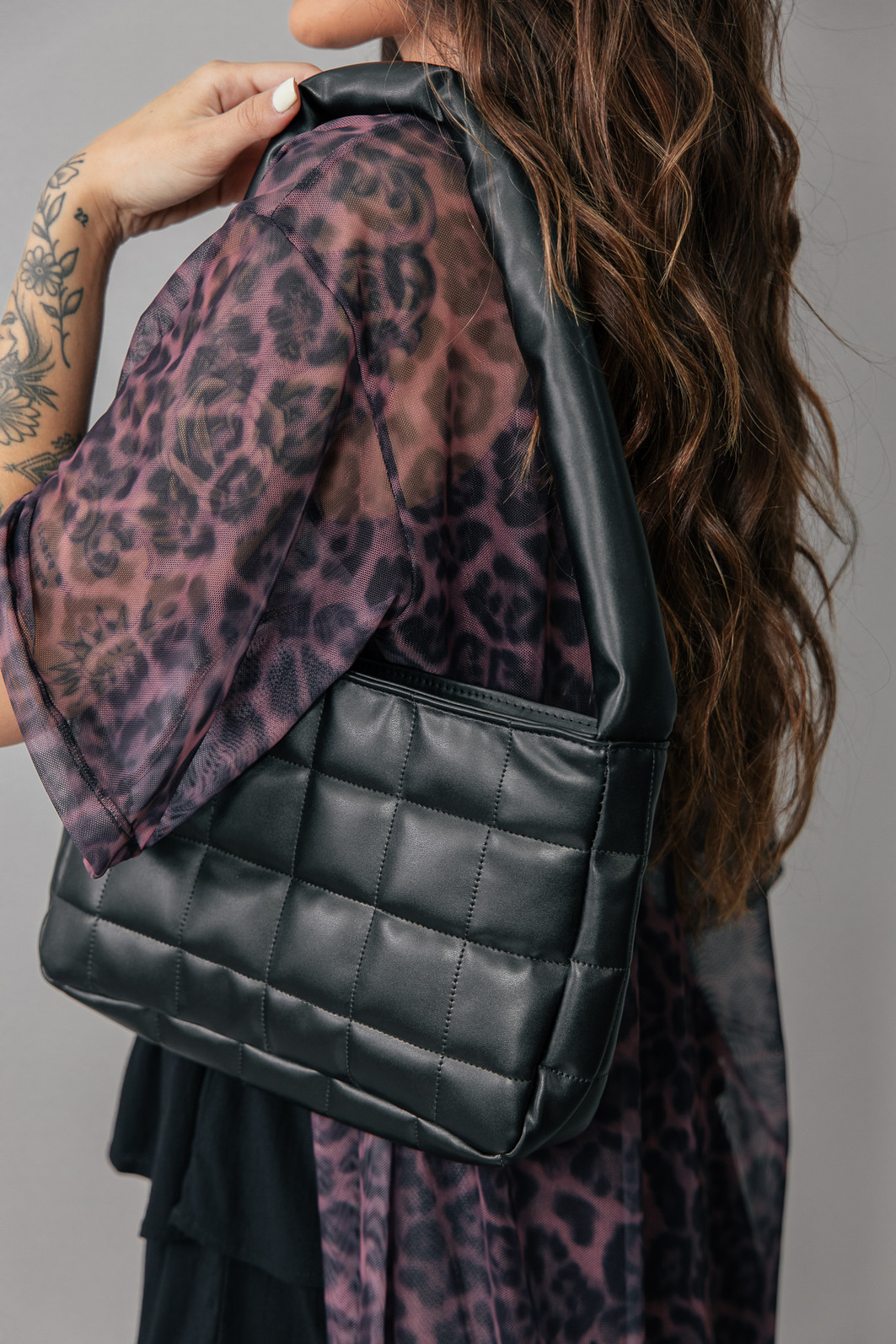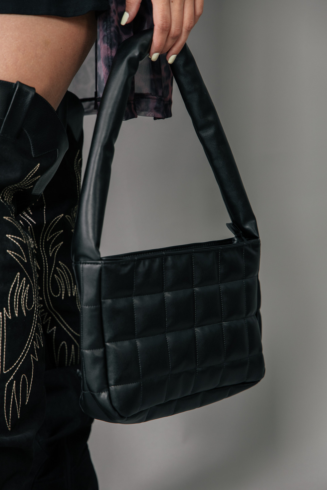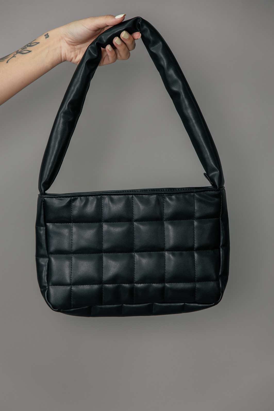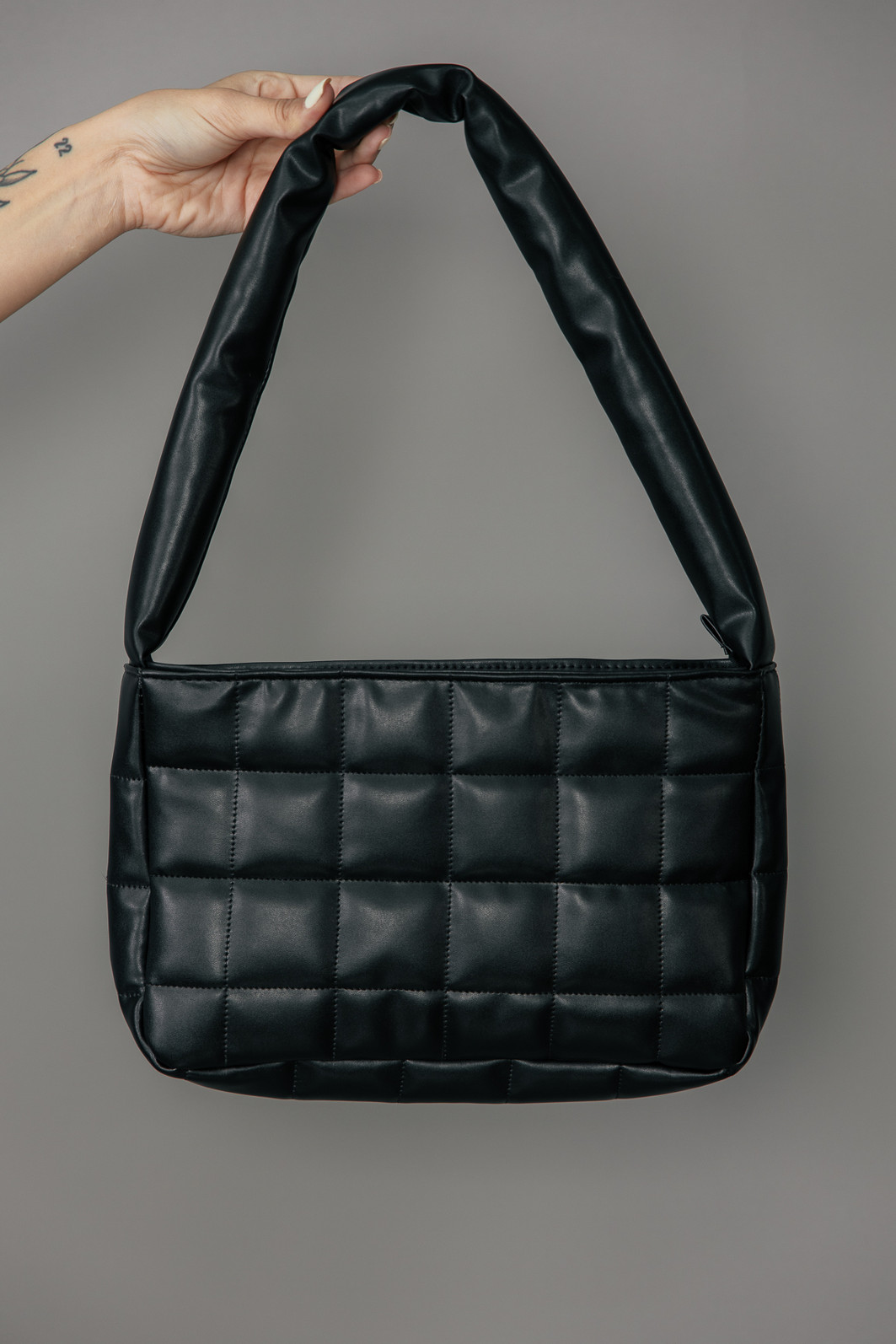Bolsa em material sintético na cor preta com efeito puffer. Forro interno e bolsinho com zíper.