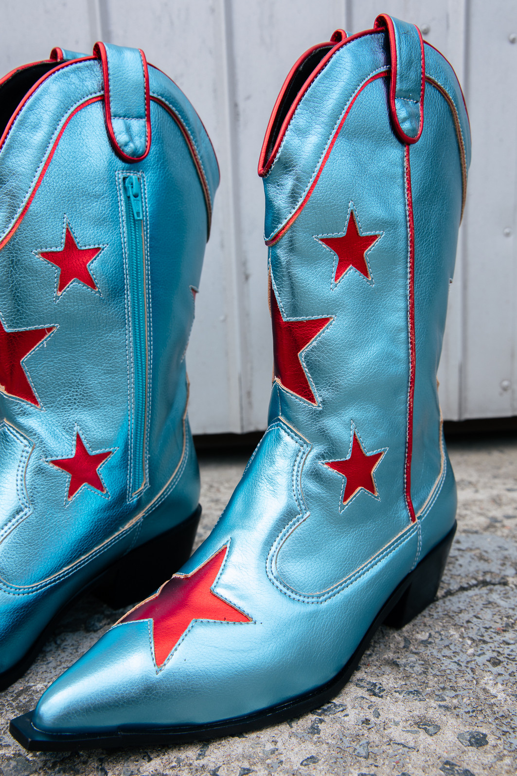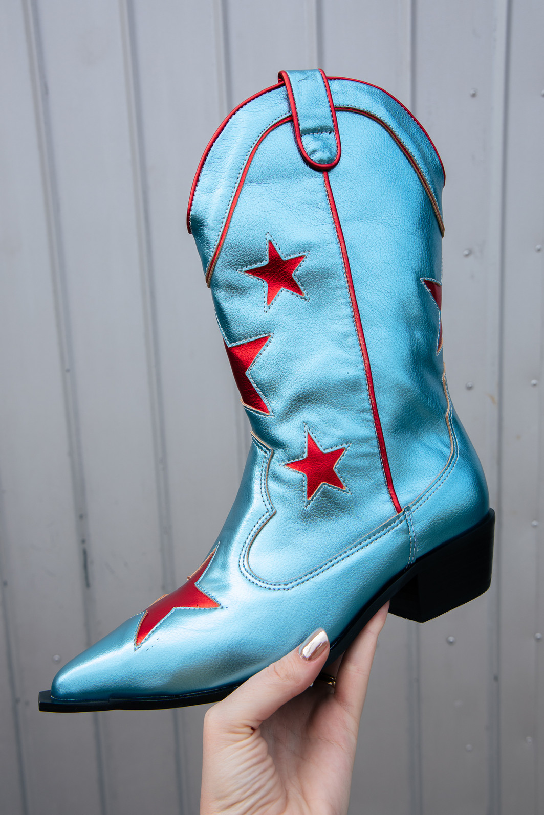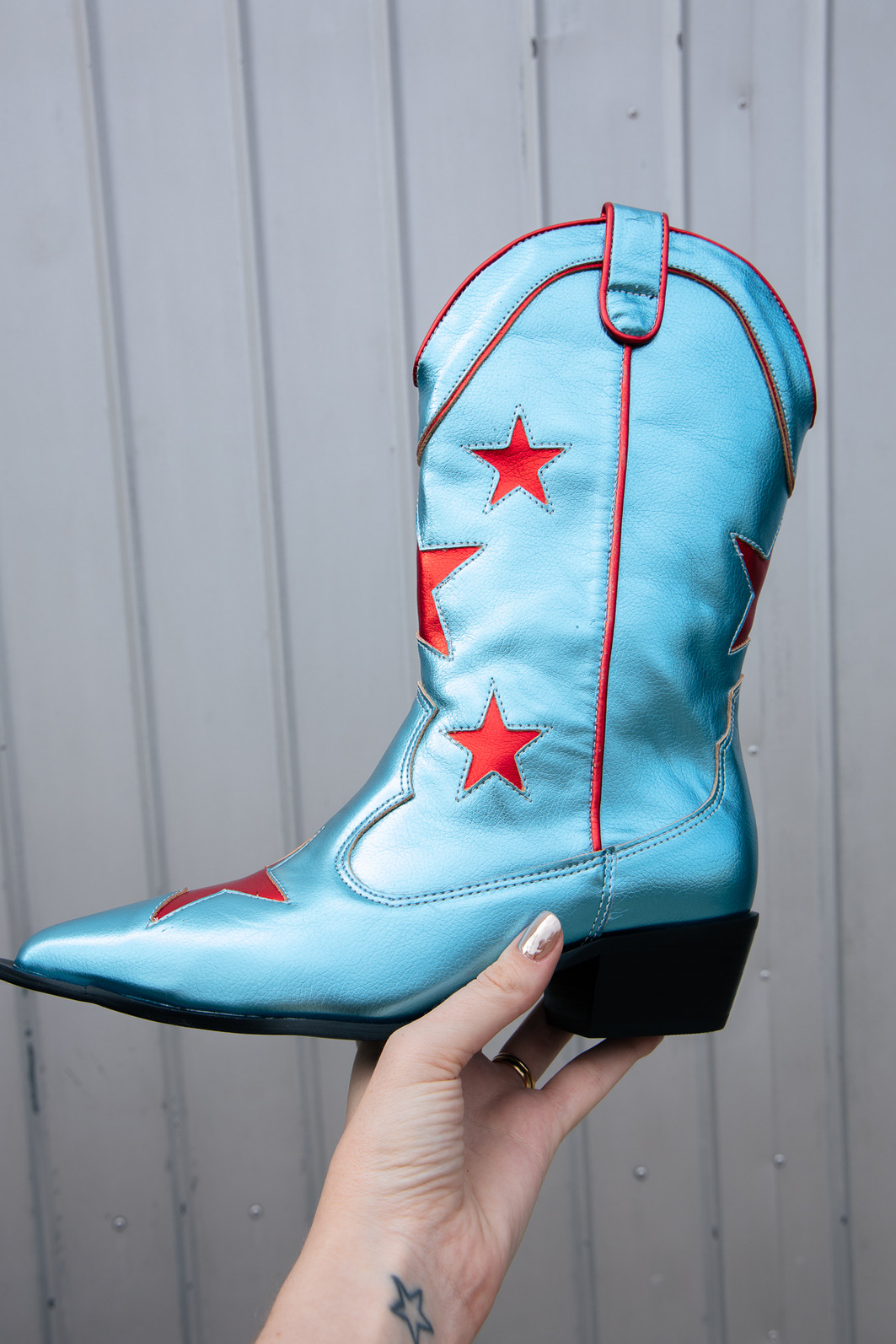 UAUUUU! Bota super leve e confortável, estilo western em material sintético na cor azul. Detalhes de friso e desenhos de estrelas na cor vermelho metalizado.