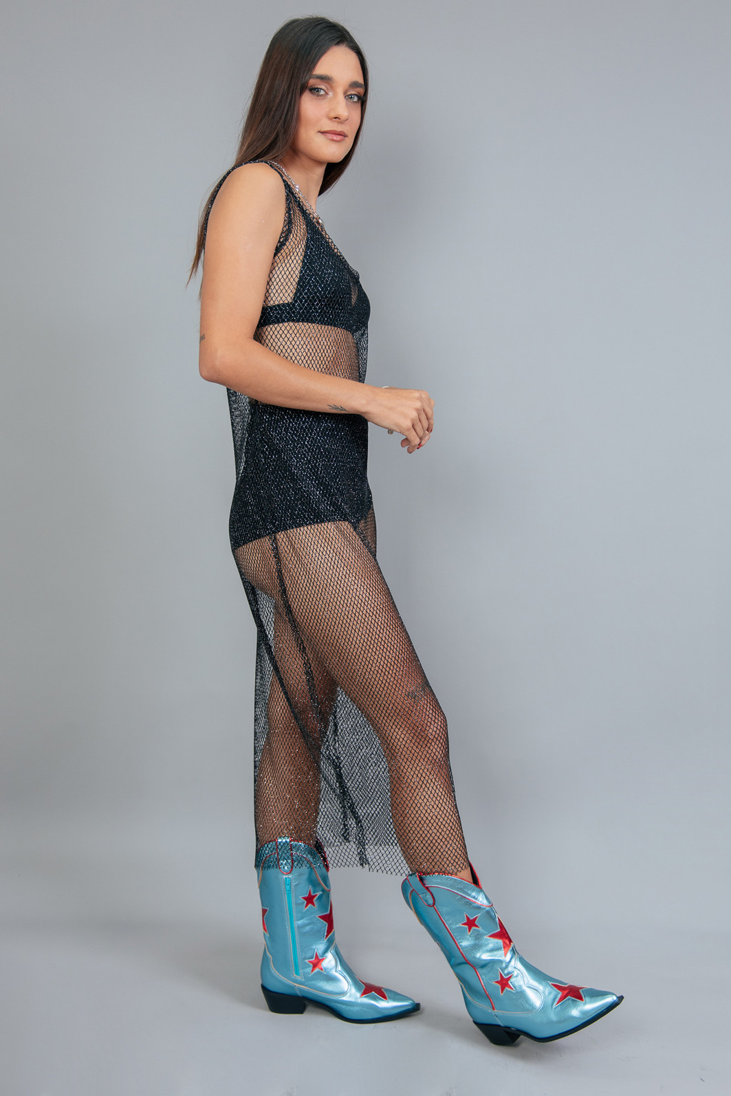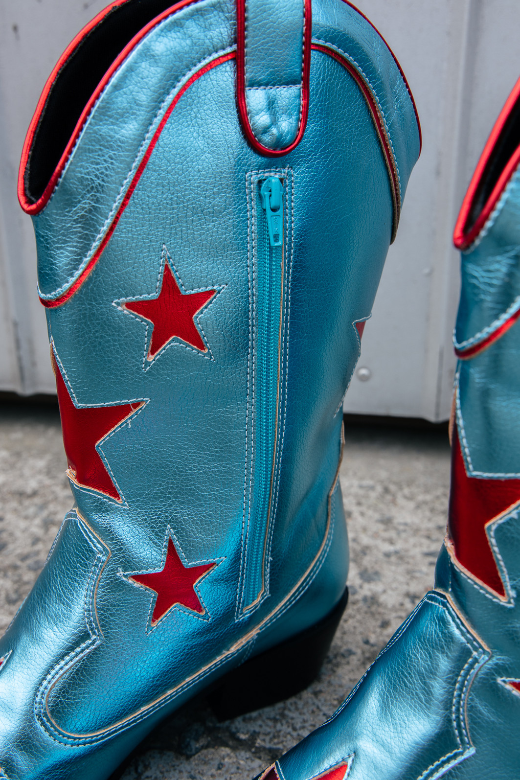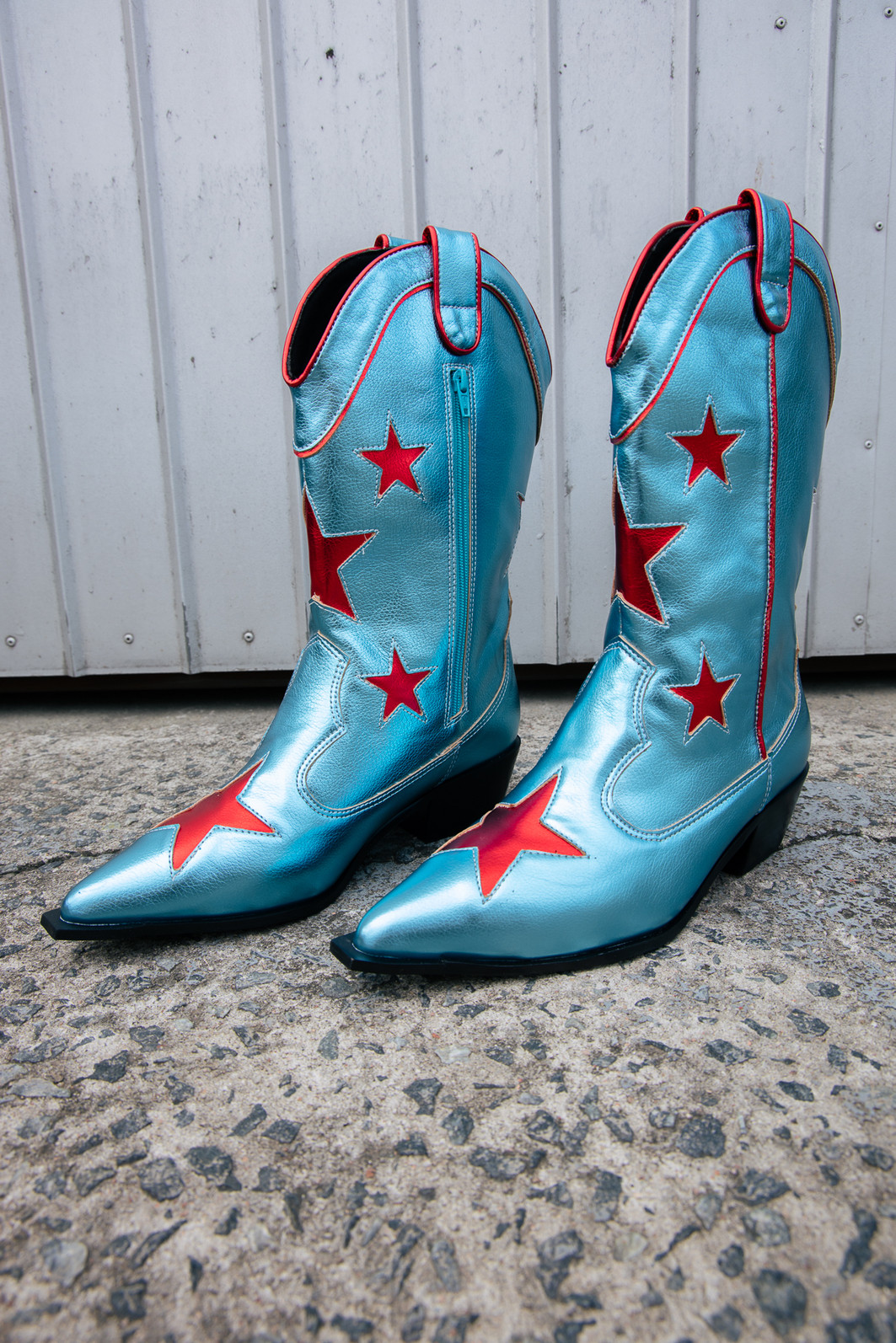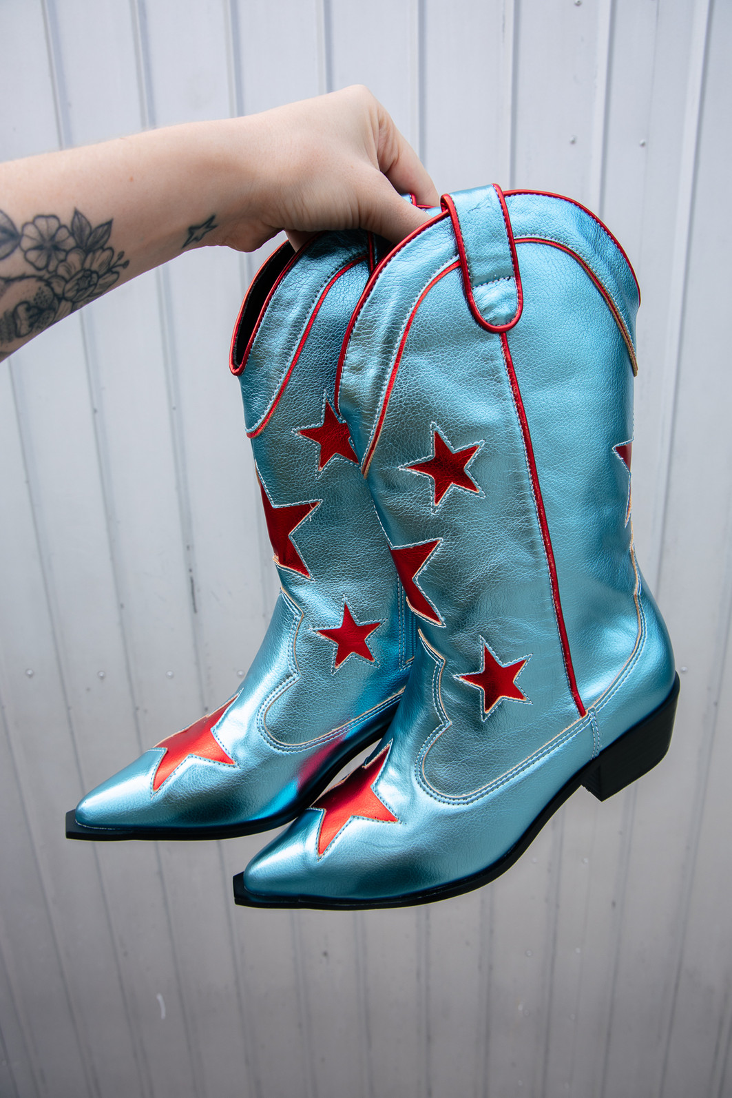 UAUUUU! Bota super leve e confortável, estilo western em material sintético na cor azul. Detalhes de friso e desenhos de estrelas na cor vermelho metalizado.
