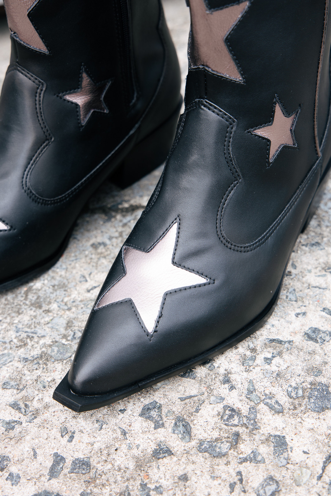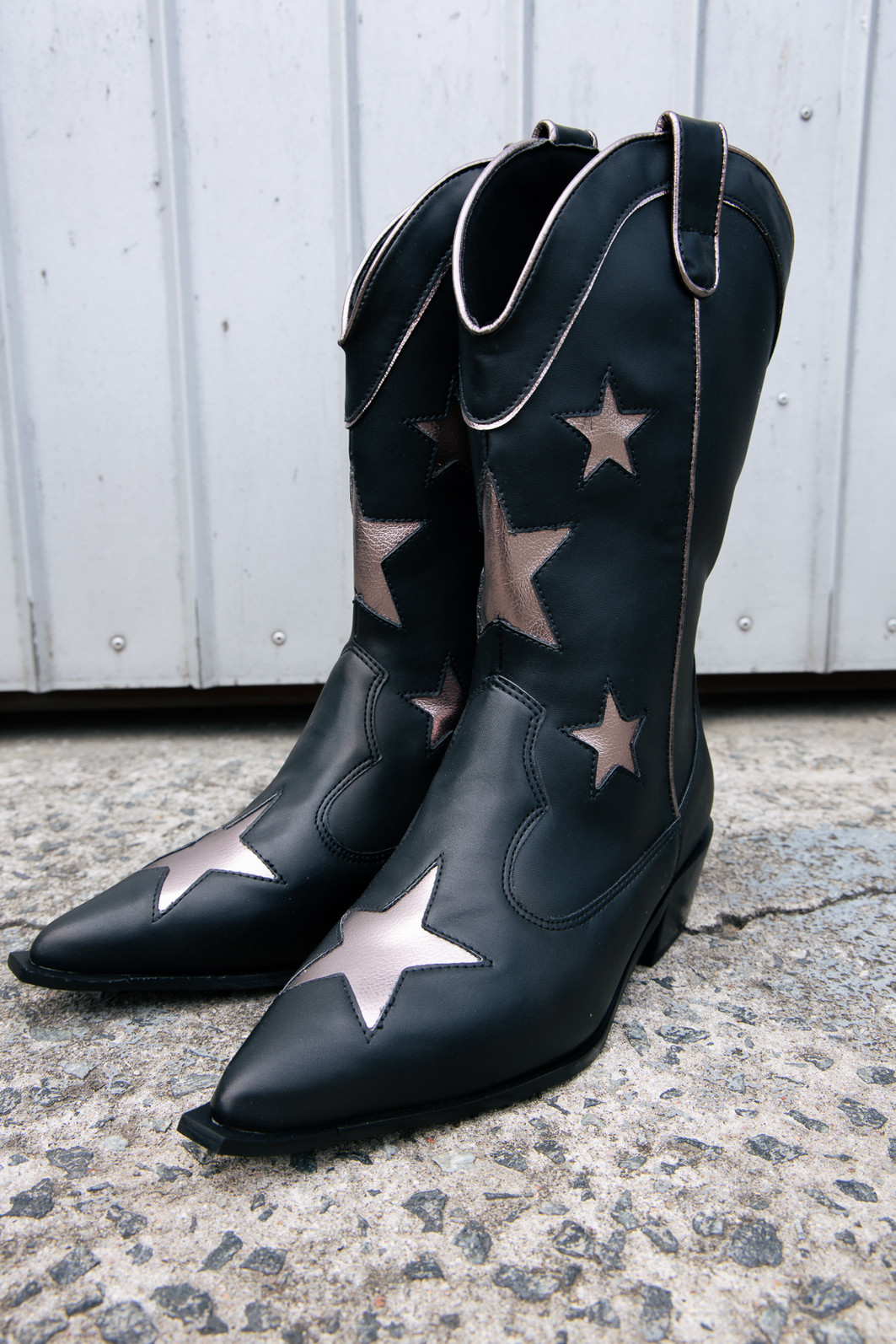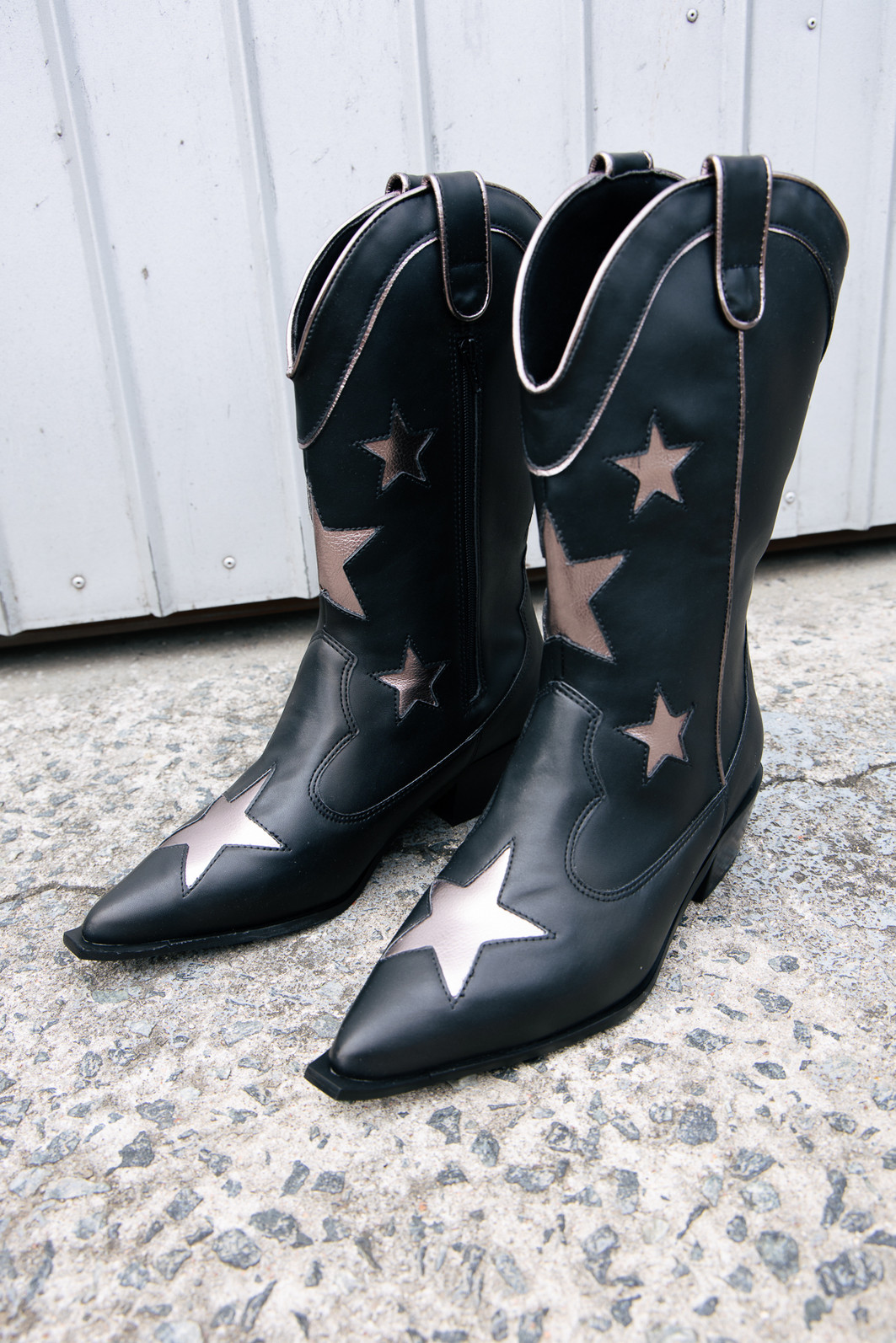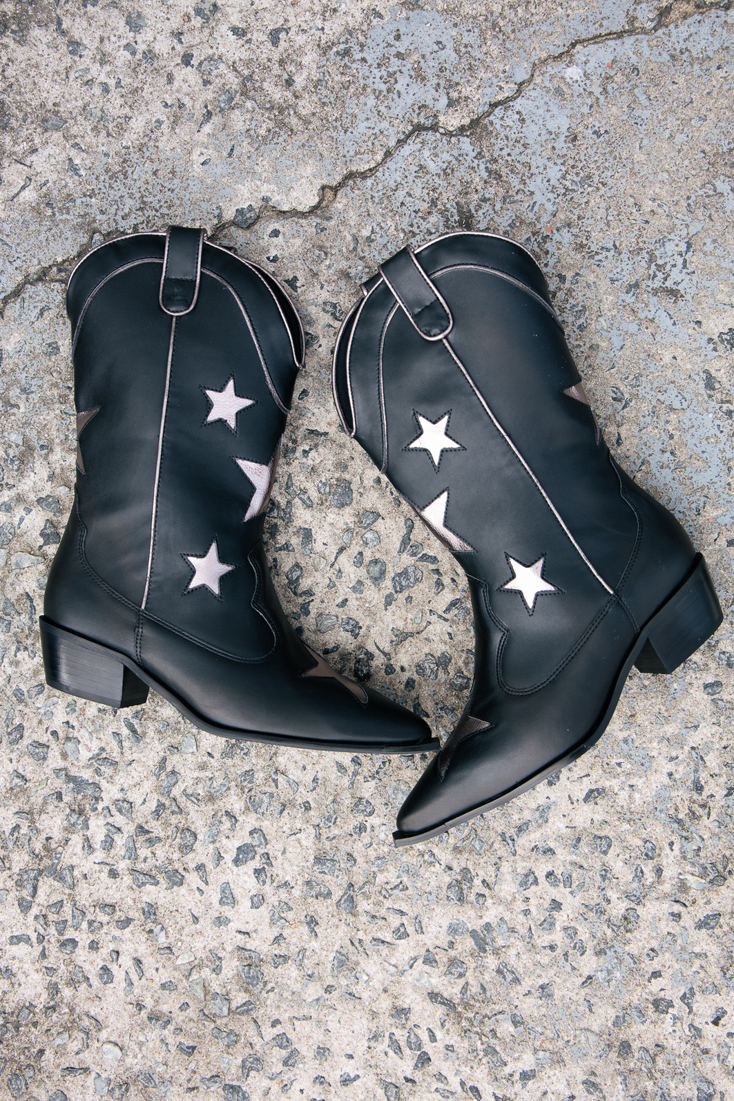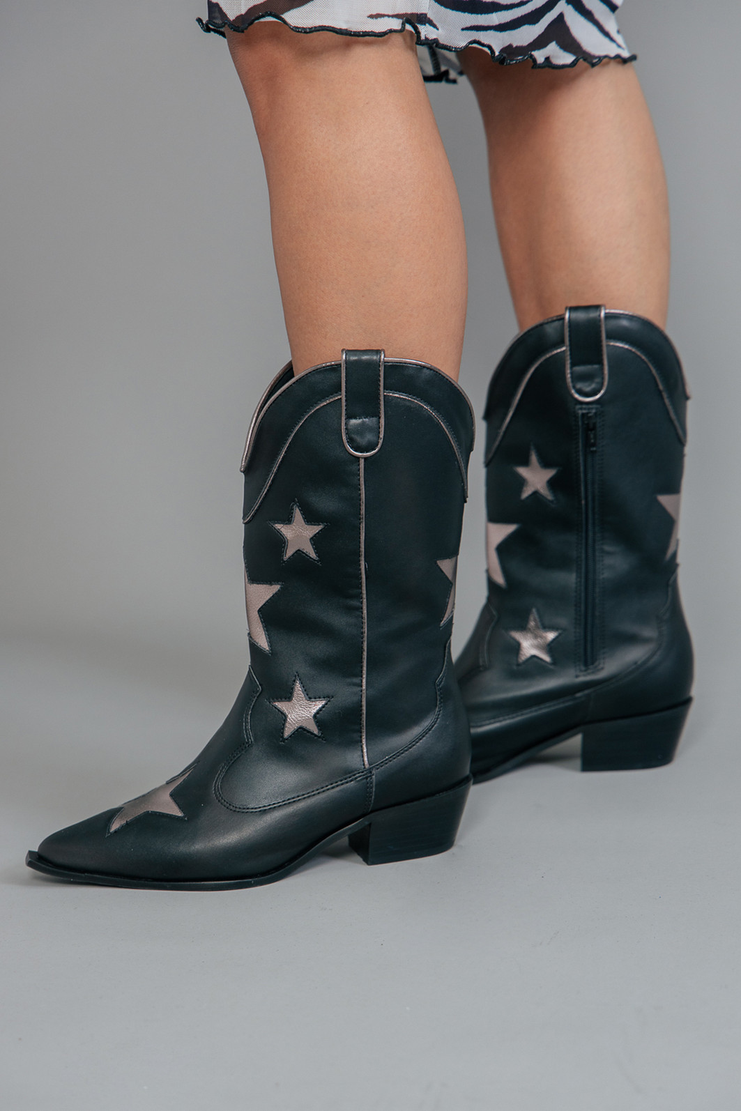 UAUUU! Bota super leve e confortável, estilo western em material sintético na cor preta. Detalhes de friso e desenhos de estrelas na cor prata envelhecido metalizado.