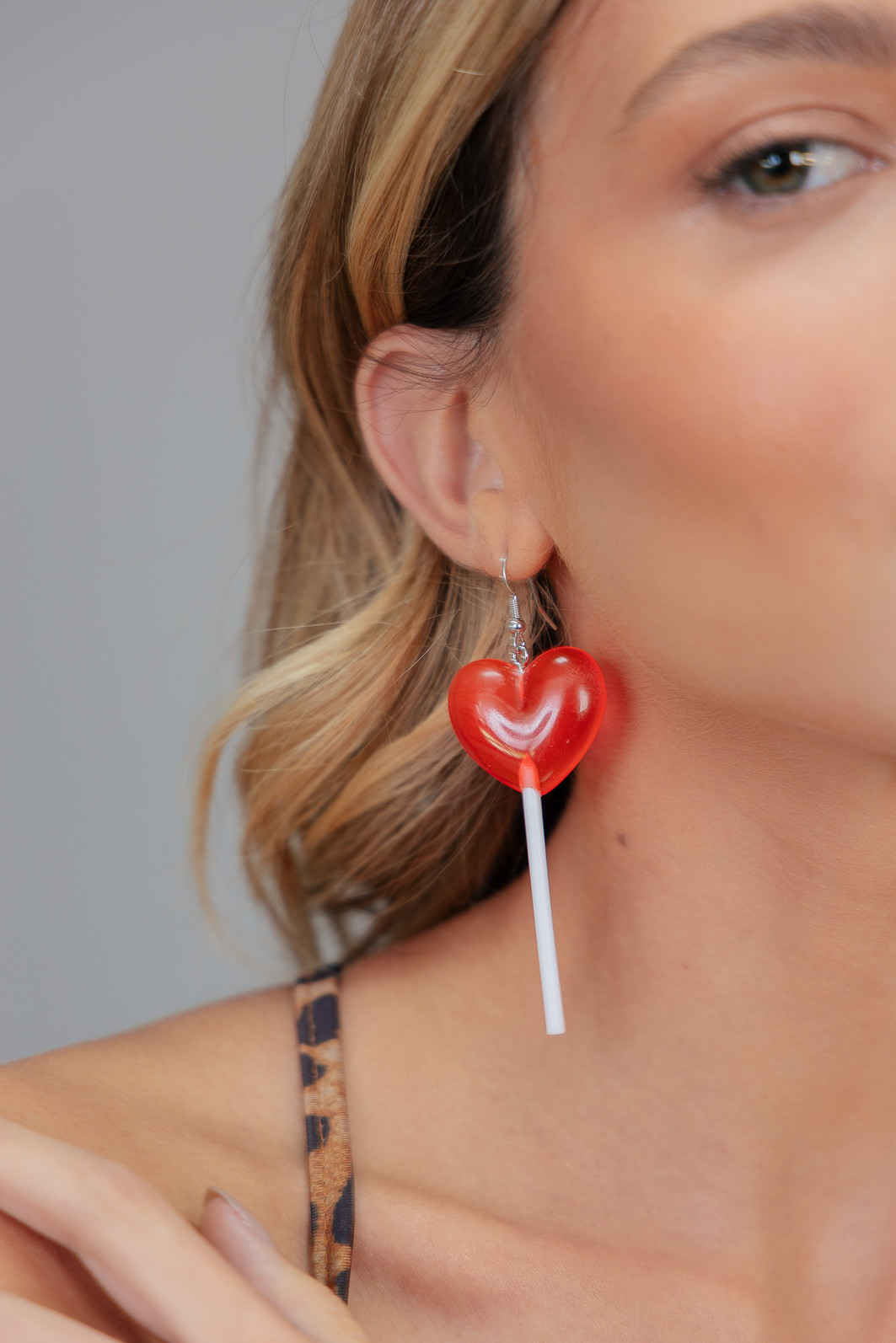 Brinco de bijuteria em formato de pirulito feito de plástico.