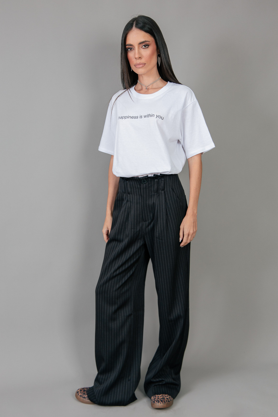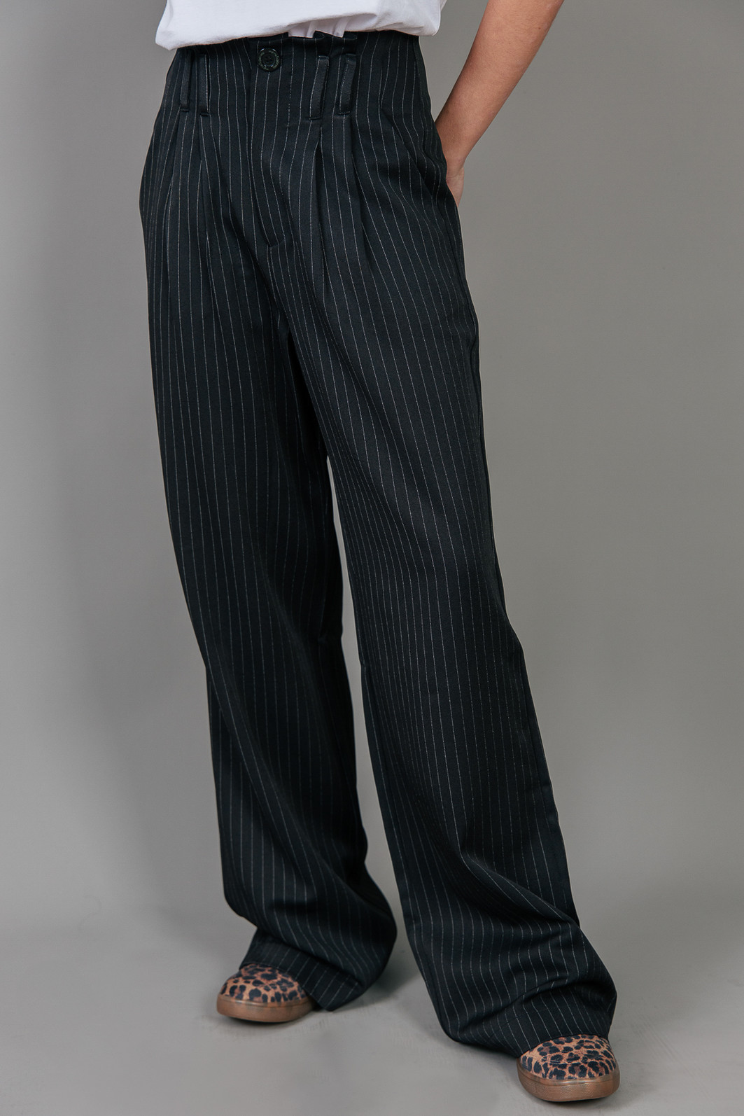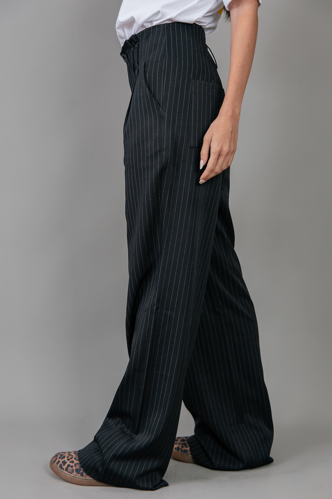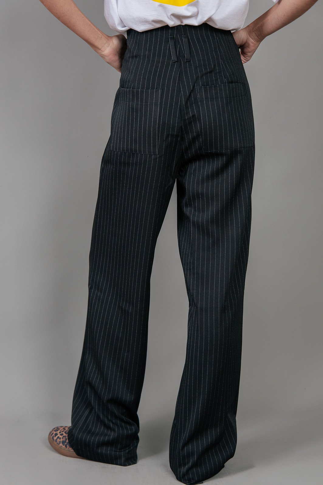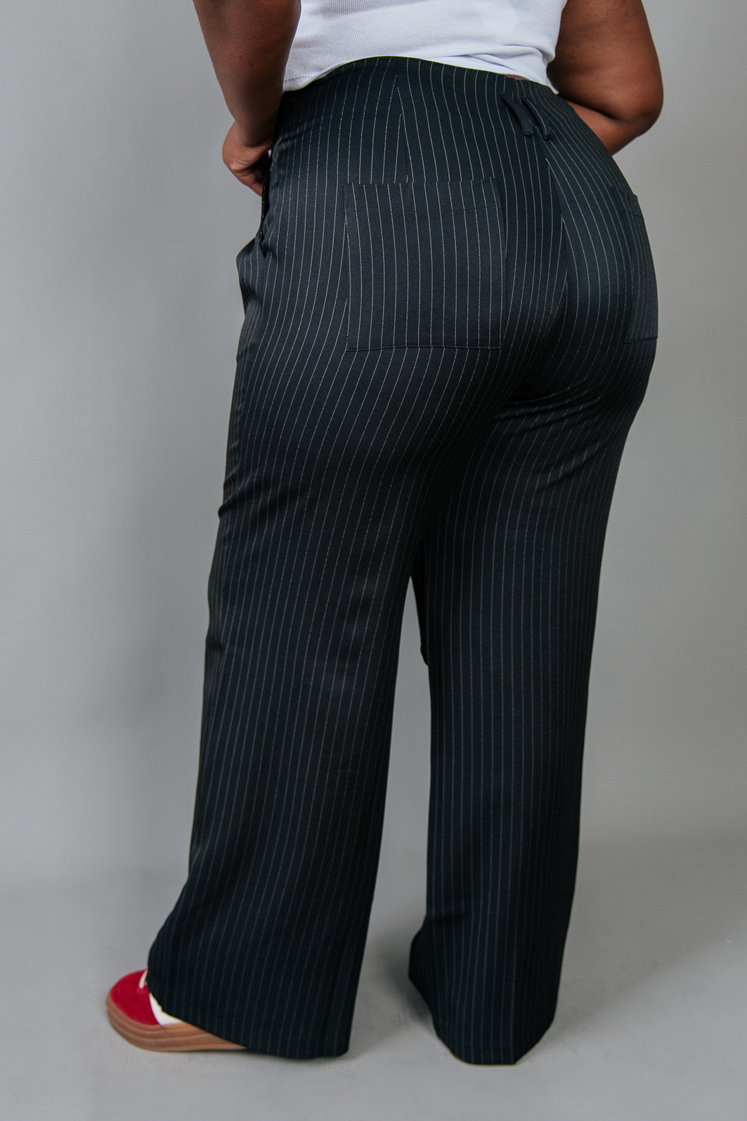 P E R F E I T A! Calça impecável, em tecido leve e fresco, ou seja você vai poder usar em várias estações. Modelagem mais retinha, em tecido plano preto com risca de giz cinza. Cintura alta com pregas, passantes para usar com cinto e bolsos laterais.