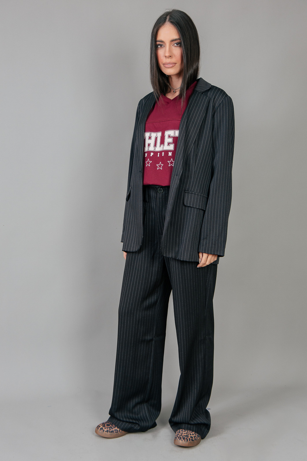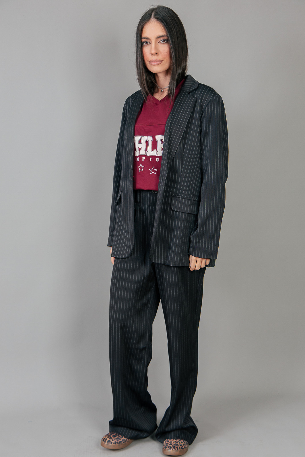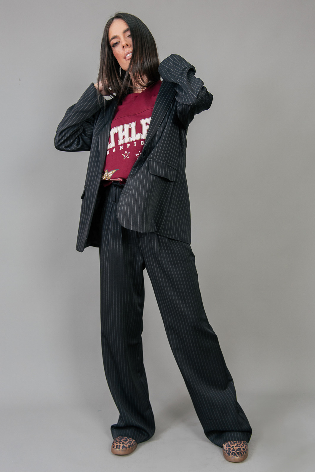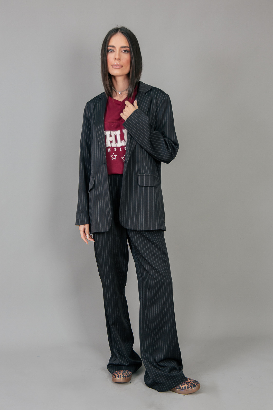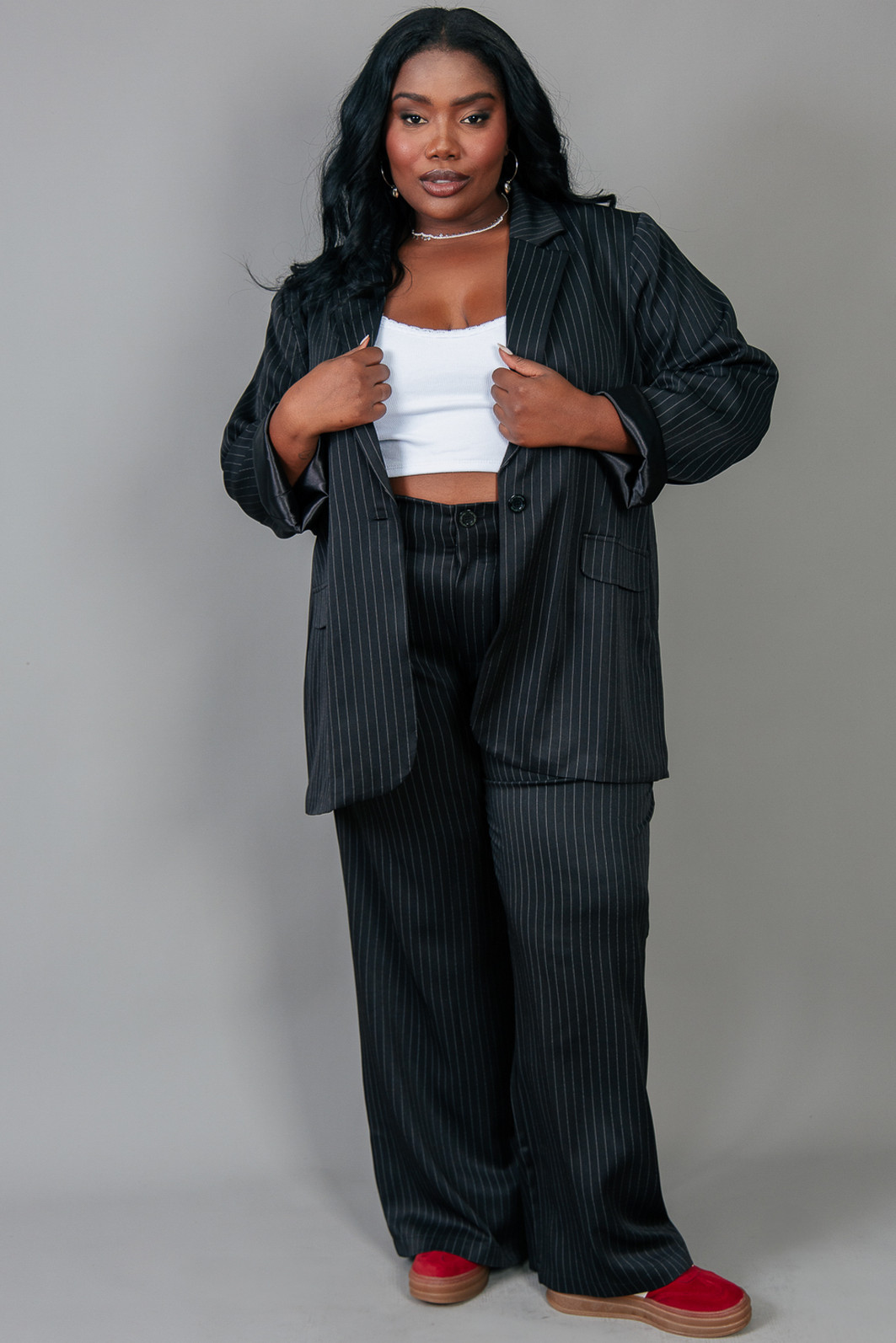 P E R F E I T A! Calça impecável, em tecido leve e fresco, ou seja você vai poder usar em várias estações. Modelagem mais retinha, em tecido plano preto com risca de giz cinza. Cintura alta com pregas, passantes para usar com cinto e bolsos laterais.