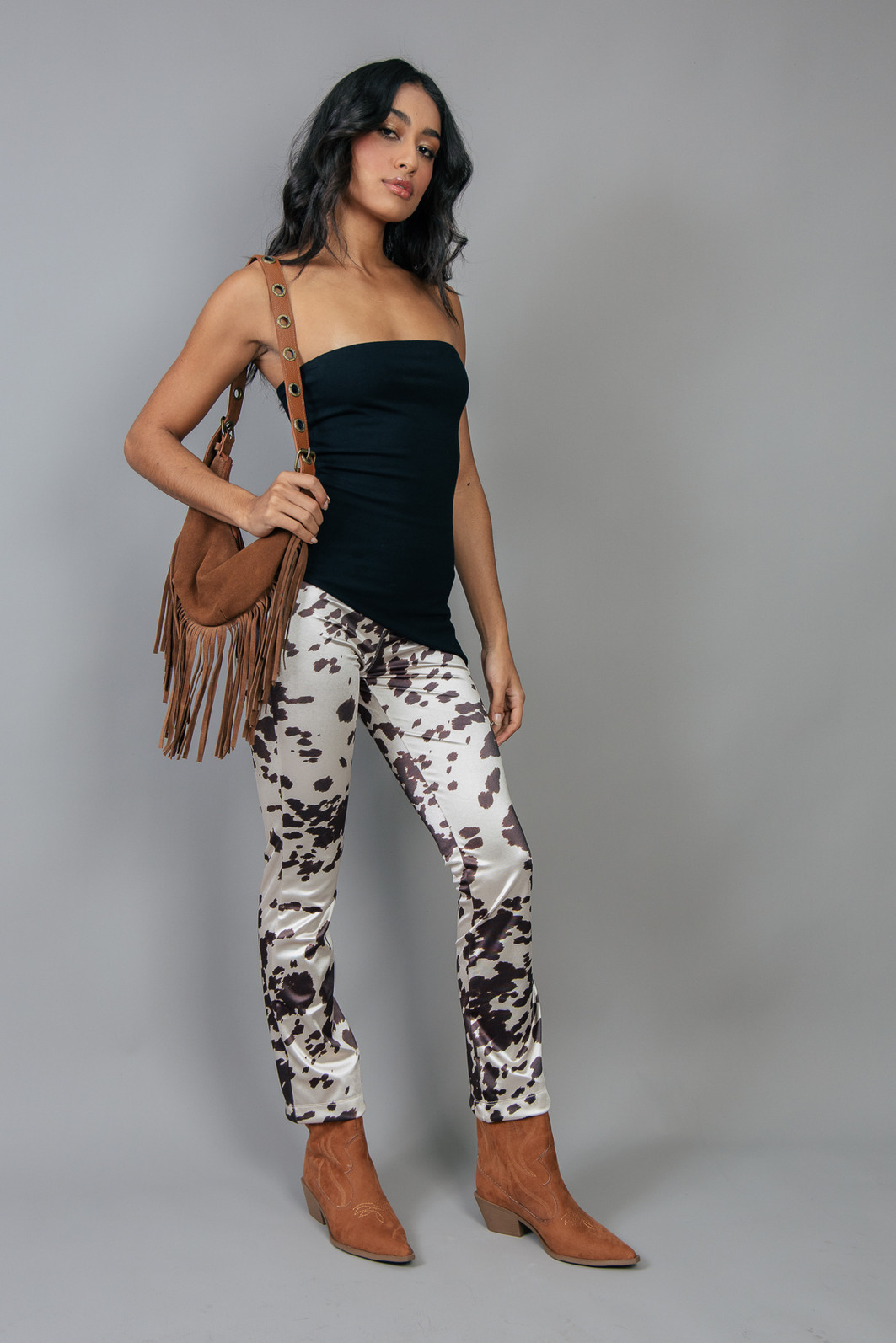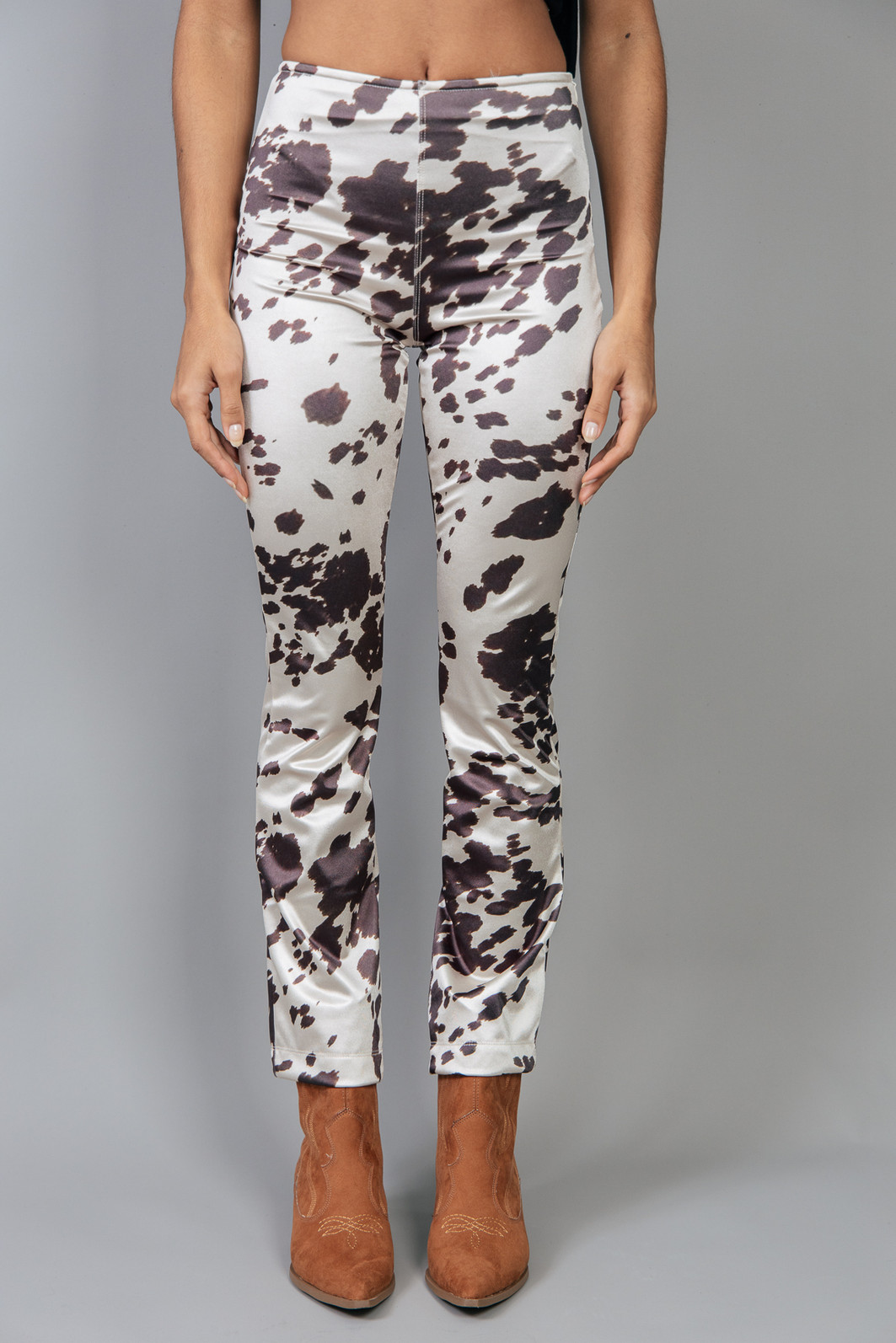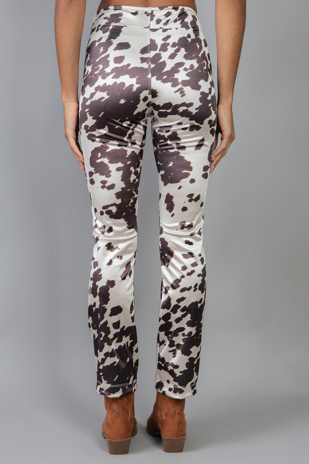 Calça em tecido super diferente, brilhoso e confortável pois possui elastano. Com estampa de animal print. Cintura mais alta com zíper para fechar.