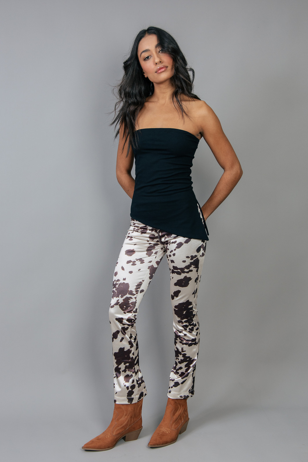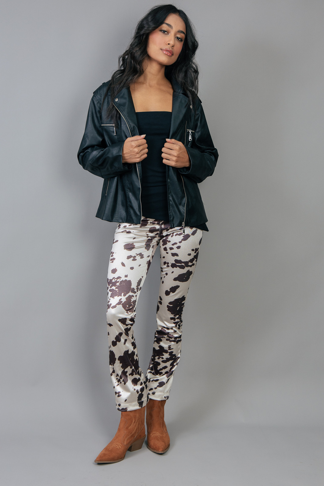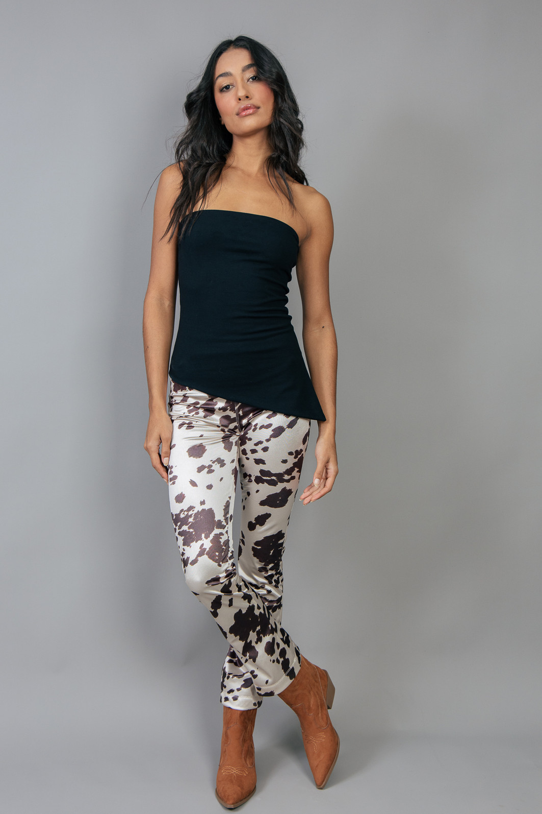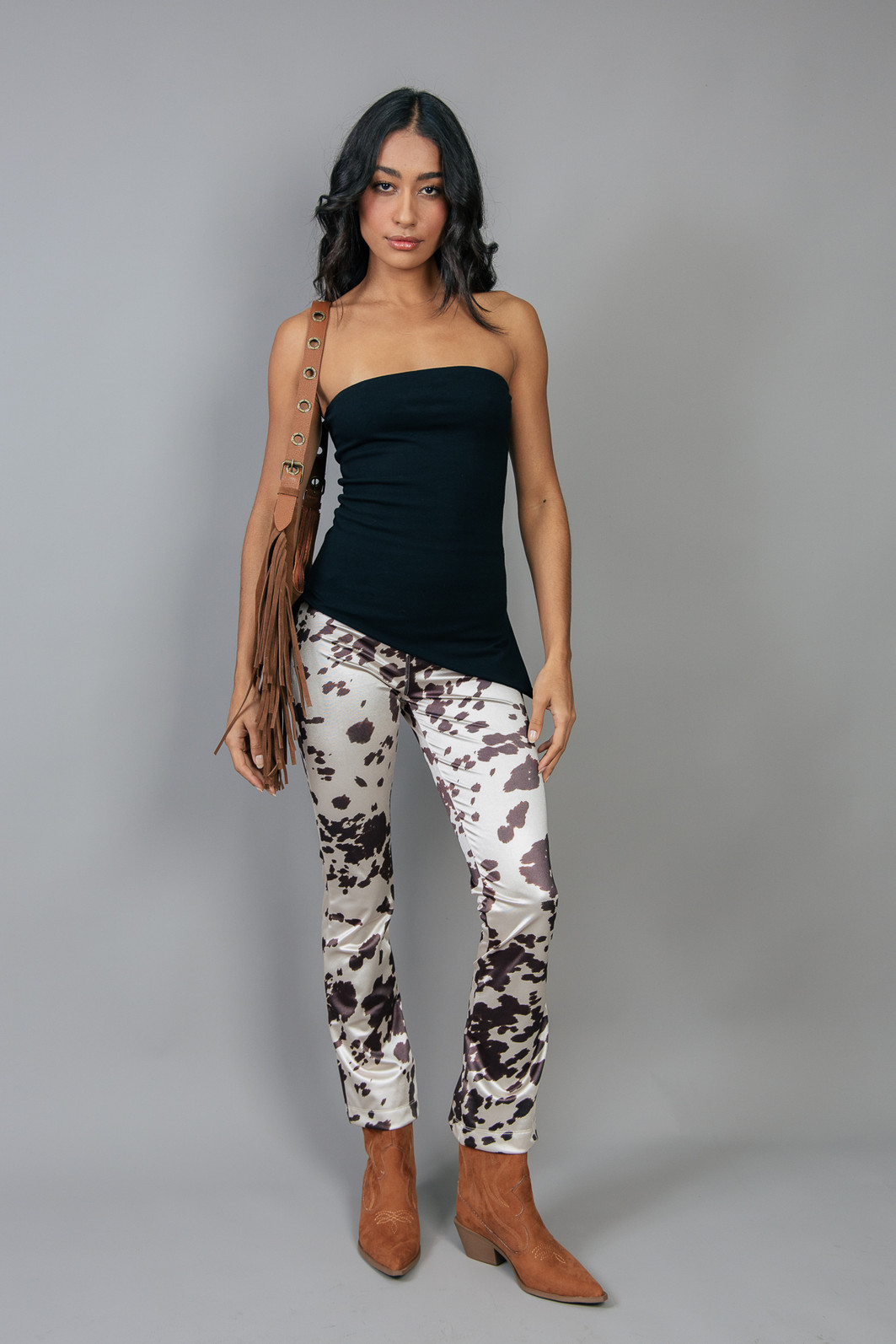 Calça em tecido super diferente, brilhoso e confortável pois possui elastano. Com estampa de animal print. Cintura mais alta com zíper para fechar.
