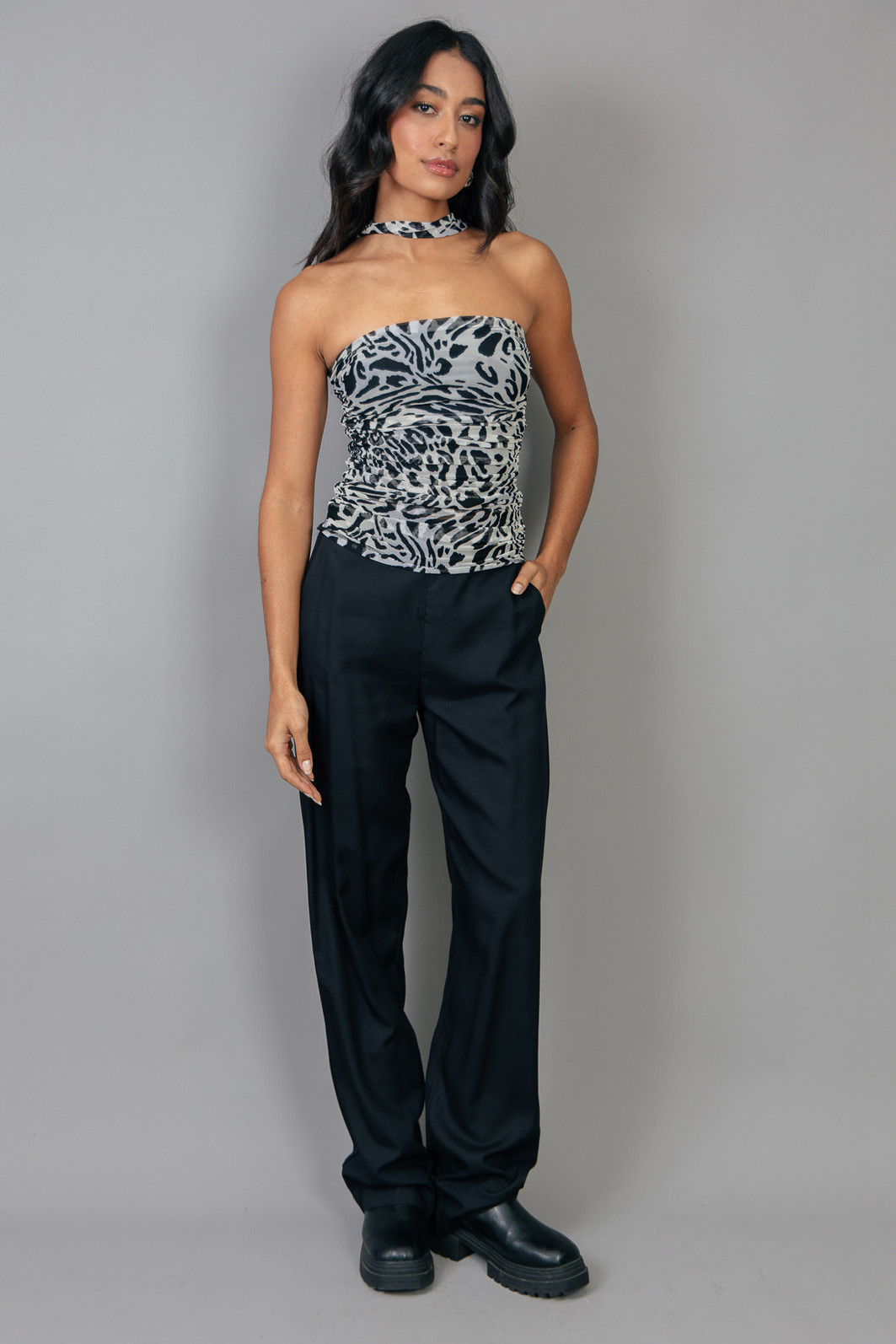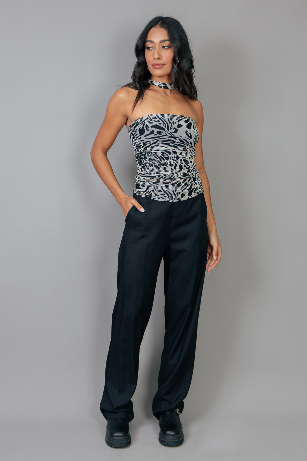 Calça estilo alfaiataria em modelagem reta. Tecido super leve na cor preta. Possui elástico na parte de trás e zíper na lateral para melhor vestir.