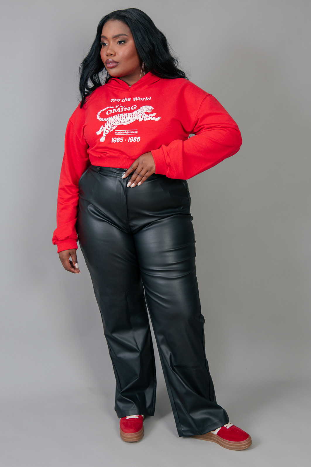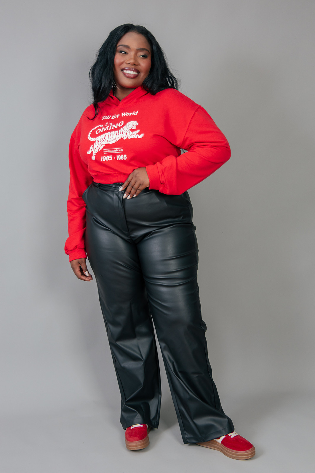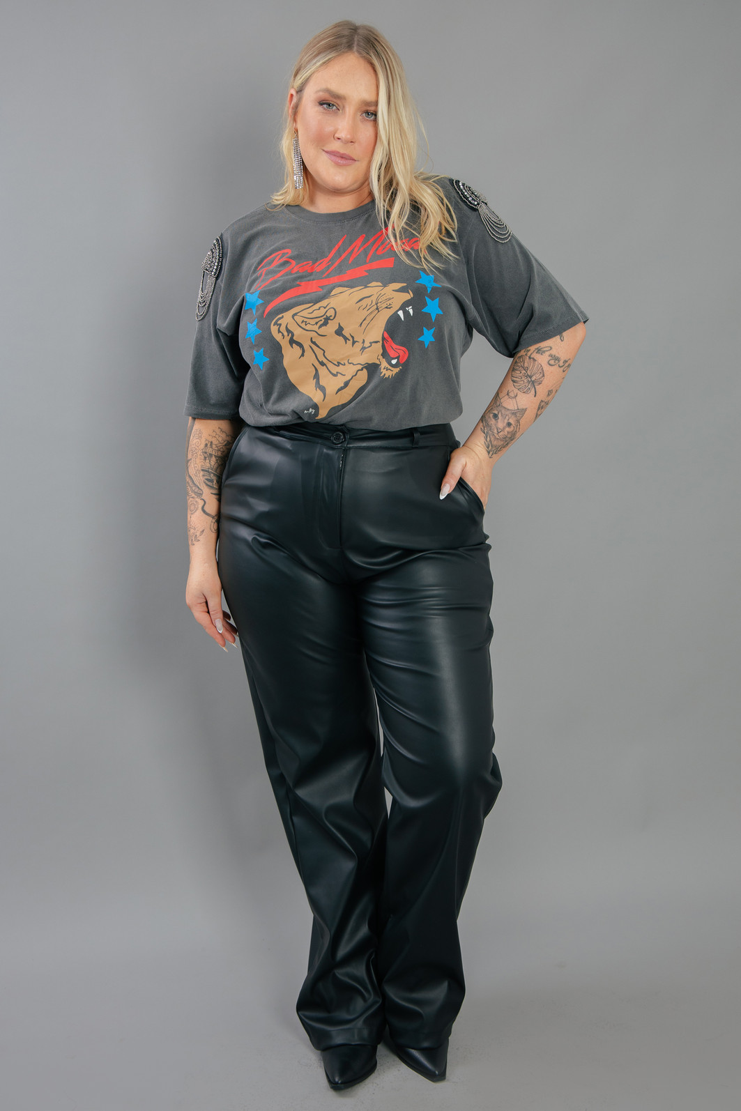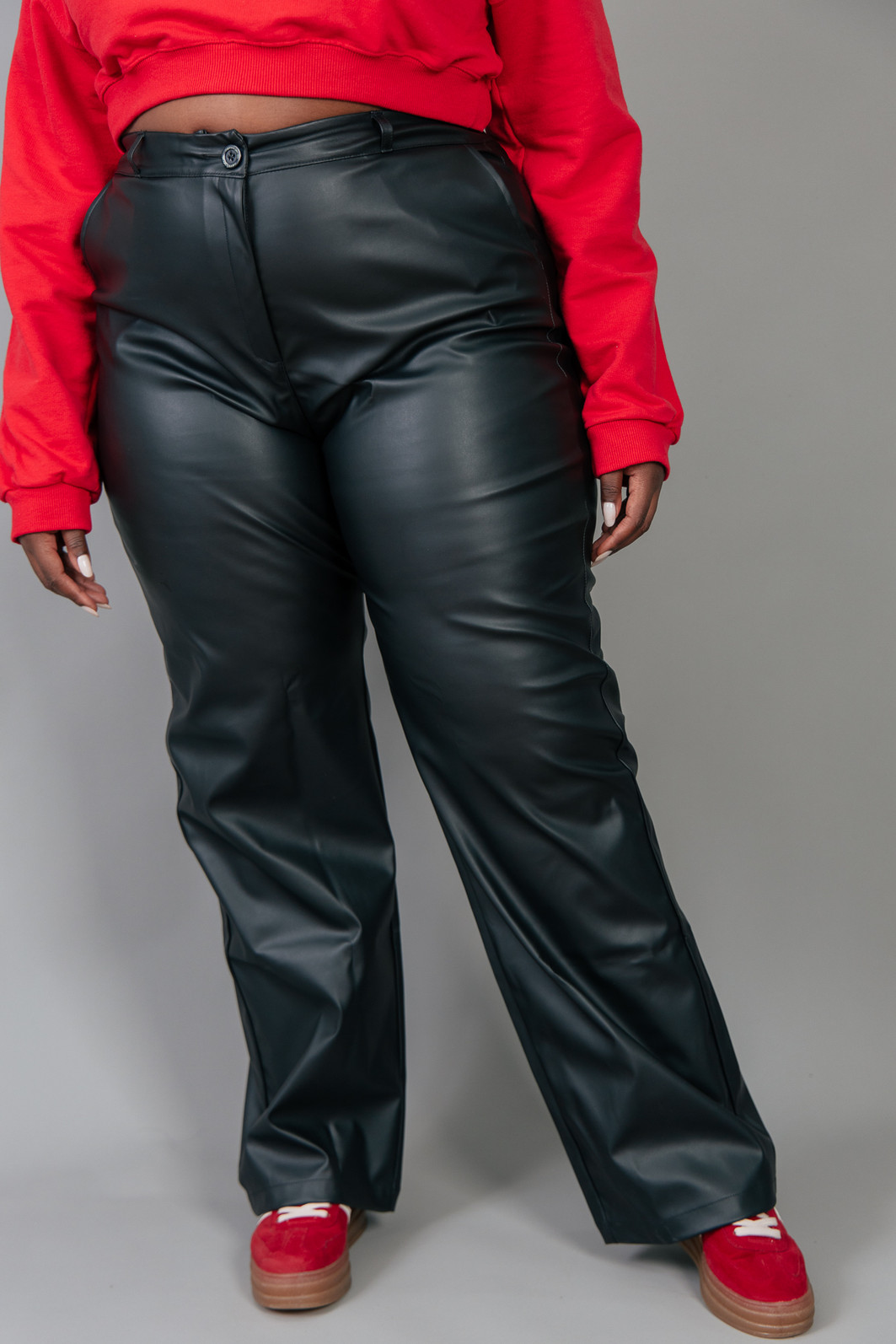Calça em napa cor preta. Não tem elastano na composição mas estica e é super confortável. A modelagem é tipo wide com a cintura alta e pernas mais solltas.