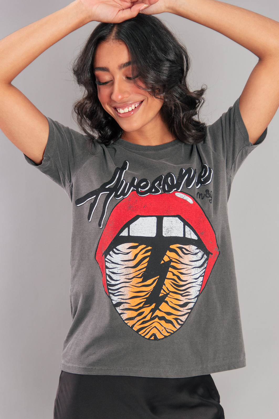 T-shirt com modelagem babylook, aquela bem mais certinha no corpo. Em malha super leve e macia na cor chumbo estonado. Estampa best seller.