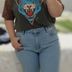 T-shirt em modelagem boyfriend, em malha super leve e macia tingida e estonada na cor chumbo. Com mangas em tule de oncinha e estampa localizada frente.