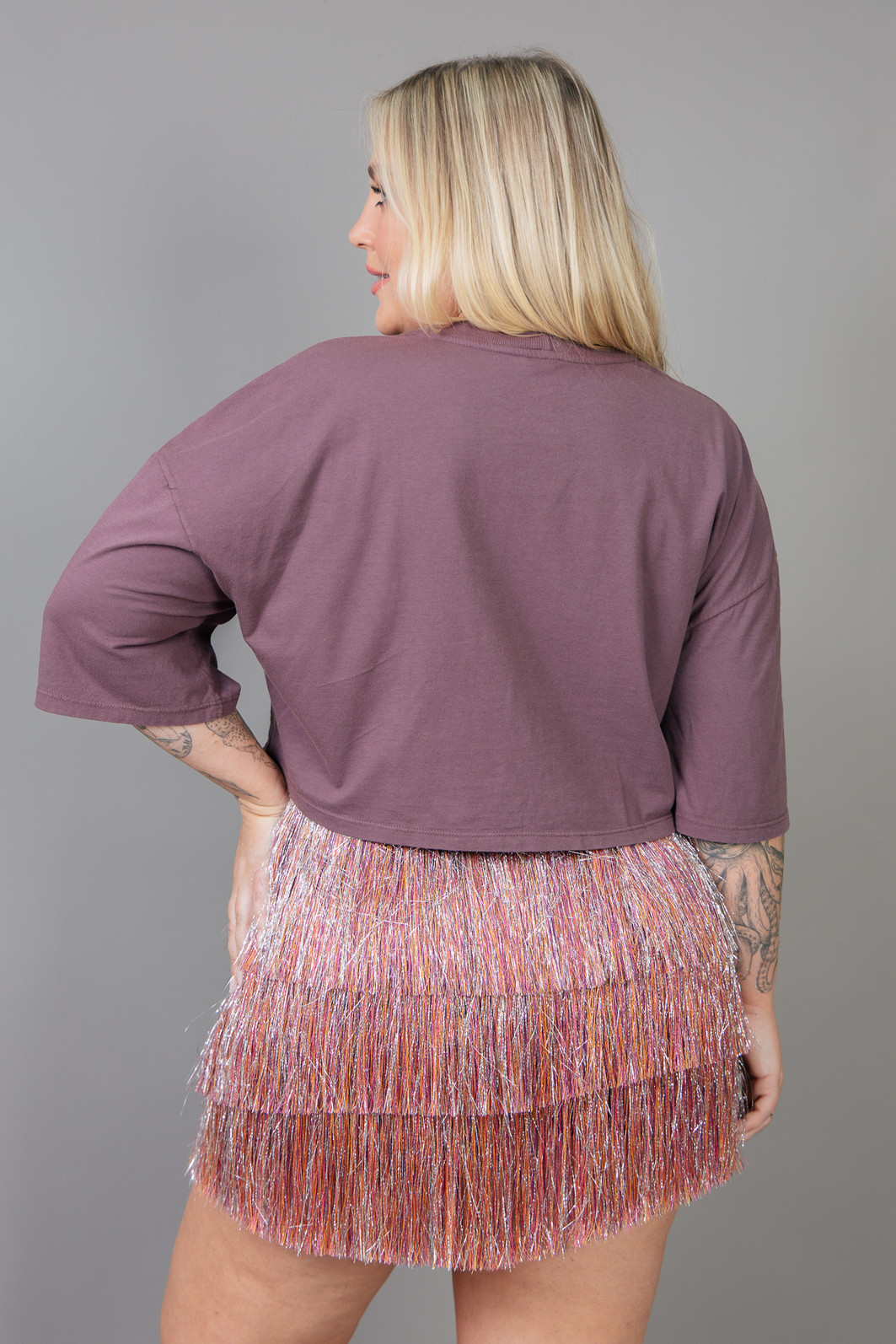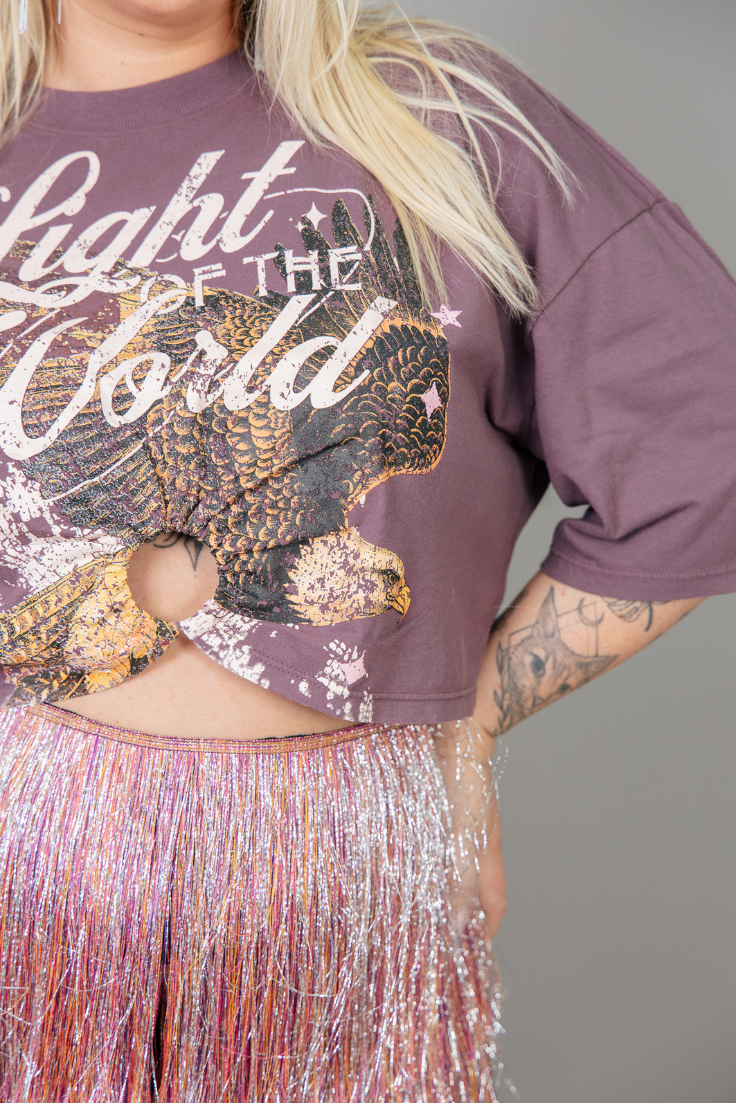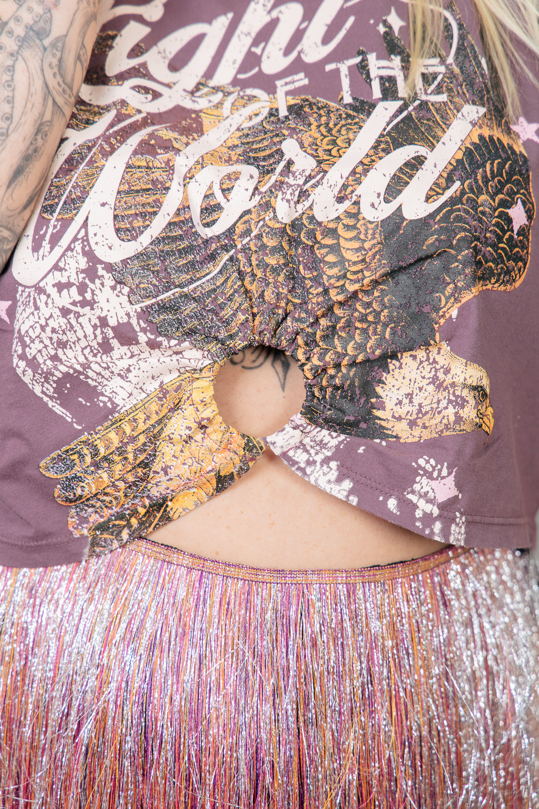 Camiseta com modelagem mais curtinha e com detalhe de argola de metal com franzido frente. Em malha super leve e macia tingida em um tom de roxo. Estampa localizada frente.