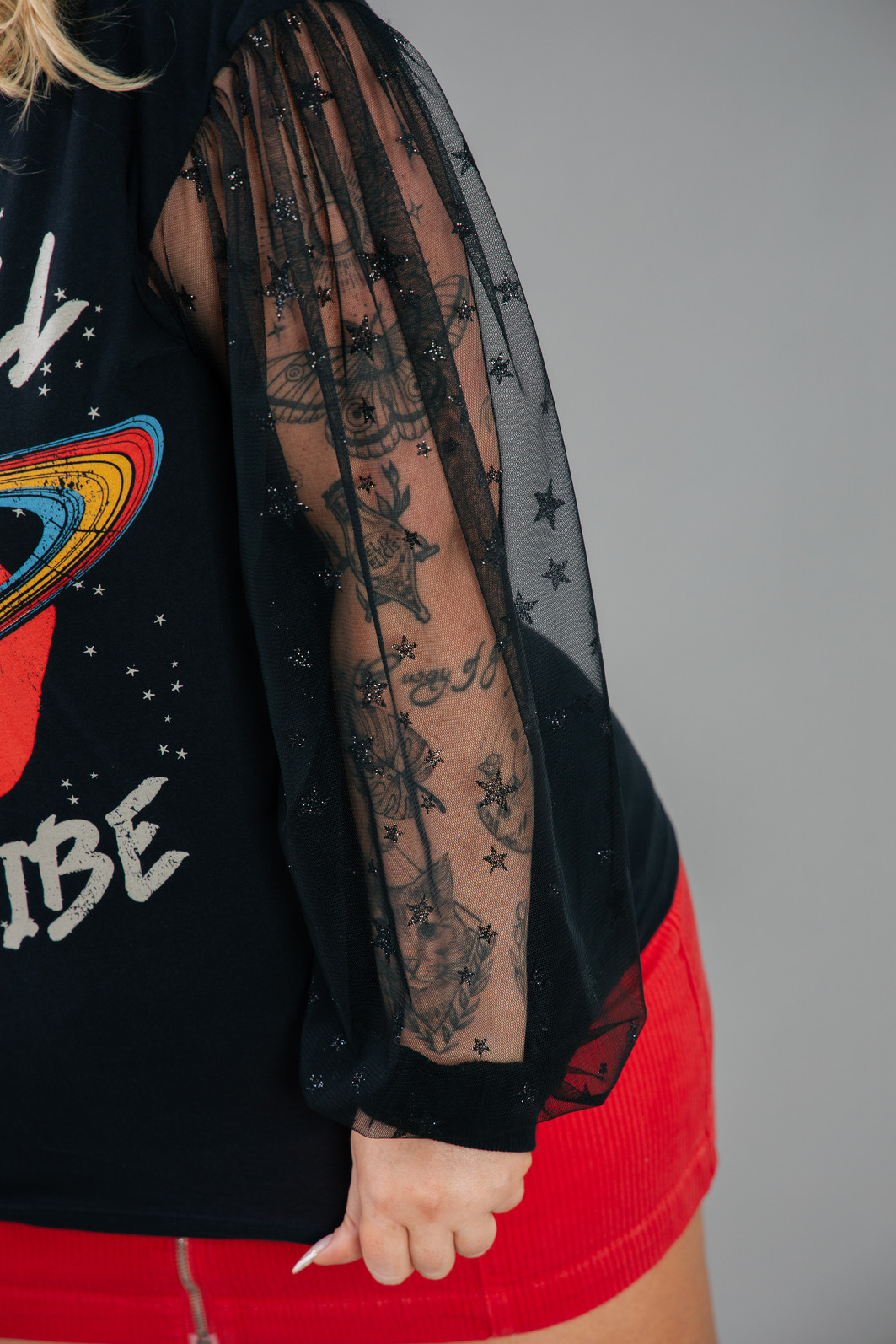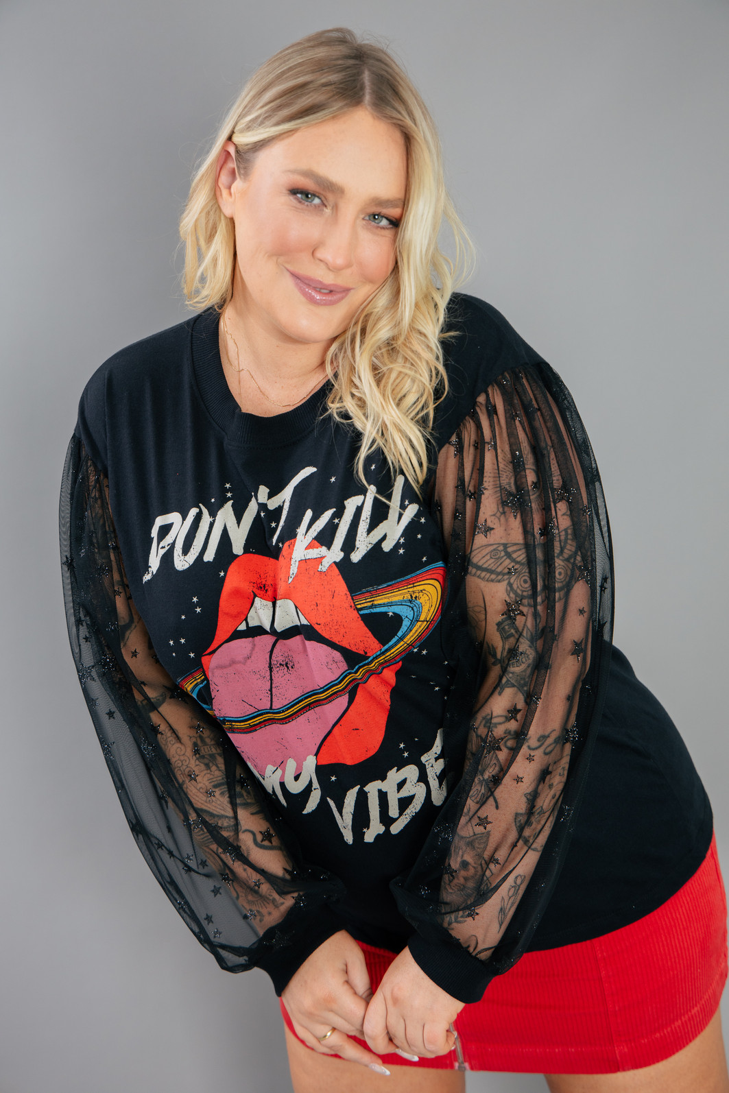 Camiseta com manga longa mais bufante em tule preto com estrelas em glitter preto. Corpo em malha preta, super leve e macia. Estampa frente bem exclusiva e colorida.