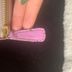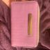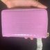 Carteira em material sintético com textura e brilho vinil na cor lavanda/lilás. Fecho em zíper dourado. Interior com bastante espaço para cartões, moedas e dinheiro.