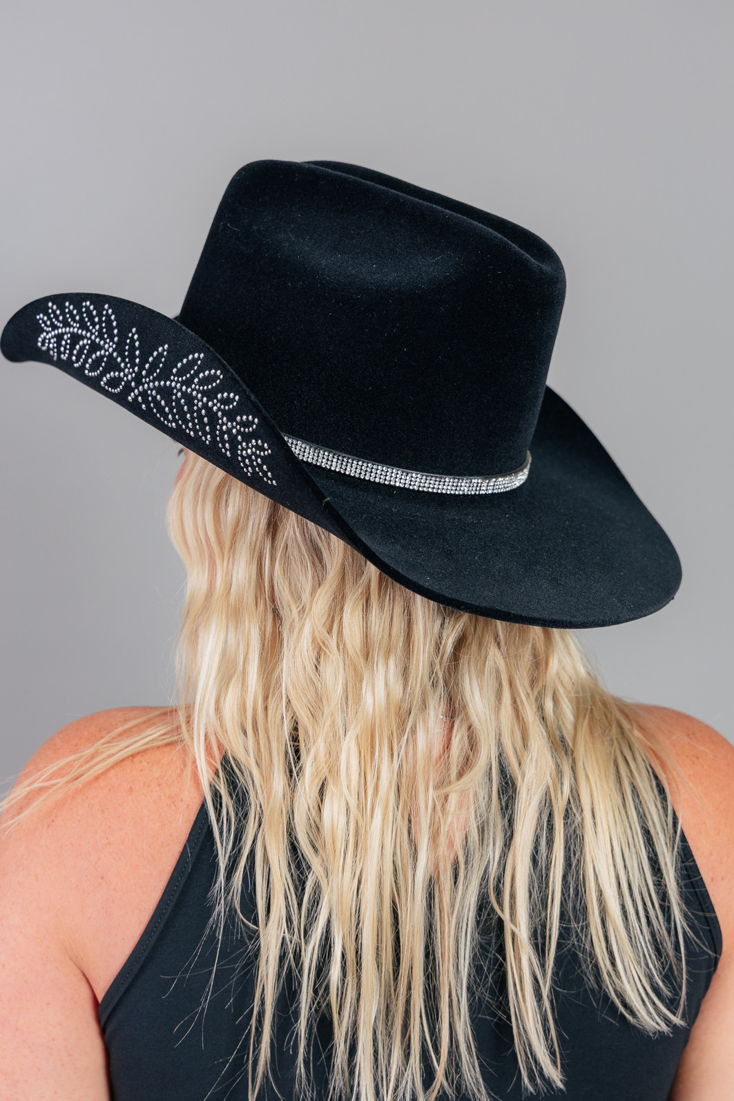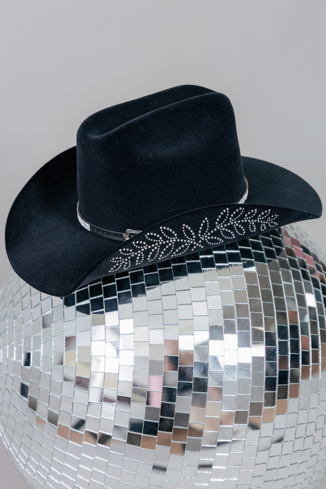 Chapéu rígido em material de camurça preto aveludado. Acessório com fivela e aplique de strass para decorar.