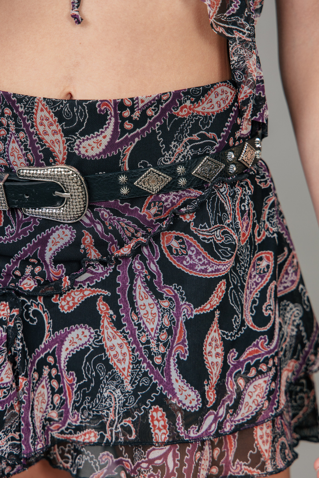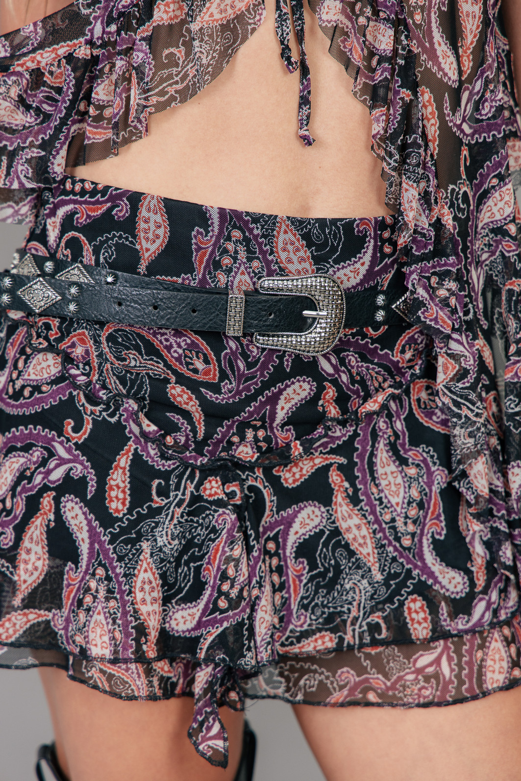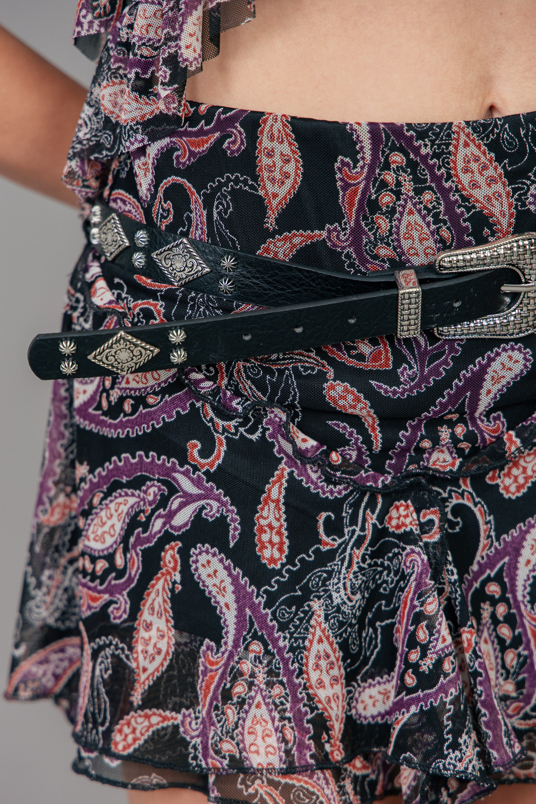 Cinto em material sintético na cor preta com aviamentos metálicos.