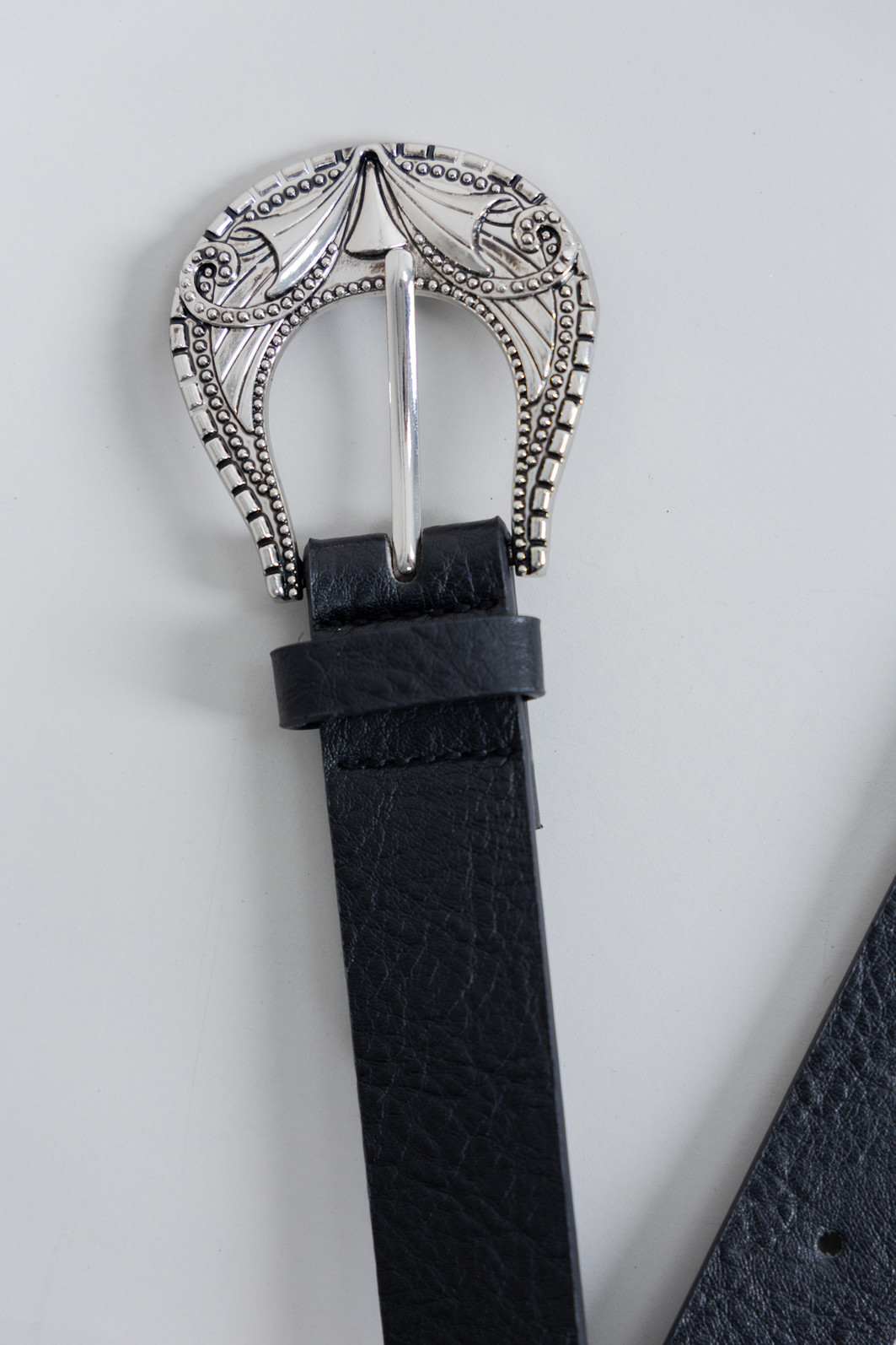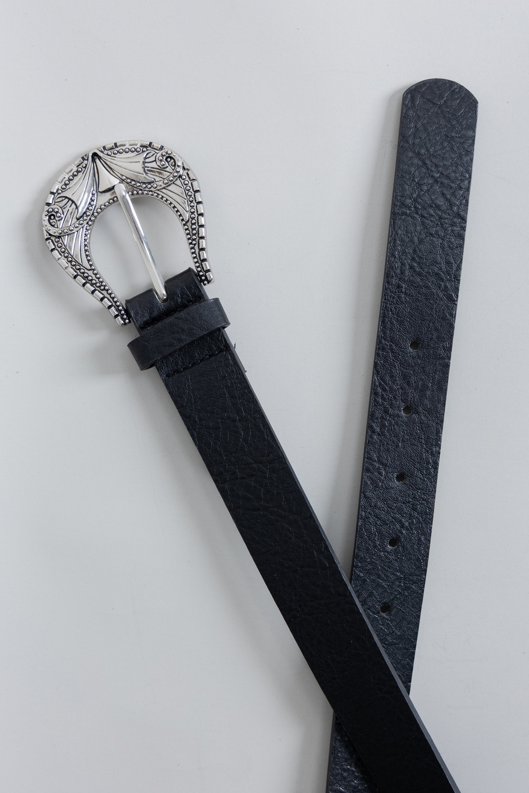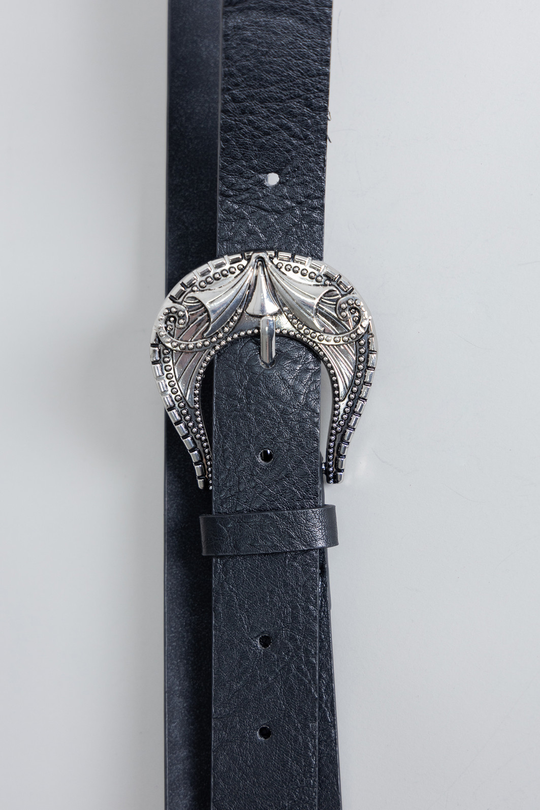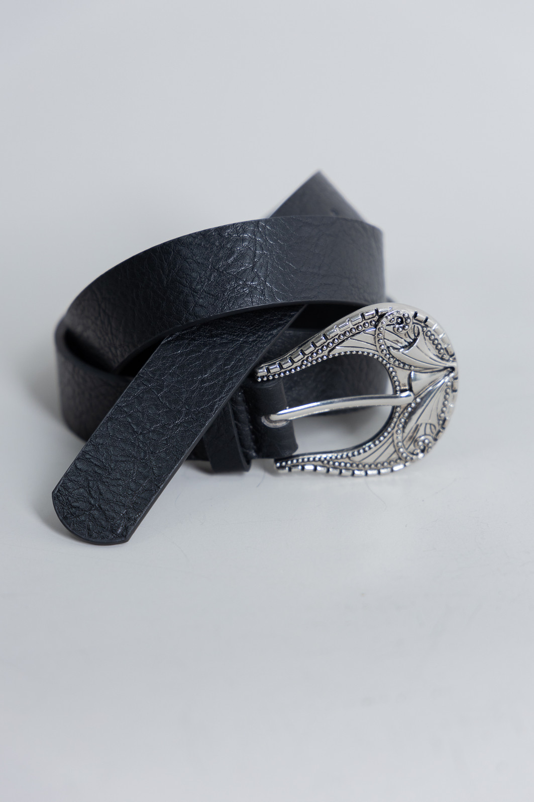 Cinto em material sintético que imita couro na cor preta. Fivela bem detalhada em cor níquel.
