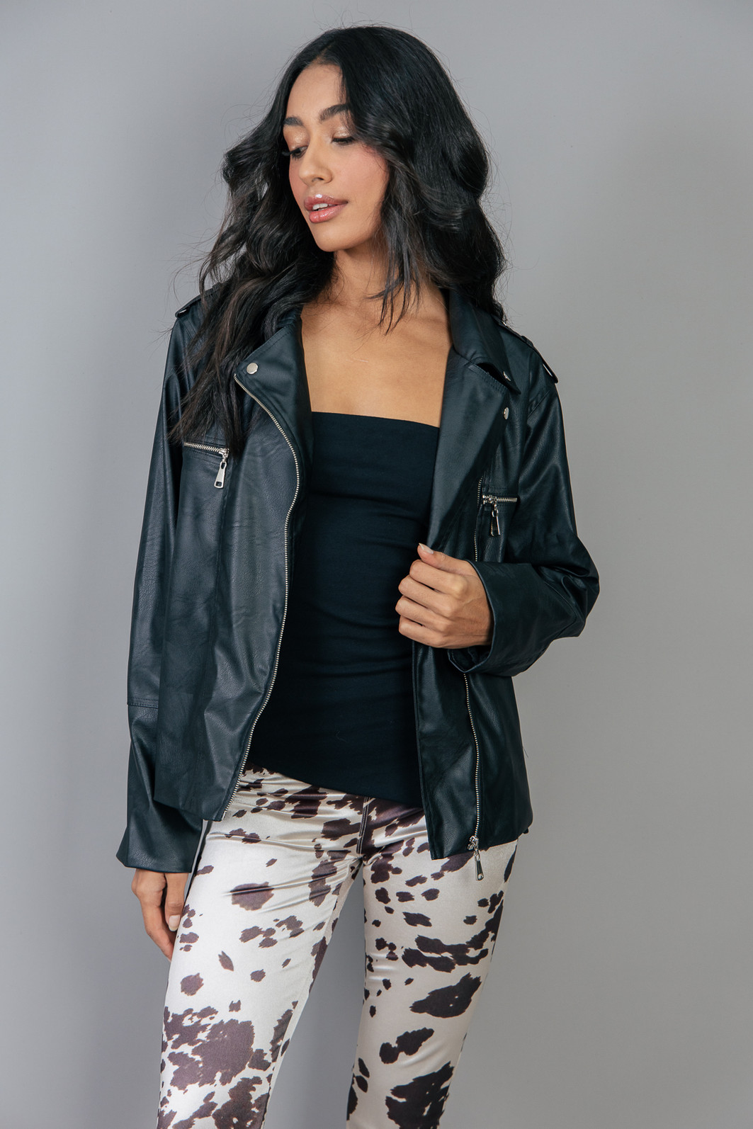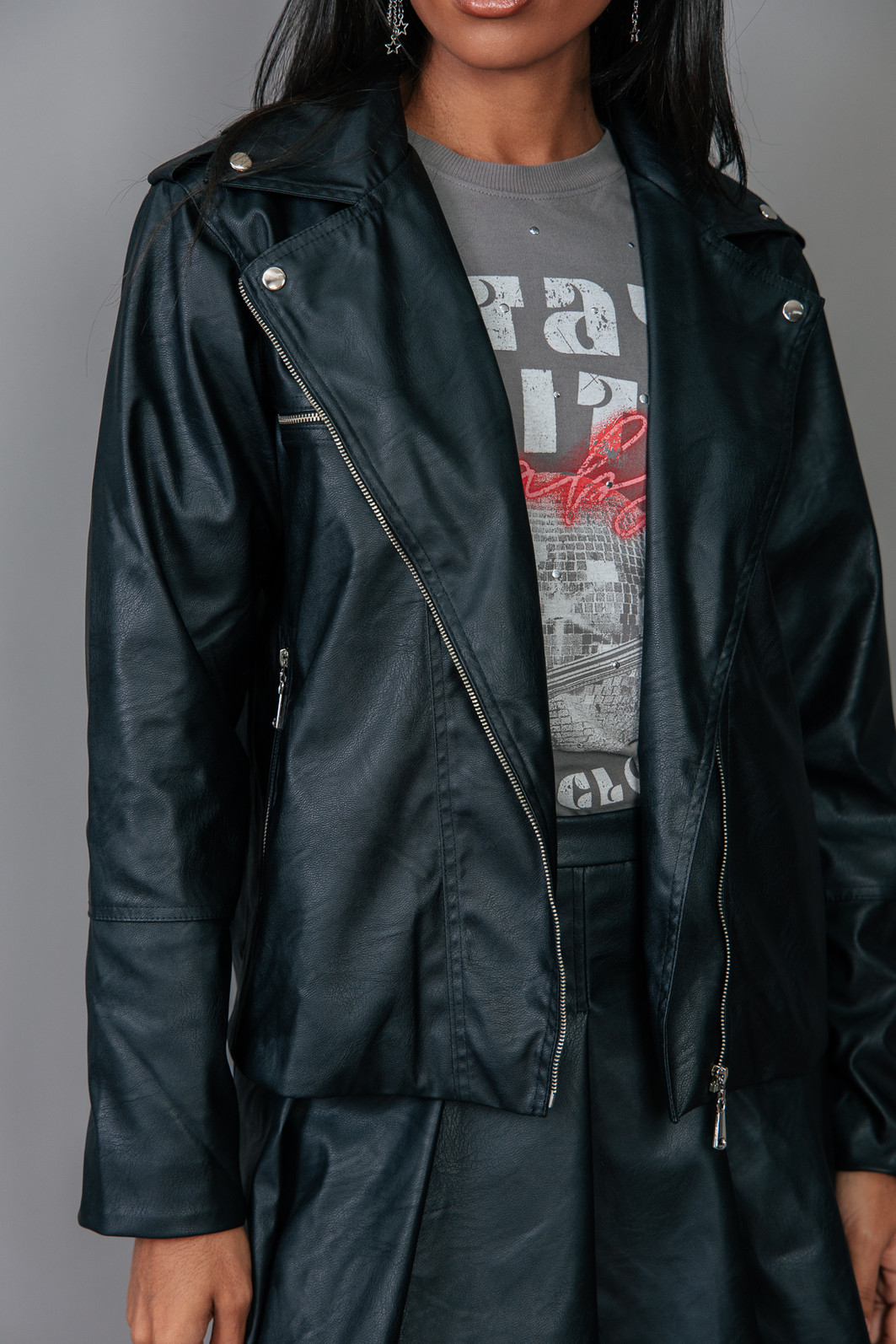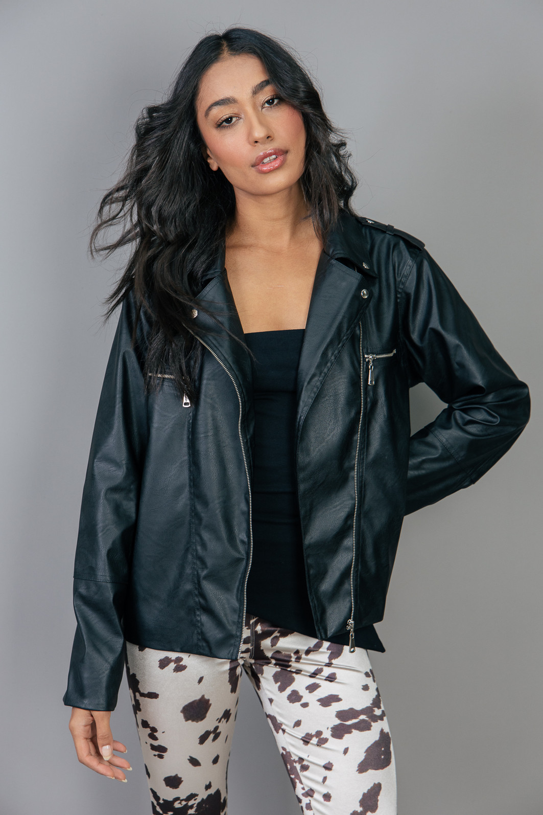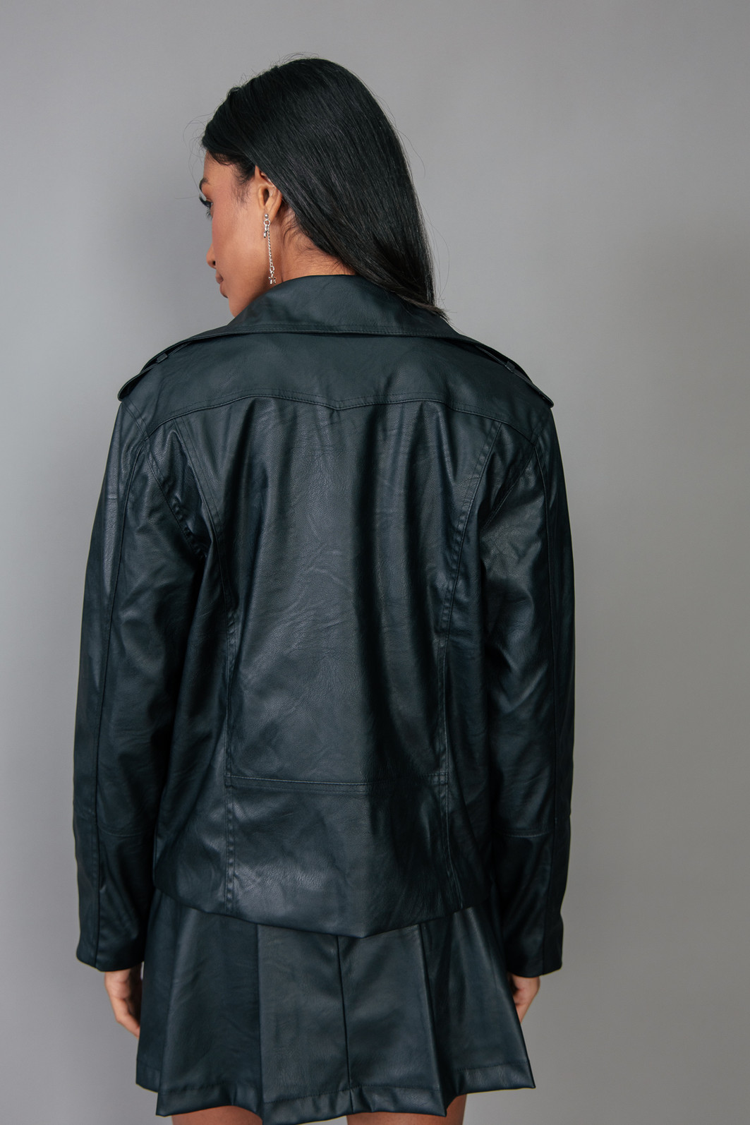 Jaqueta em tecido mais fino e leve sintético PU na cor preta. Super confortável pois possui elastano na composição. Possui bolsos com zíper frente. Peça toda forrada.