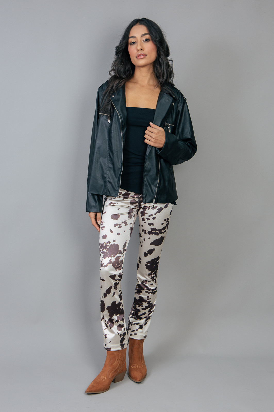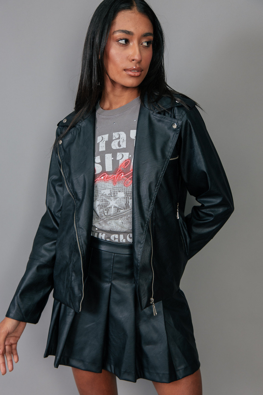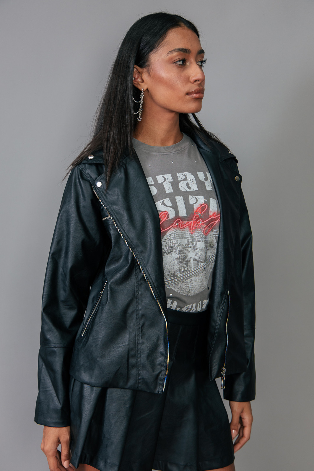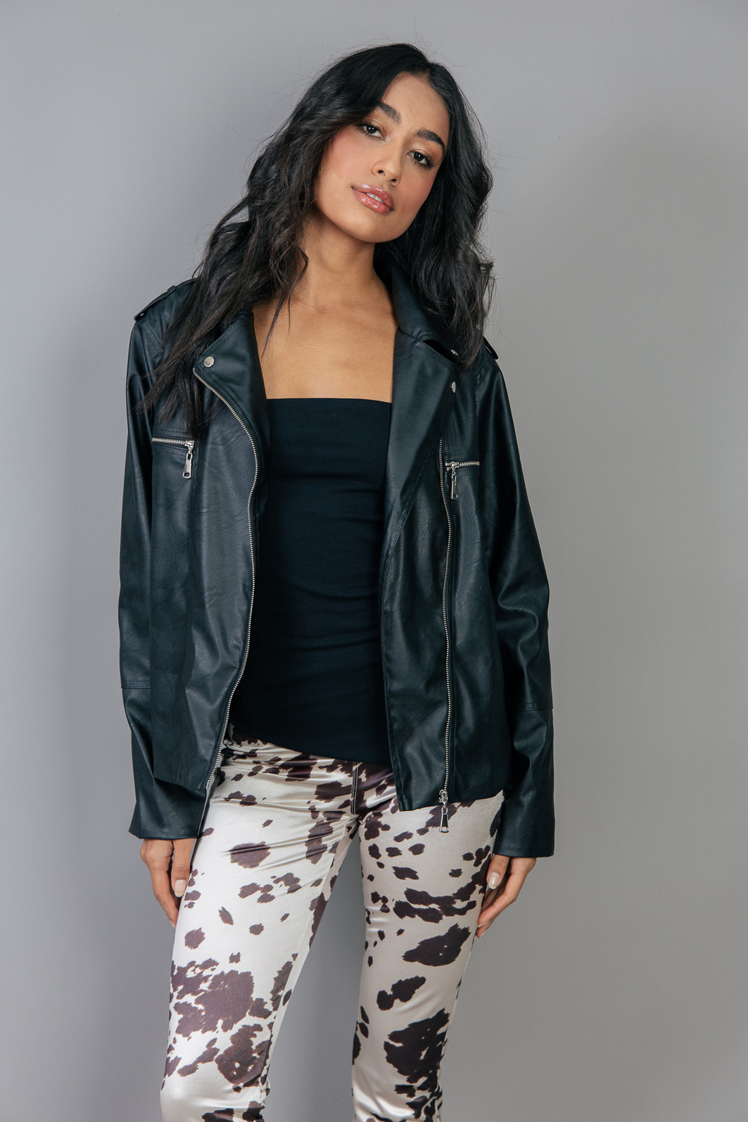 Jaqueta em tecido mais fino e leve sintético PU na cor preta. Super confortável pois possui elastano na composição. Possui bolsos com zíper frente. Peça toda forrada.
