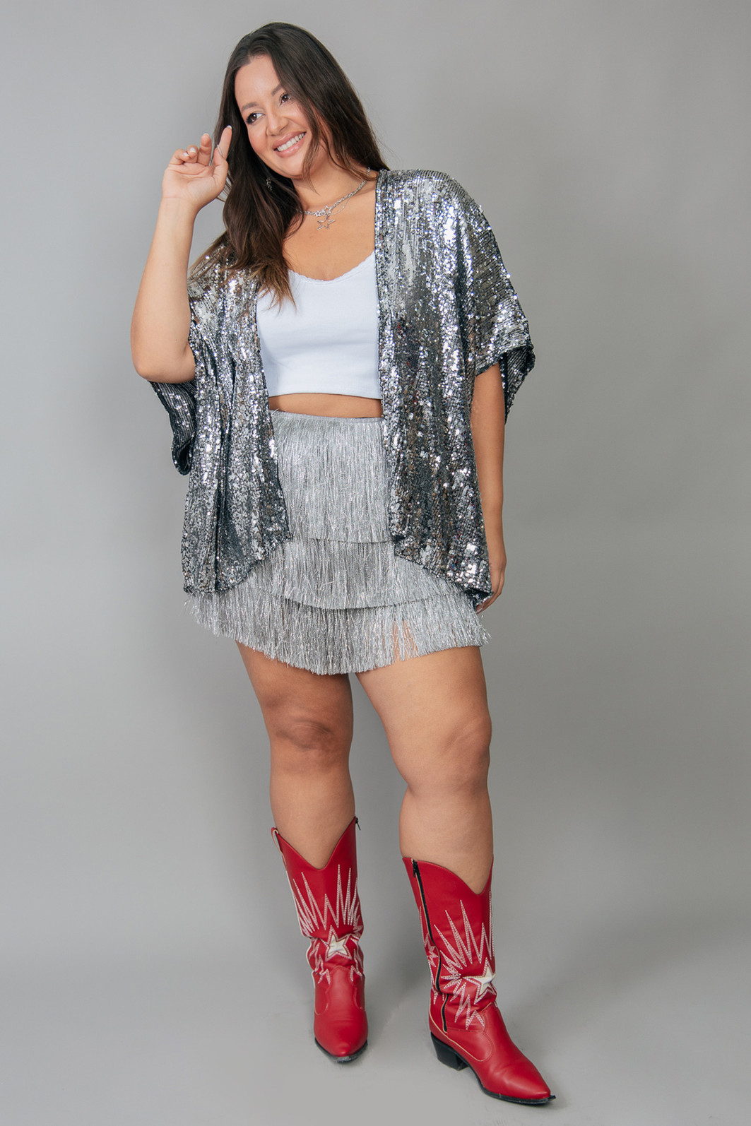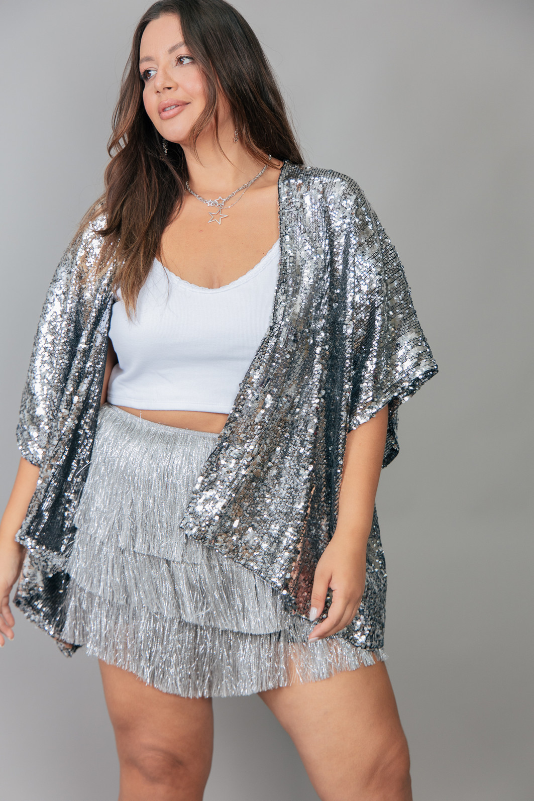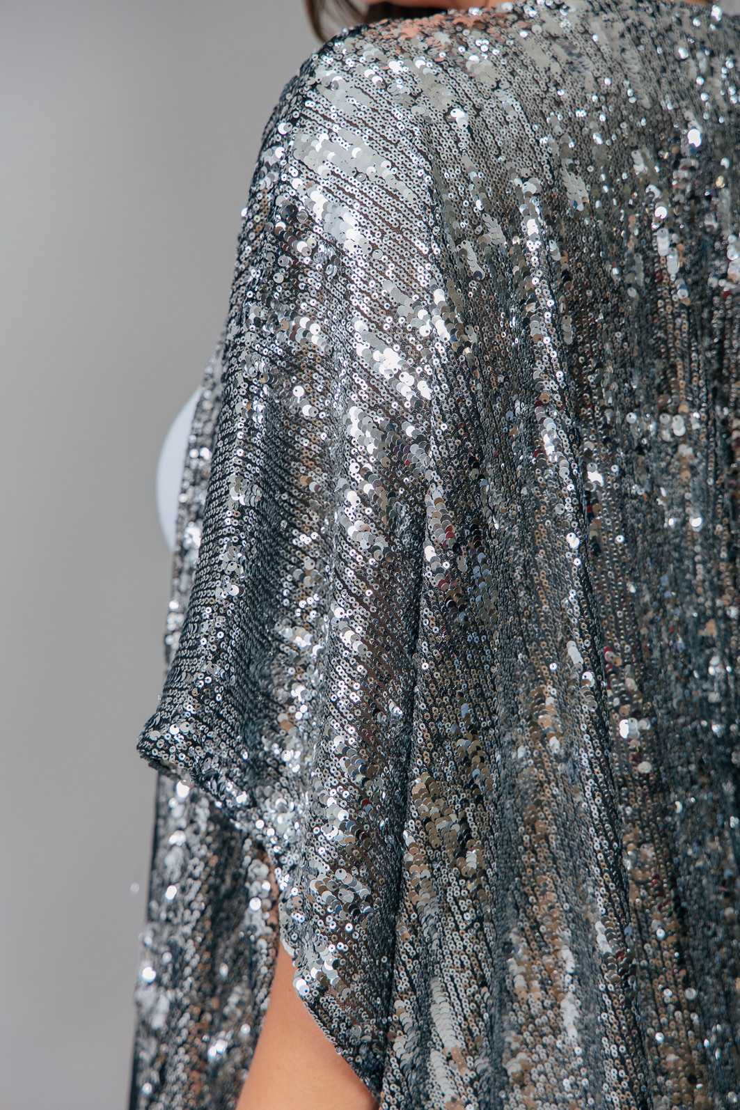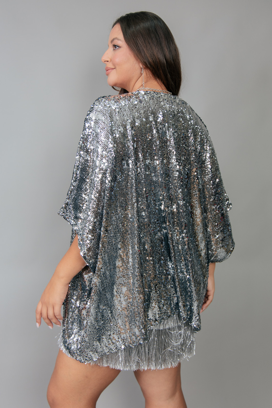 Kimono em base de tule com paetês bordados na cor prata em tamanhos irregulares. Modelagem mais ampla e soltinha.