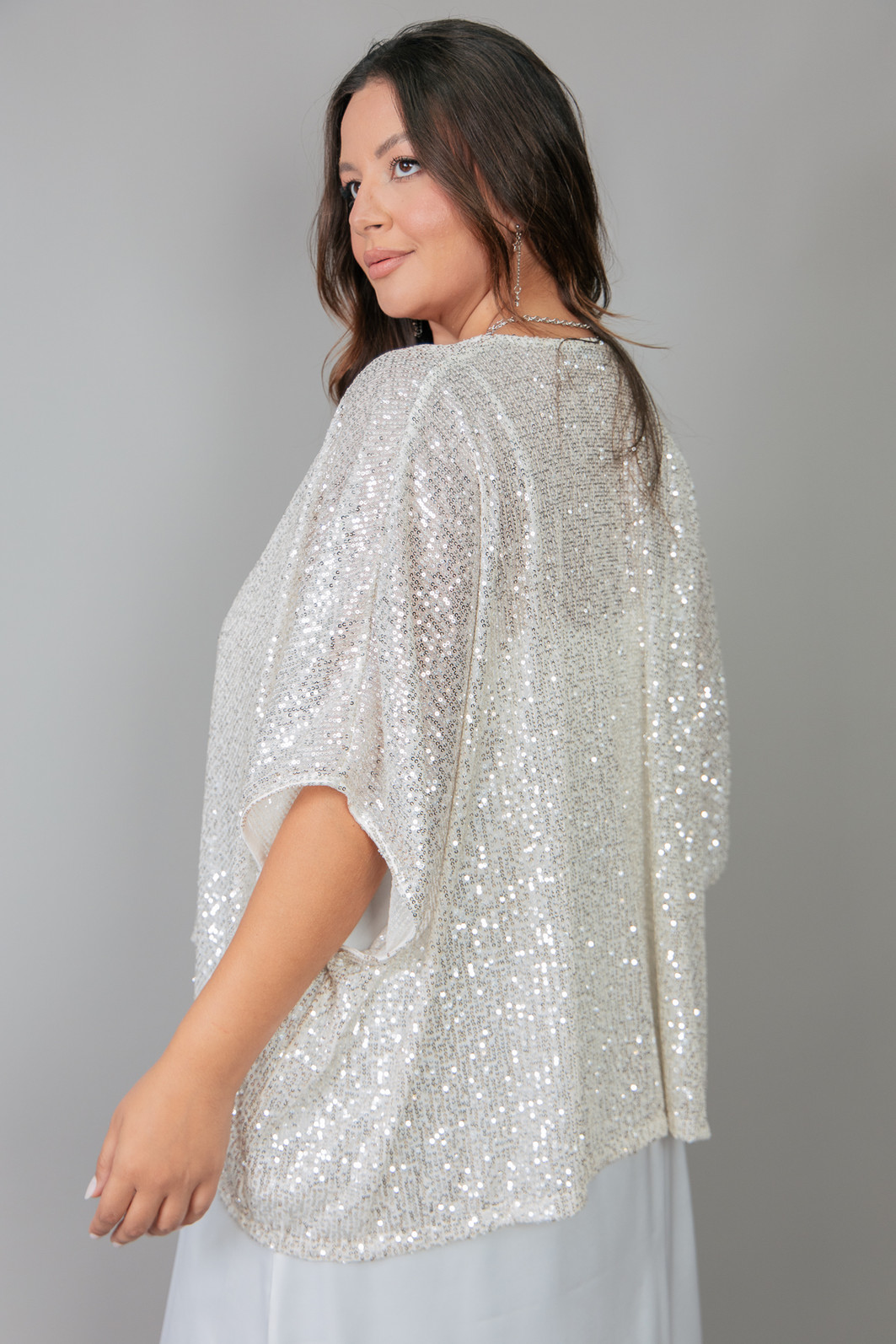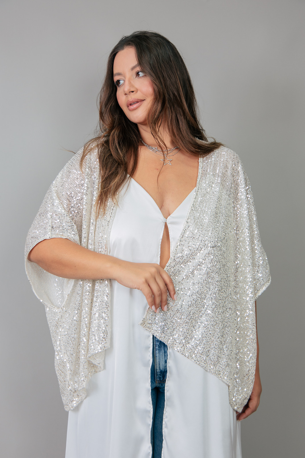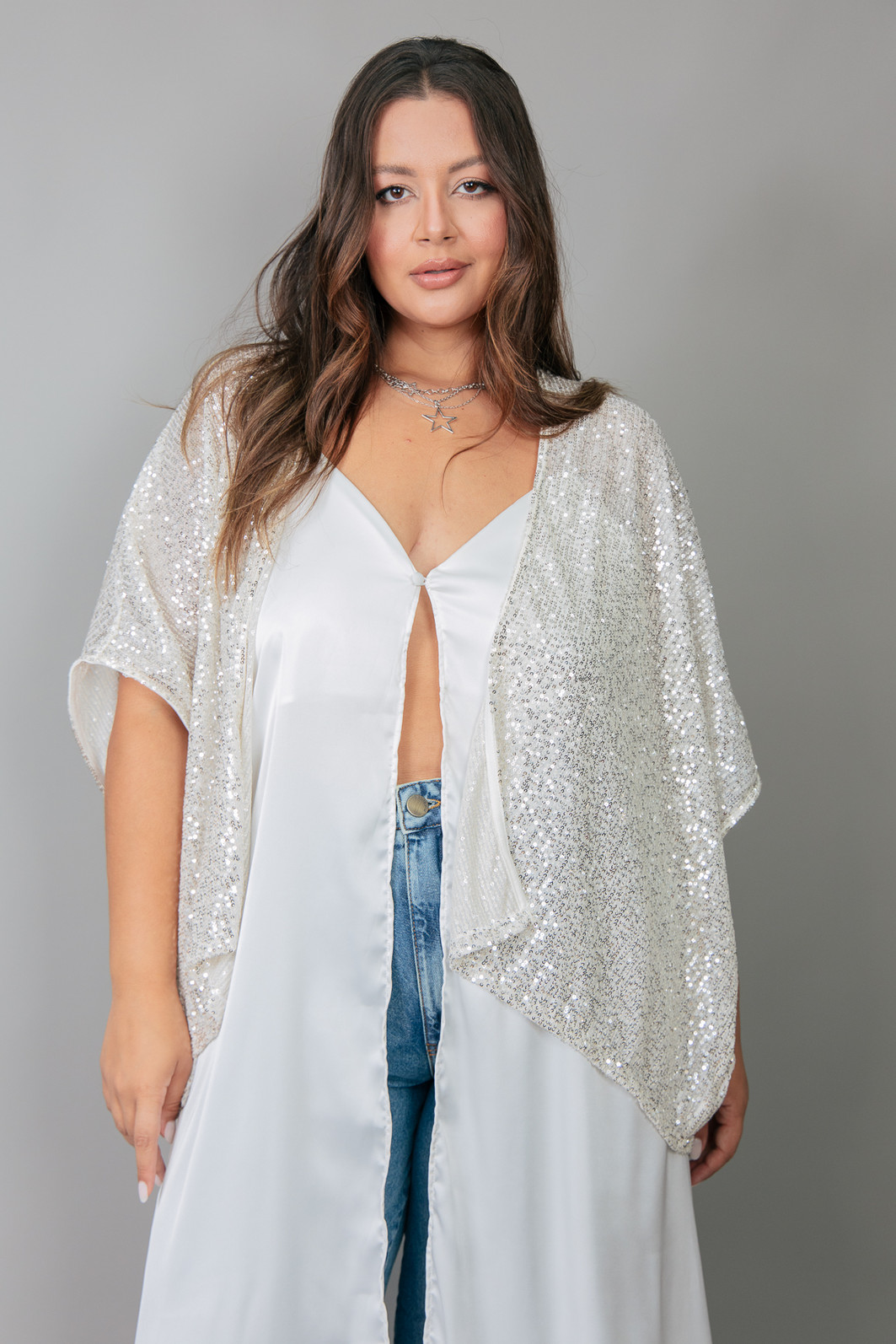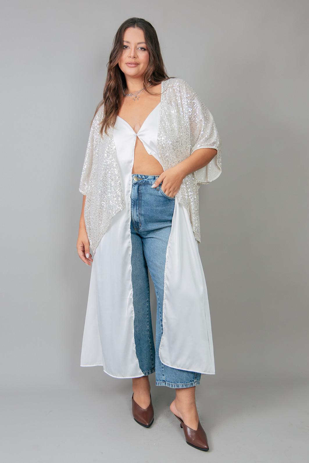 Aquela terceira peça indispensável para brilhar muito! Kimono em tecido base de tule nude com paetês prata. Modelagem bem quadradona e ampla.
