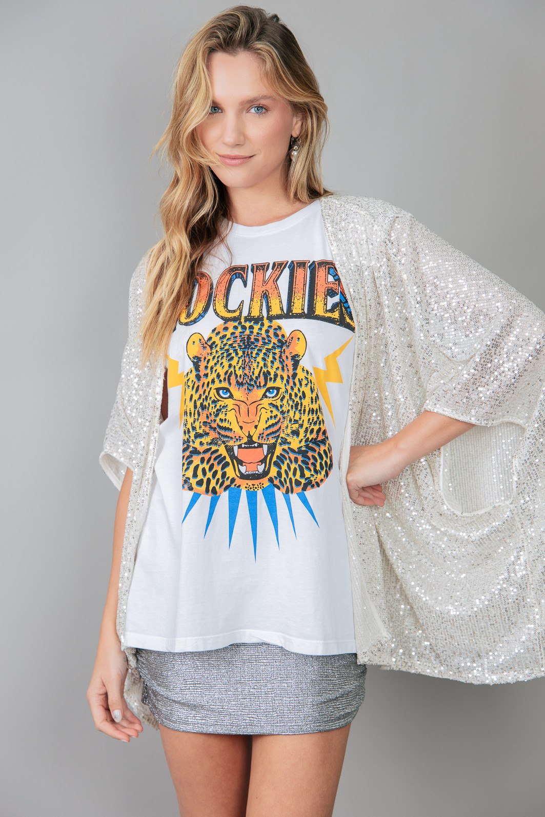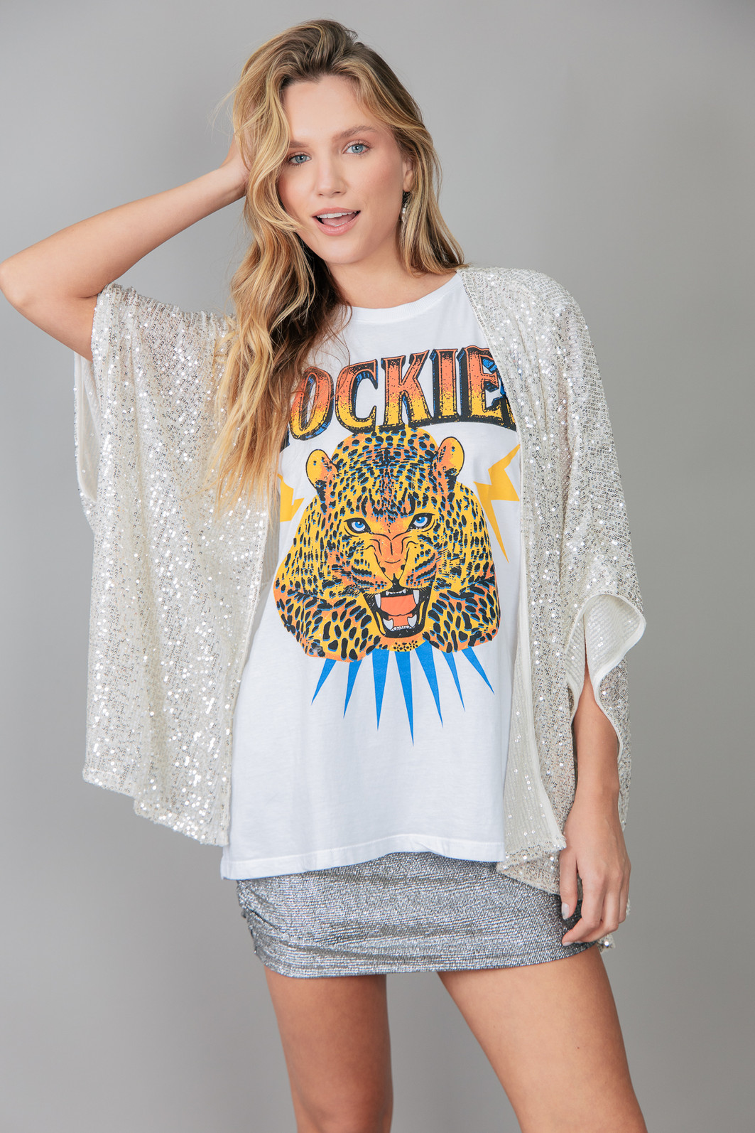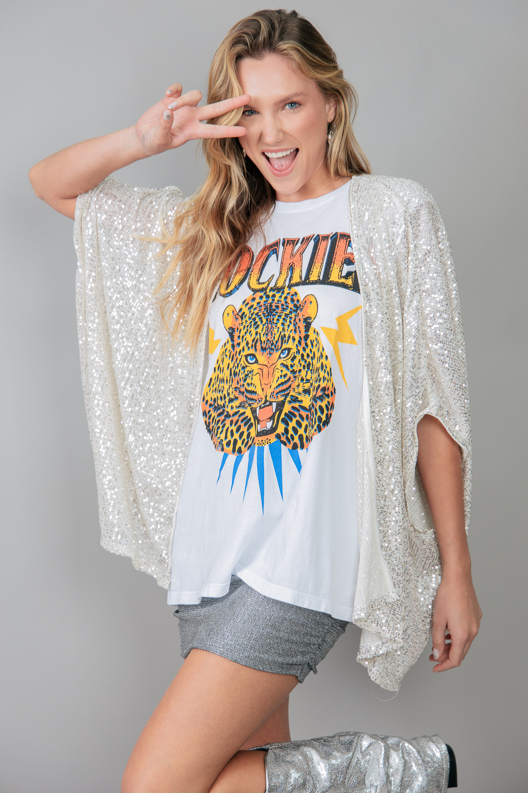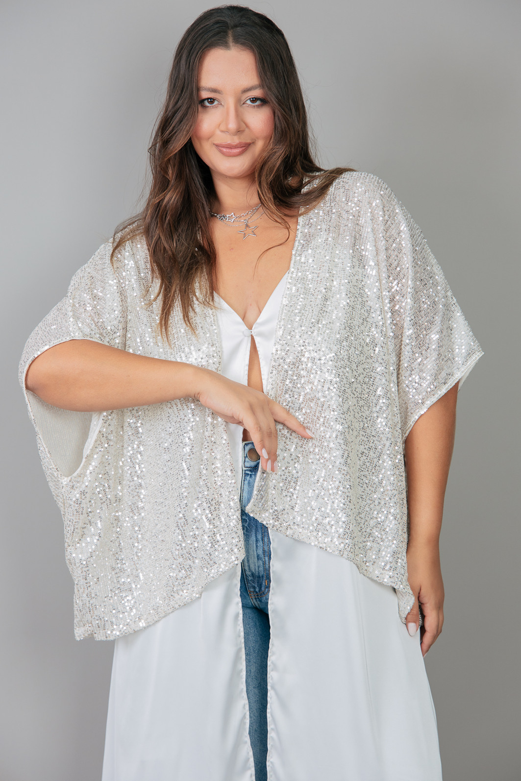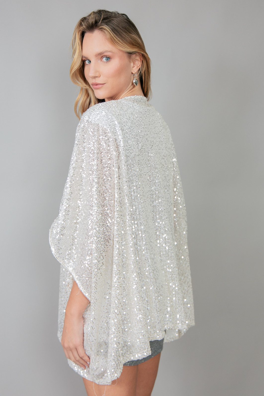 Aquela terceira peça indispensável para brilhar muito! Kimono em tecido base de tule nude com paetês prata. Modelagem bem quadradona e ampla.