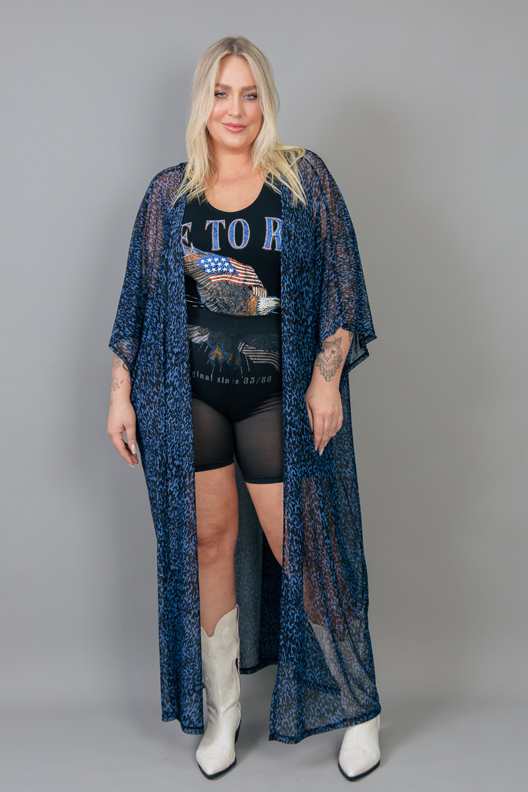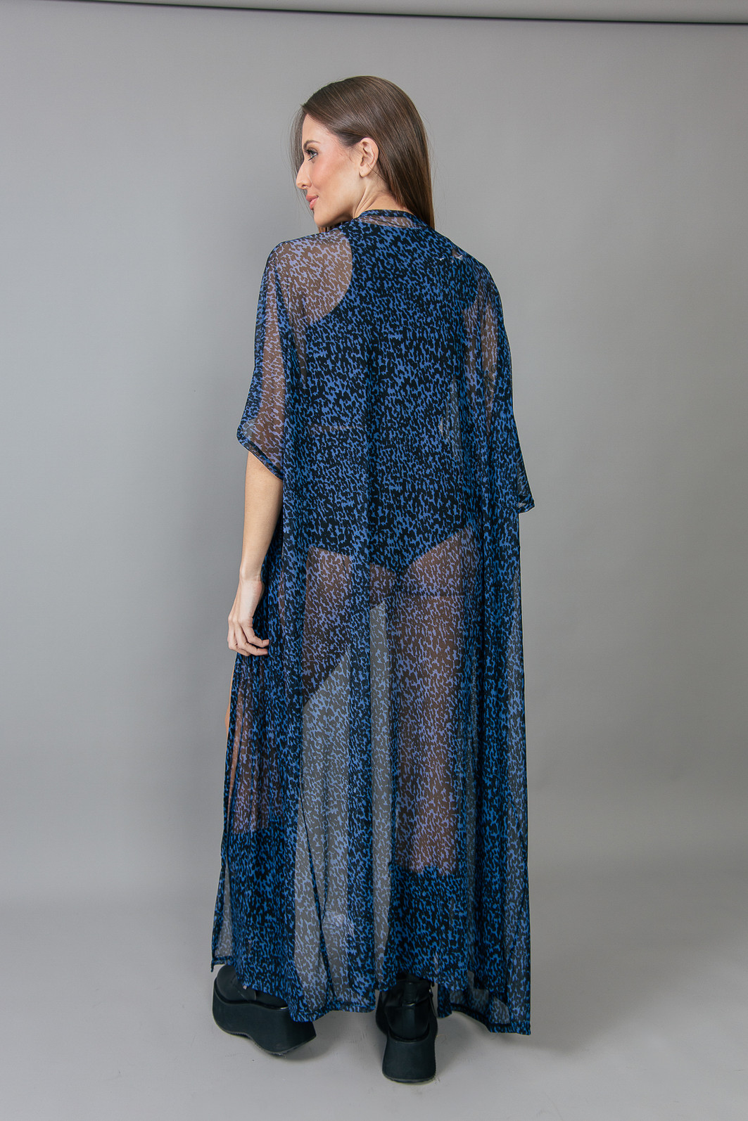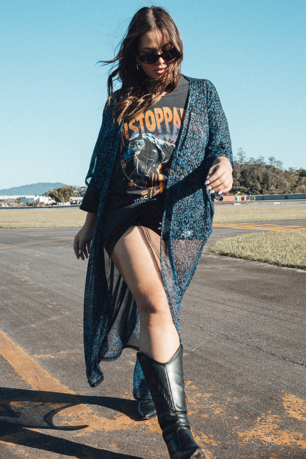 Aquela peça super estilosa que levanta qualquer look! Kimono todo em tule estampado de oncinha em tons de azul e preto. Peça ampla e leve.